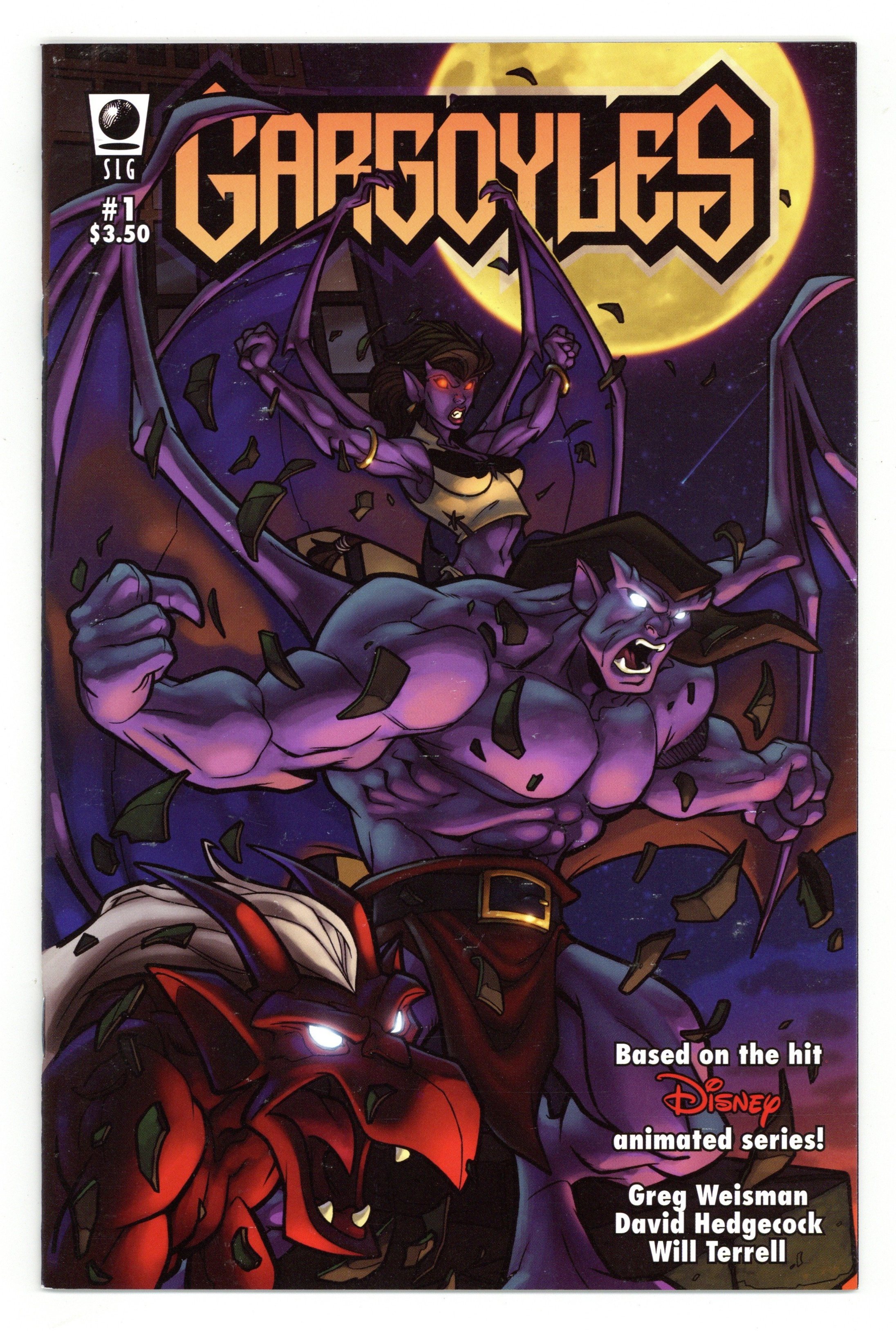 By Greg Weisman & David Hedgecock. If you've missed Goliath, Demona, Brooklyn, Xanatos, and the rest, check out this comic based on the popular Disney/Buena Vista animated television series of the 90s! Stone by day, warriors by night, the Gargoyles were betrayed by those they had sworn to protect. Now here in modern Manhattan, the spell that held them frozen for a thousand years is broken, and the Gargoyles live again! 24pgs, FC. Cover price $3.50.