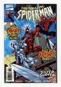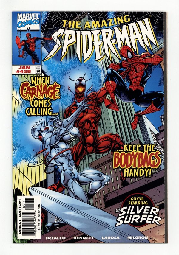 Direct Edition. Cover pencils by Tom Lyle, inks by Bud LaRosa. Carnage and the Silver Surfer guest star in "Savage Rebirth!", script by Tom DeFalco, pencils by Joe Bennett, inks by Bud LaRosa; Spider-Man rejoices that the Avengers have been confirmed to be alive; He begins dealing with the one million dollar reward the Bugle has on him; He heads toward the Baxter Building to visit the Fantastic Four, only to remember that the Thunder Bolts recently purchased the building; Peter agrees to quit being Spider-Man, as Mary meets up with Jill; Dr. Ashley Kafka, the new director of the Ravencroft Institute wants to shut down the microwave field holding back Cletus Kasady in order to cut costs. Cameos by Captain America, Iron Man, and the Vision. 38 pgs., full color. $1.99. Cover price $1.99.