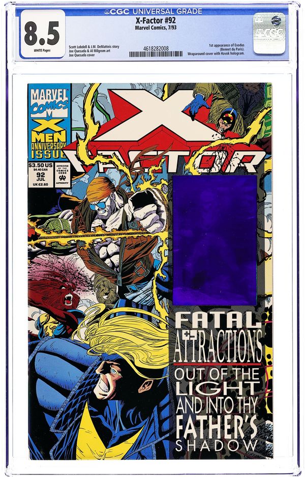 Direct Edition. Story by Scott Lobdell, Joe Quasada, and J.M. DeMatteis. Art by Joe Quesada and Al Milgrom. Wraparound Cover. Fatal Attractions! "The Man Who Wasn't...!" 1st appearance of Exodus. When the Acolytes of Magneto begin slaughtering humans indiscriminately it's up to X-Factor to stop them. Story continues in X-Force #25. NOTE: This issue has a hologram card of Havok on the front cover. 68 pages. Cover price $3.50.