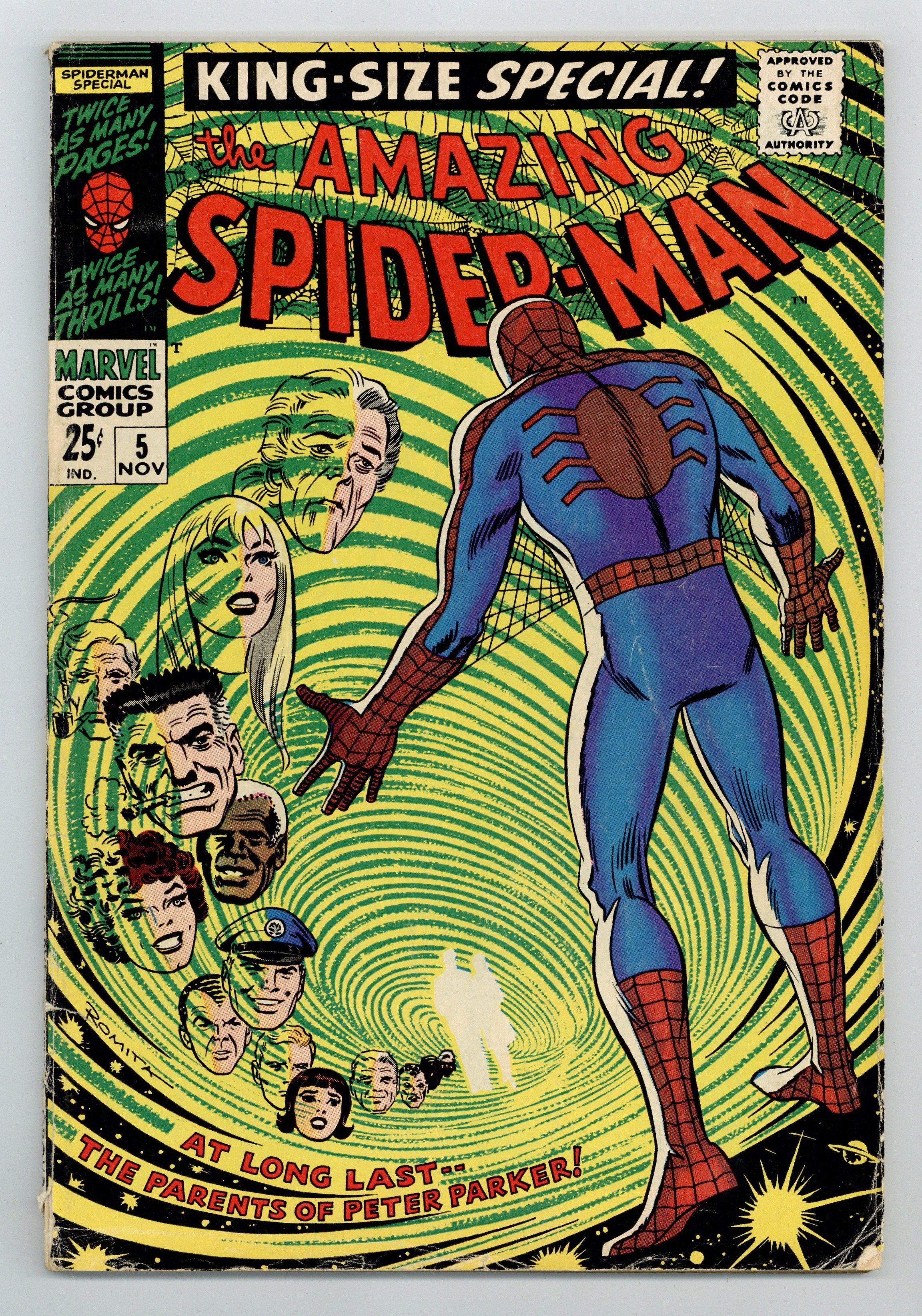 First printing and first appearances of Richard Parker and Mary Parker in an all-new 40-page story "The Parents of Peter Parker!" Script by Stan Lee. Pencils by Larry Lieber. Inks by Mike Esposito (aka Mickey Demeo). Consulting by John Romita (layouts). Cover by John Romita. While moving an old trunk in his Aunt's house, Peter finds pictures and newspaper clippings of his deceased parents. Apparently they were considered traitors by the U.S. government before their deaths in a plane crash in Algeria almost two decades ago. After Aunt May provides a few more details, Peter vows to uncover the truth about his parents! To that end the web-slinger links up with the Fantastic Four and flies to North Africa! In the middle of the Kasbah, the Amazing Spider-Man finally comes face-to-face with the man who framed his parents: the sinister Red Skull! Wow, can the wall-crawler exonerate his parents and change his family legacy forever? Or will the spectacular son meet the same fate as his father...at the hands of the Red Skull? A terrific story! Cameo appearances by the Human Torch, Mr. Fantastic, and the Thing. Flashback cameo by Ben Parker. (Notes: This story features the second Red Skull (aka Albert Malik). He appears many years later in Solo Avengers 6 and Captain America 347.) First backup feature: "A Day at the Daily Bugle" One-page illustration of the Daily Bugle newsroom with J. Jonah Jameson, Joe Robertson, Ned Leeds, and Betty Brant. Script by Stan Lee. Pencils by Larry Lieber. Inks by Mike Esposito. Assists by John Romita. Second backup feature: "Peter Parker, the Super Sports Star!" Two-page illustration of the web-slinger as a baseball player and football player. Third backup feature: "Where It's At" One-page drawing of Spider-Man's usual hangouts. Fourth backup feature: "This is Spidey as We Know Him, But--" Two-page illustration of other publications' characters dressed as Spider-Man. Fifth backup feature: "Here We Go-a-Plotting!" Three-page parody of the Marvel Bullpen starring Stan Lee, Larry Lieber, and John Romita. Script and Pencils by Marie Severin. Inks by Frank Giacoia. (Notes: The inside front cover features selected artwork from the story. The issue includes a full-page ad for Spectacular Spider-Man (1968) Magazine 2. A second printing of this issue was published in 1994 and only available through JC Penney stores. This story was reprinted in Marvel Tales 264 & 265.) 68 pages. 25 cent cover price. Cover price $0.25.