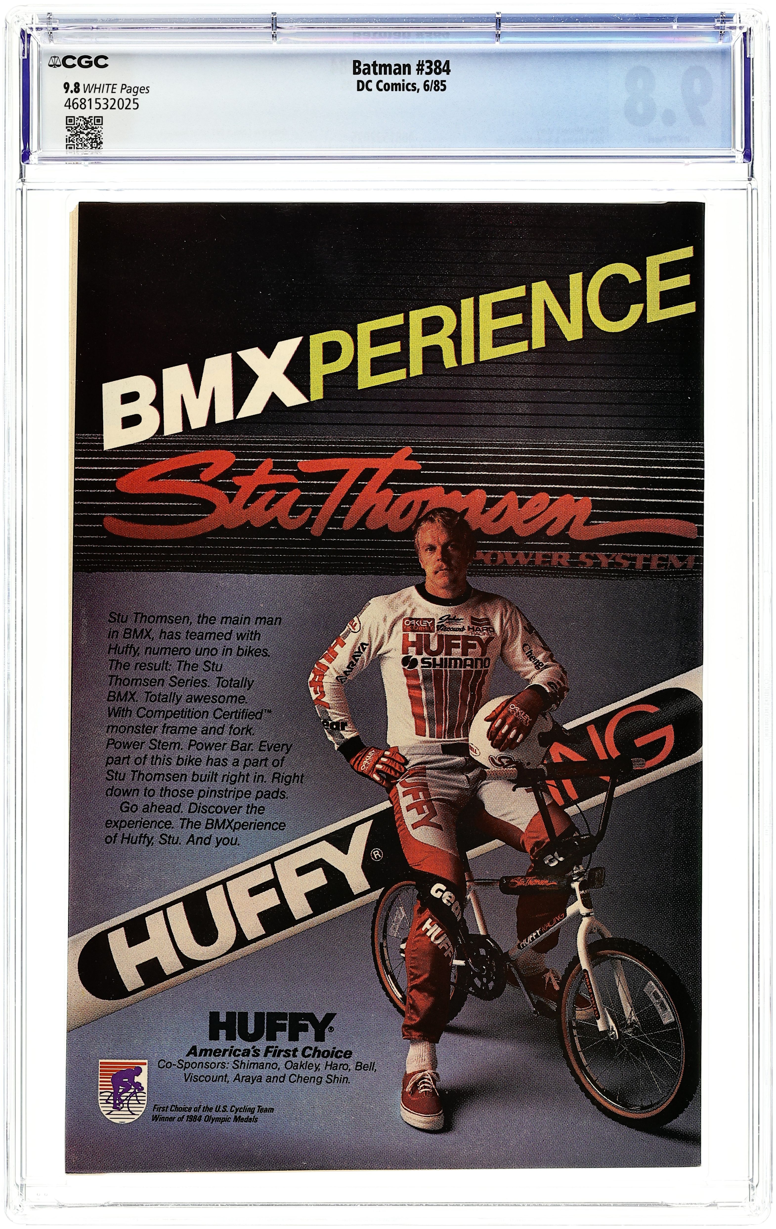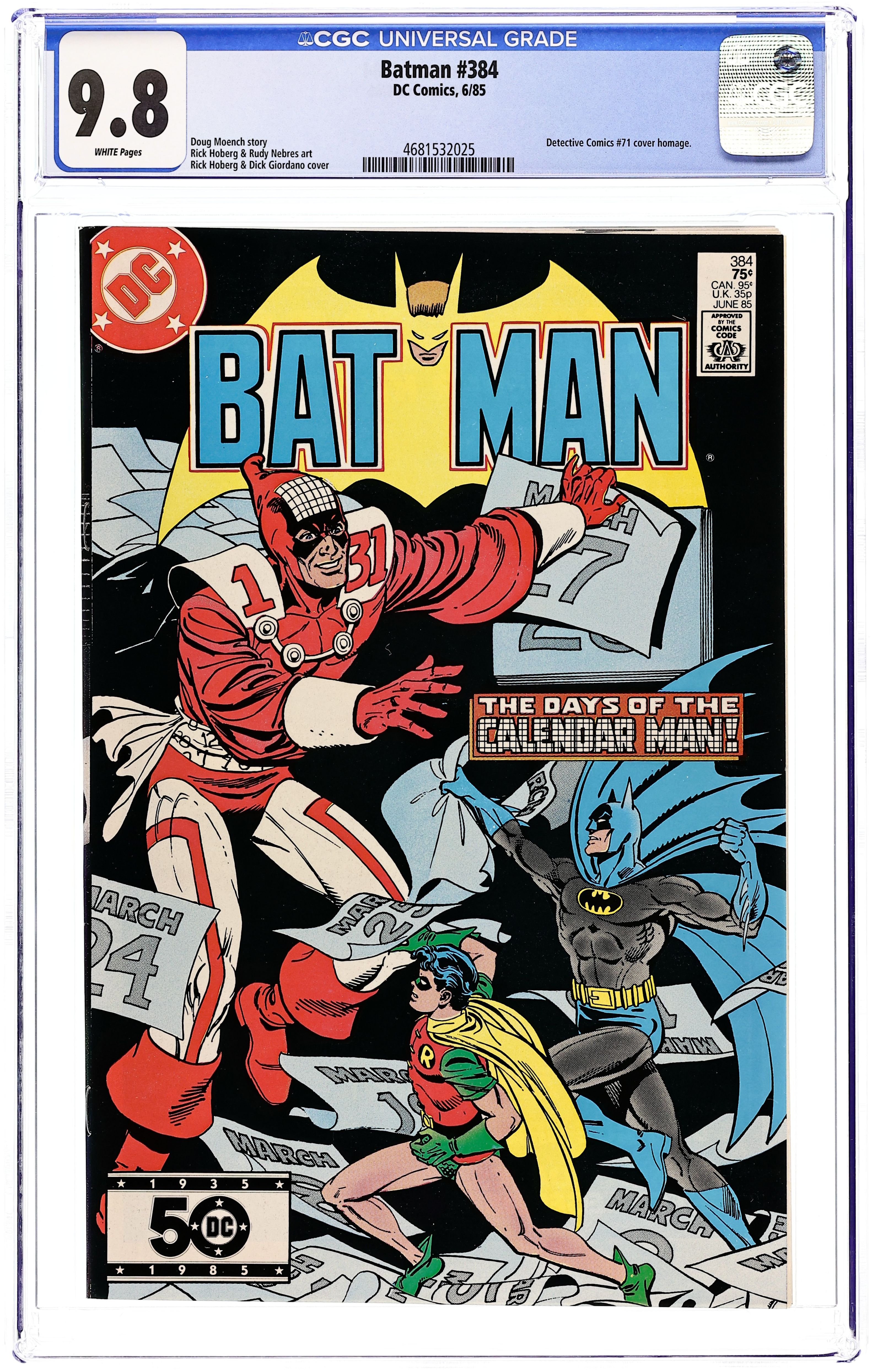 Direct Edition. Cover pencils by Rick Hoberg, inks by Dick Giordano. "Broken Dates," script by Doug Moench, pencils by Rick Hoberg, inks by Rudy Nebres; Dr. Fangs goons believe Batman has to die for them to profit in Gotham; Batman battles Calendar Man; Vicky Vale severs her ties with Bruce Wayne, and Alfred plays match maker. Part 1 of 3, continued in Detective Comics #551. Crisis on Infinite Earths mini-series, two-panel-sequence-cameo with The Monitor (only hands shown with voice) and Lyla (Harbinger). 36 Pages, Full Color. Cover price $0.75.