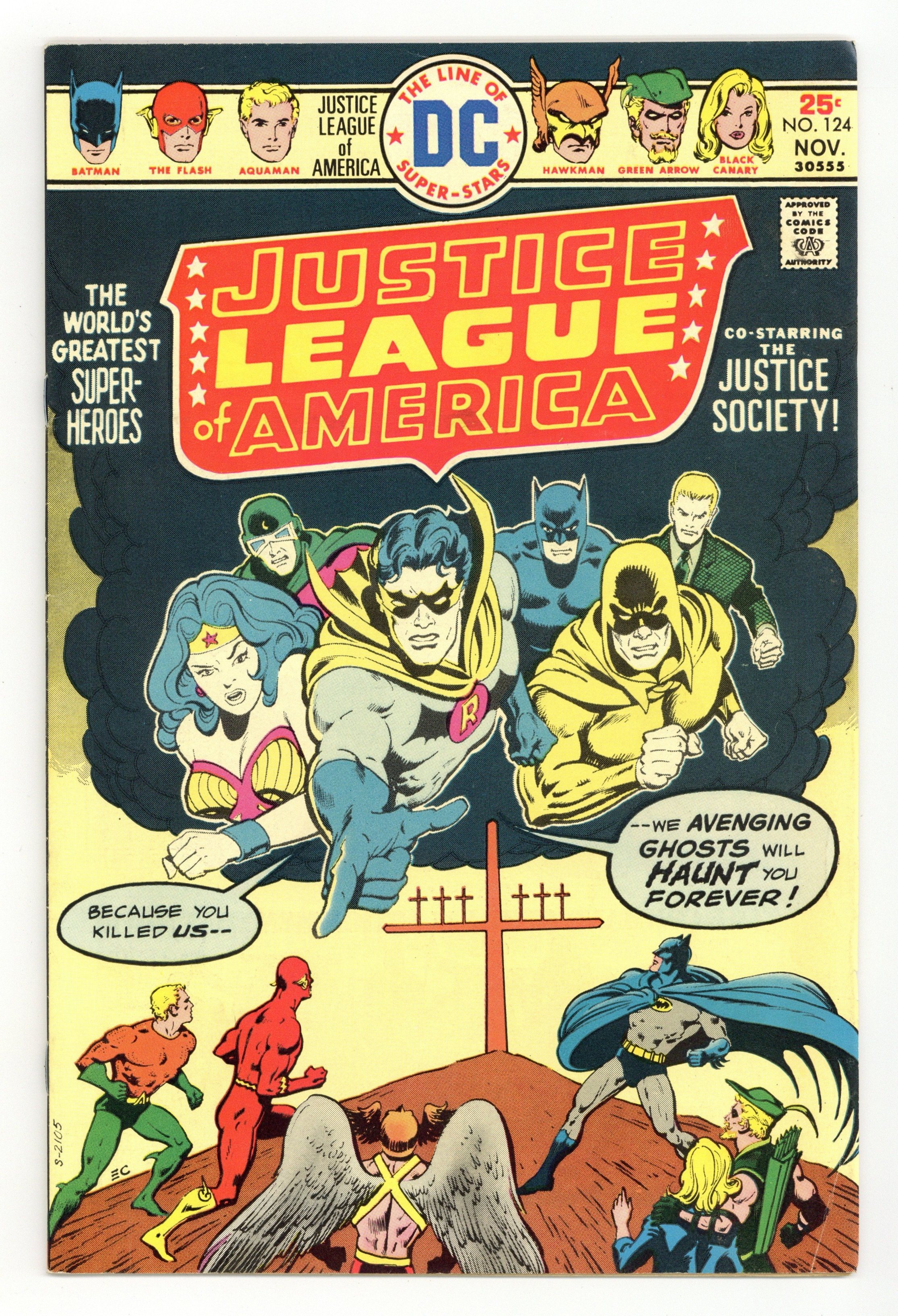 Cover art by Ernie Chan. Avenging Ghosts of the Justice Society!, script by Elliot S! Maggin and Cary Bates, pencils by Dick Dillin, inks by Frank McLaughlin; As the JLA battle both Cary Bates (as a villain brainwashed by the Wizard) and the Injustice Society (IJS), they are slowly defeated due to the subconscious memories of the JLA defeating the JSA earlier (disguised as IJS members); The Spectre saves the day, however when he asks God to restore the JSA to life using his ring of life's powers, which is granted, as well as Maggin egging Bates on to defeat verbally. 32 pgs. $0.25. Cover price $0.25.