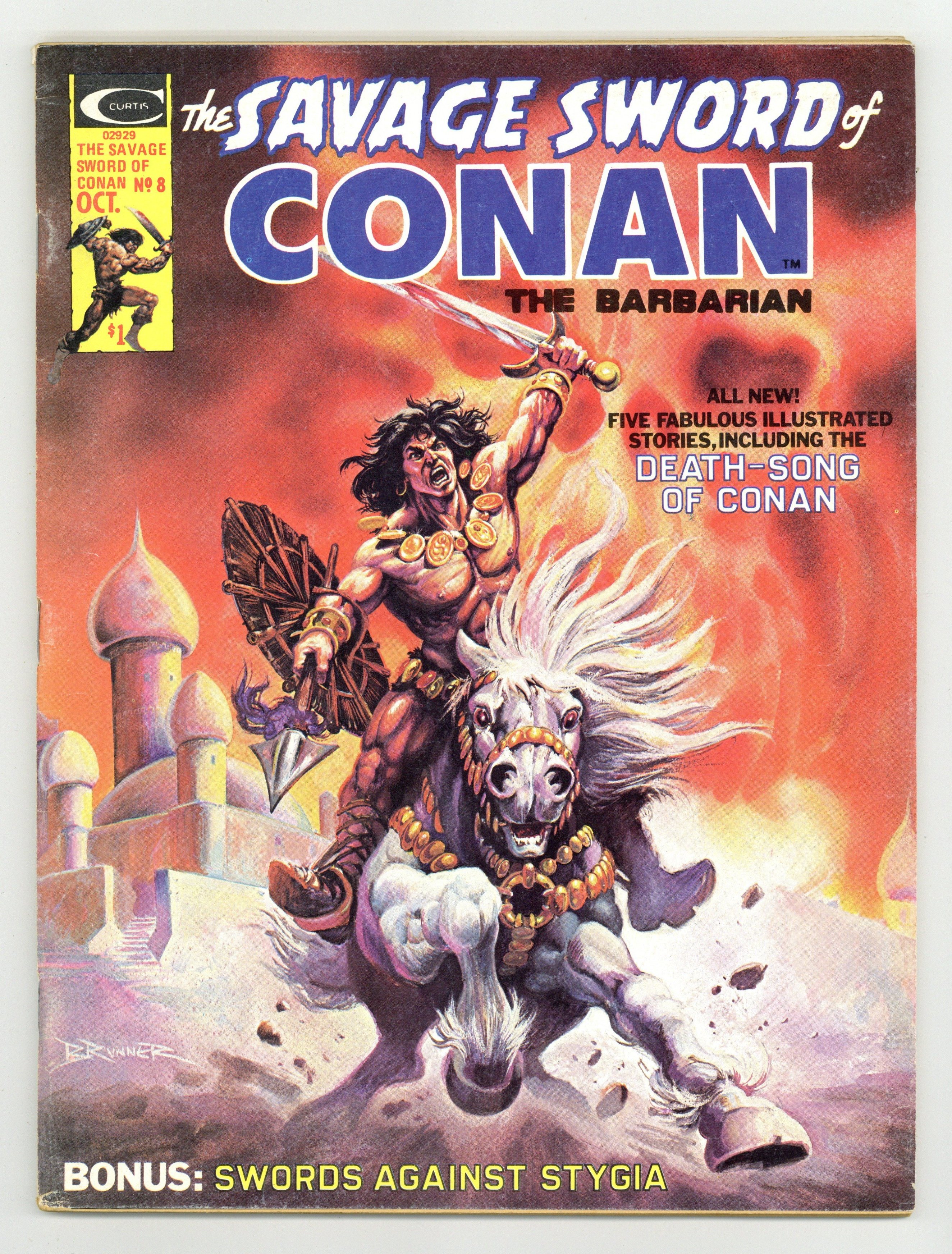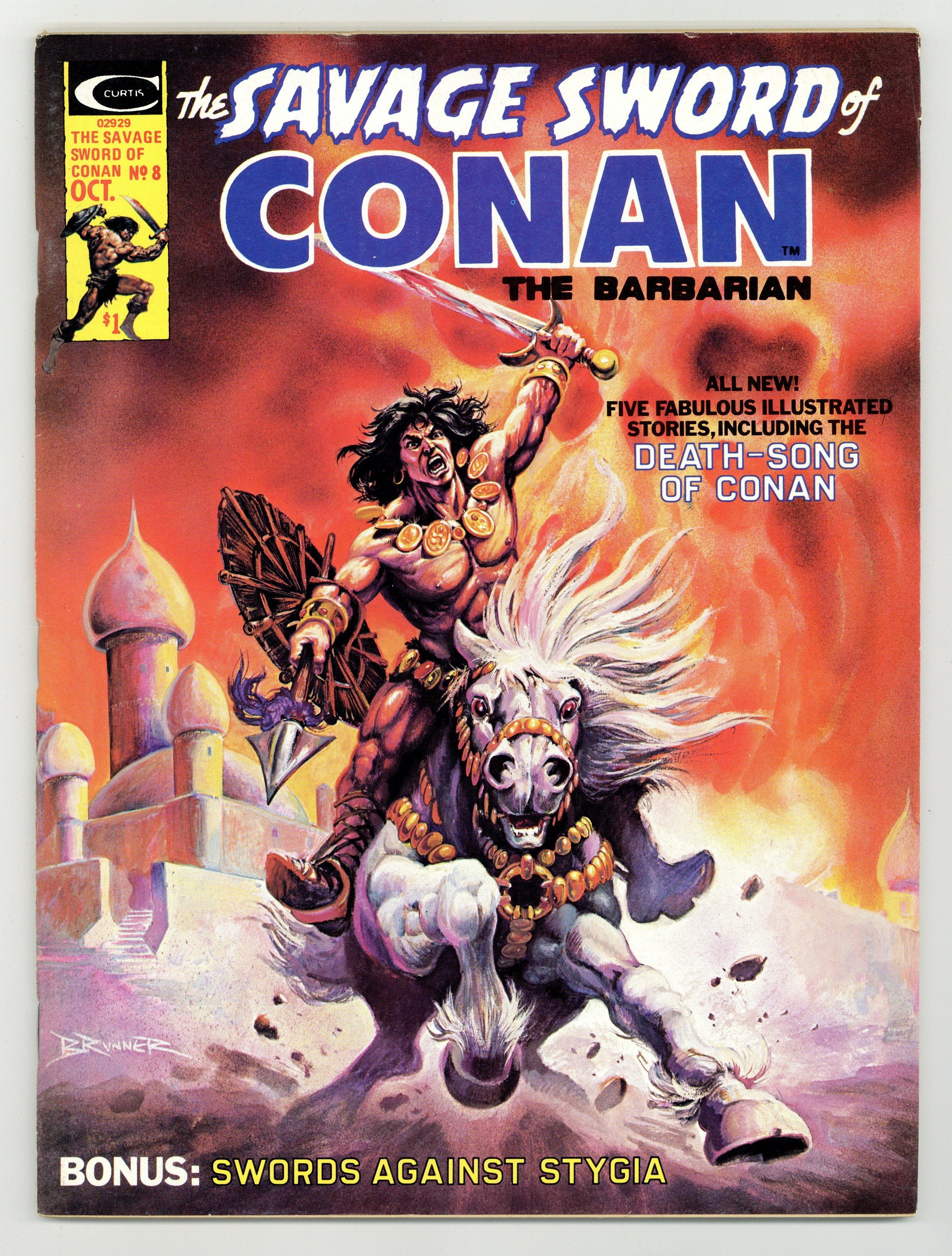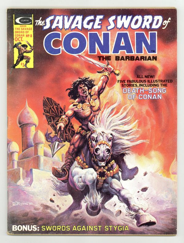 Conan stars in "The Forever Phial." Script by Roy Thomas, art by Tim Conrad. "Death-Song of Conan the Cimmerian." Poem by Lin Carter (adapted by Thomas), art by Jess Jodloman. Conan stars in "Corsairs Against Stygia." Script by Thomas, pencils by Gil Kane, inks by Yong Montano. Adapted from the Robert E. Howard novel "The Hour of the Dragon." Continued from Giant-Size Conan the Barbarian 4. The story concludes in SSOC 10. Also in this issue: "Sorcerer's Summit." Script and art by Bruce Jones. The Hyborian Age (part 2): "The Rise of the Hyborians." Script by Thomas, art by Walt Simonson. Adapted from the essay by Robert E. Howard. "The Elder Gods." Article by Robert Yaple with a full-page illustration by Tim Conrad (?). Tony DeZuniga frontispiece. Frank Brunner cover.