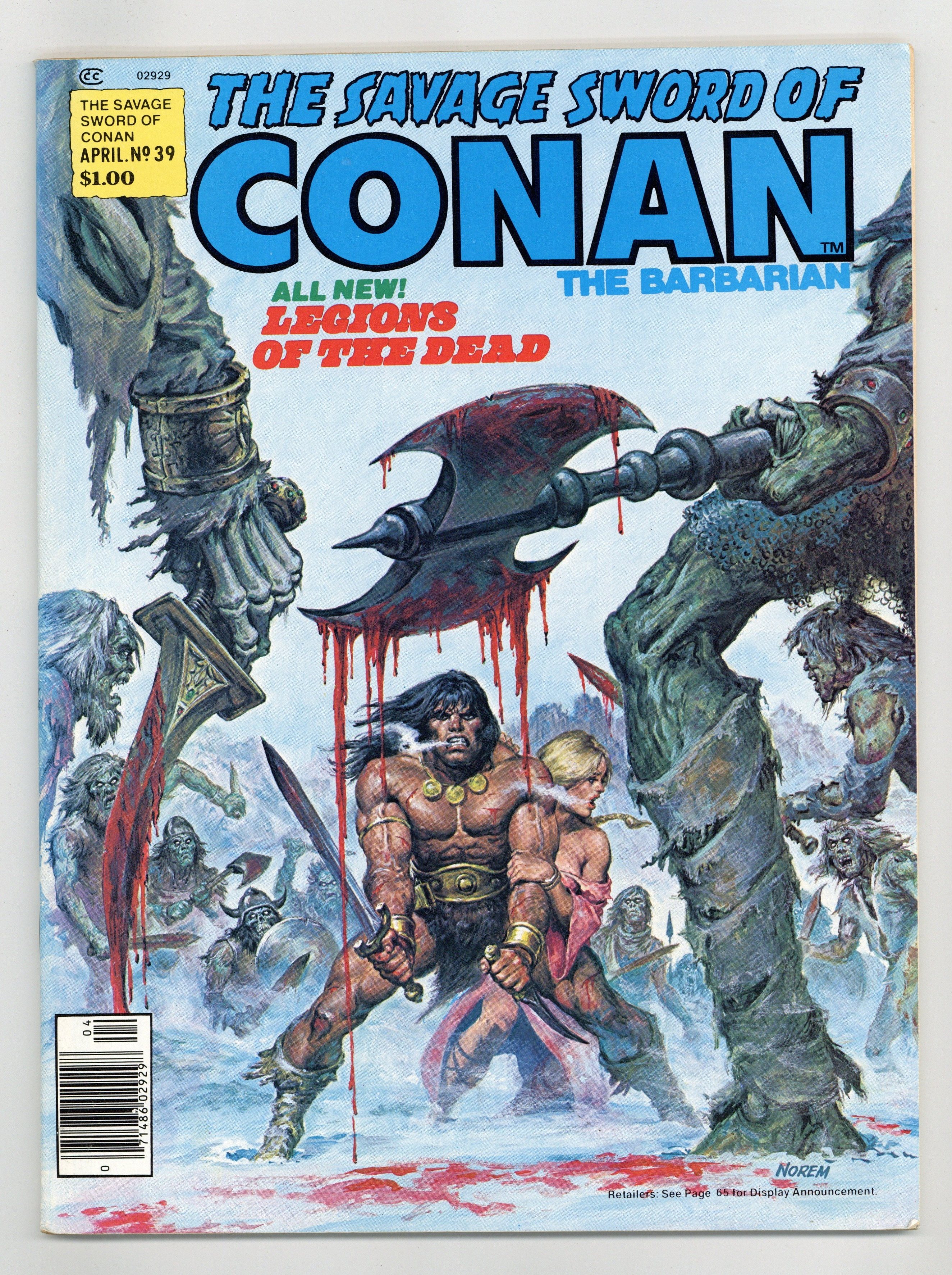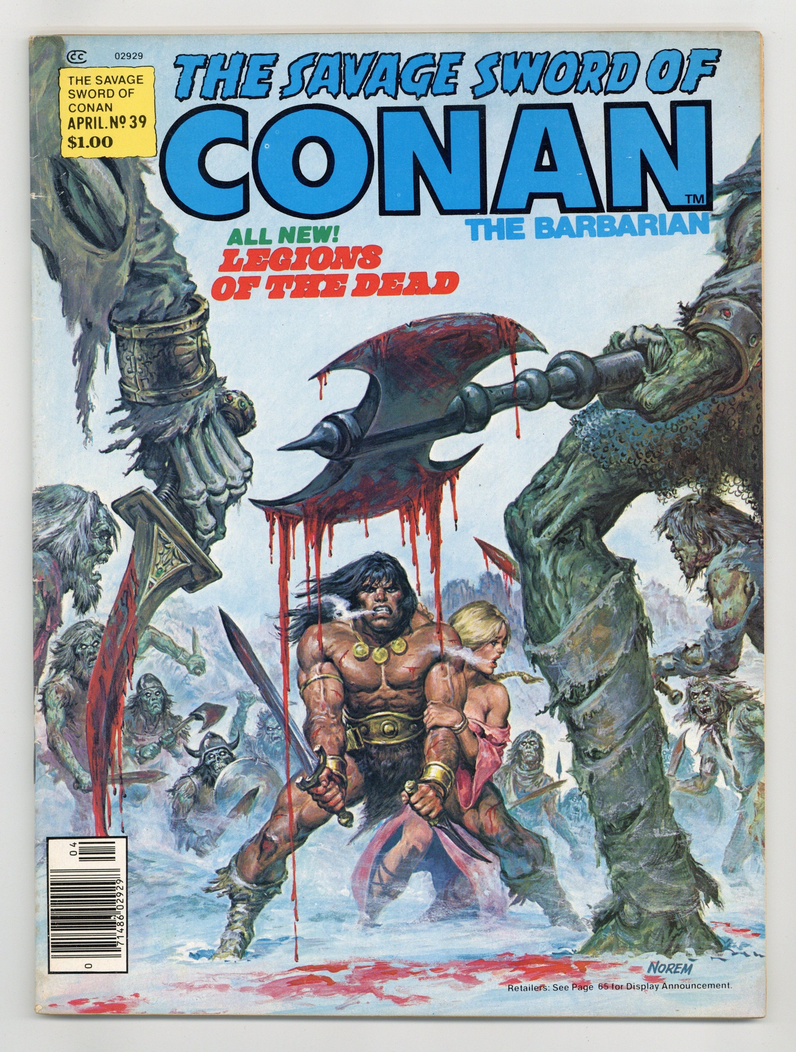 $10.25Conan stars in "The Legions of the Dead." Script by Roy Thomas, pencils by Sal Buscema, inks by Tony DeZuniga. Adapted from the story by L. Sprague de Camp and Lin Carter. Solomon Kane stars in "Moon of Skulls" (part 3), script by Don Glut, art by David Wenzel. Adapted from the story by Robert E. Howard. Nicastre/Wenzel illustration. Rudy Nebres portfolio (Conan twice, Solomon Kane, King Kull, and Red Sonja). "A Gazetteer of the Hyborian World of Conan" (part 7) by Lee Falconer. DeZuniga frontispiece. Earl Norem cover. Cover price $1.00.