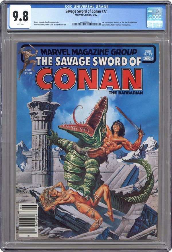 Conan stars in "The Cave Dwellers." Plot and pencils by John Buscema, script by Michael Fleisher, inks by Ernie Chan. Valeria stars in "Islands of Pirates' Doom" (part 4). Script by Roy Thomas, pencils by Buscema, inks by Danny Bulanadi. Tanya the Fox stars in "Through a Glass Darkly." Script by Bruce Jones, art by Joe Chiodo. Three photos from the Conan movie. Pablo Marcos frontispiece. oe Jusko cover. Cover price $1.50.