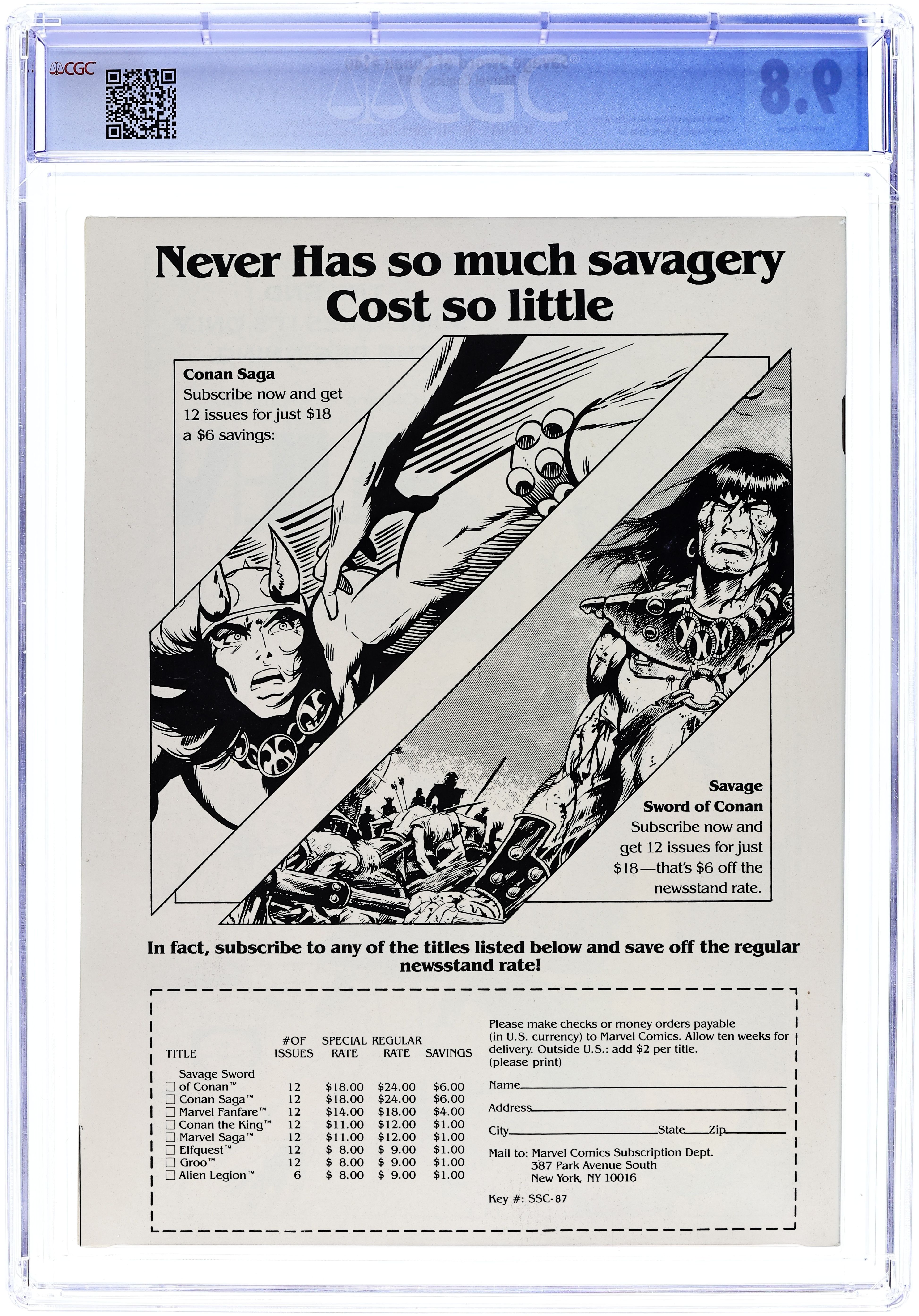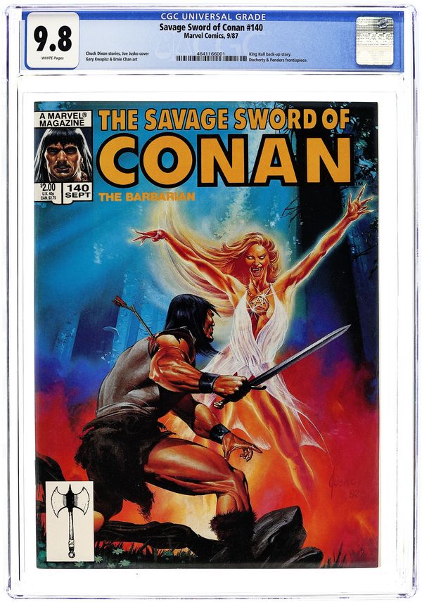 Conan stars in "The Girl of the Haunted Wood." Script by Charles Dixon, pencils by Gary Kwapisz, inks by Ernie Chan. King Kull stars in "Nightmare." Script by Dixon, art by Vince Waller. Tony Salmons pin-up. Mike Docherty/Ken Penders frontispiece and pin-up. Joe Jusko cover. Cover price $2.00.
