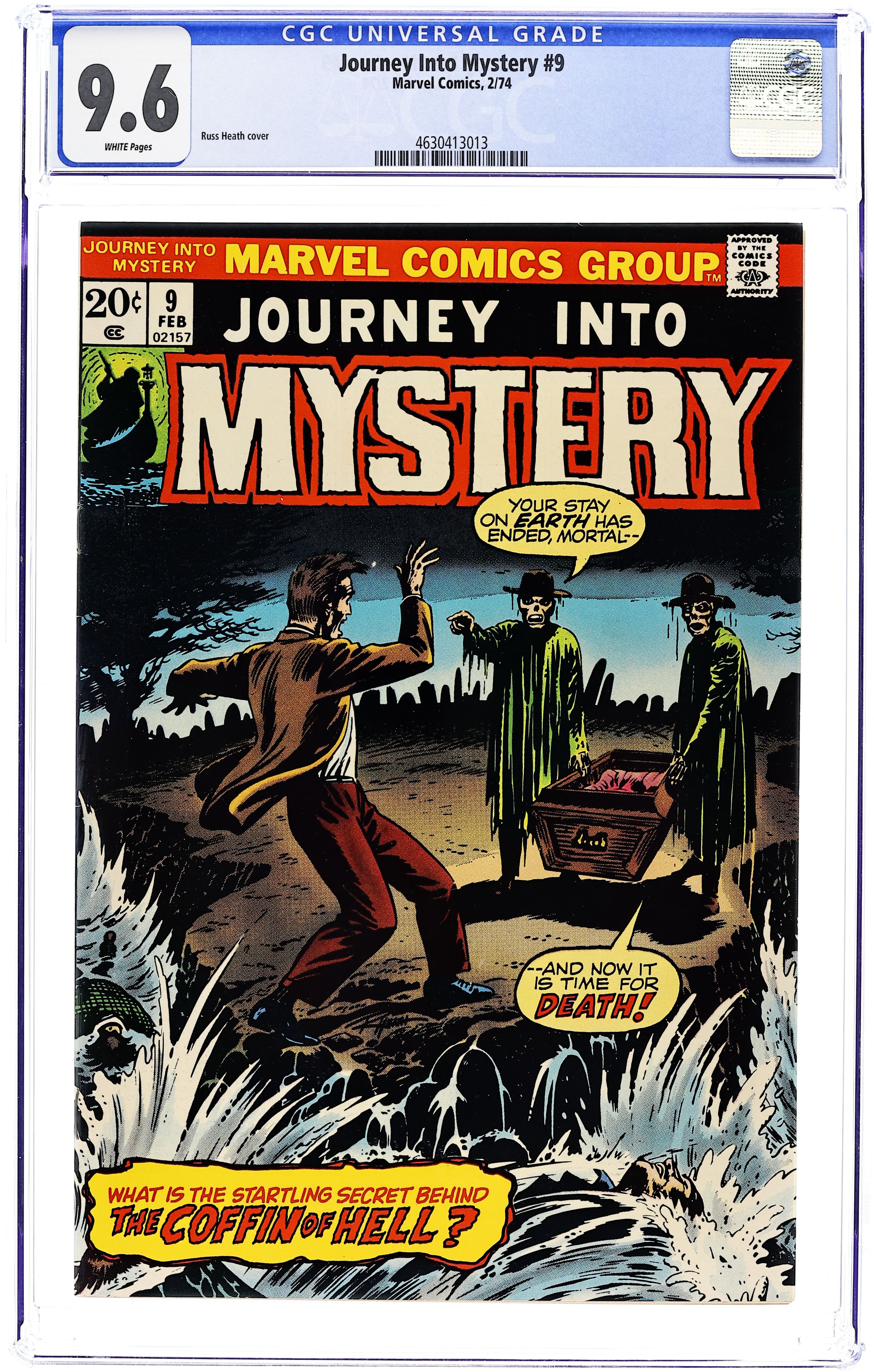 Cover by Russ Heath. Coffin of Hell!; The Communists of East Germany are baffled by the murders of several of their agents. I Can Hear You Think!, script by Paul S. Newman, art by Vic Carrabotta; After the first atomic bomb explodes children are born with the ability to read minds, which the government put to use as a tactical defense against the Communists. The New Tenants, art by Bill Everett ; A man works for a miser who cheats people on real estate deals until he gets so fed up with his boss selling run down dumps to kindly old folks that he kills him and shores up the floor support in the cellar with the man's body. Wilson's Woman, art by Doug Wildey; A scientist moves into a small town that proves his undoing when he builds a robot for a mate and the townspeople suspect that he has hypnotized the beautiful woman into remaining with the homely man. 36 pgs., full color. $0.20. Cover price $0.20.