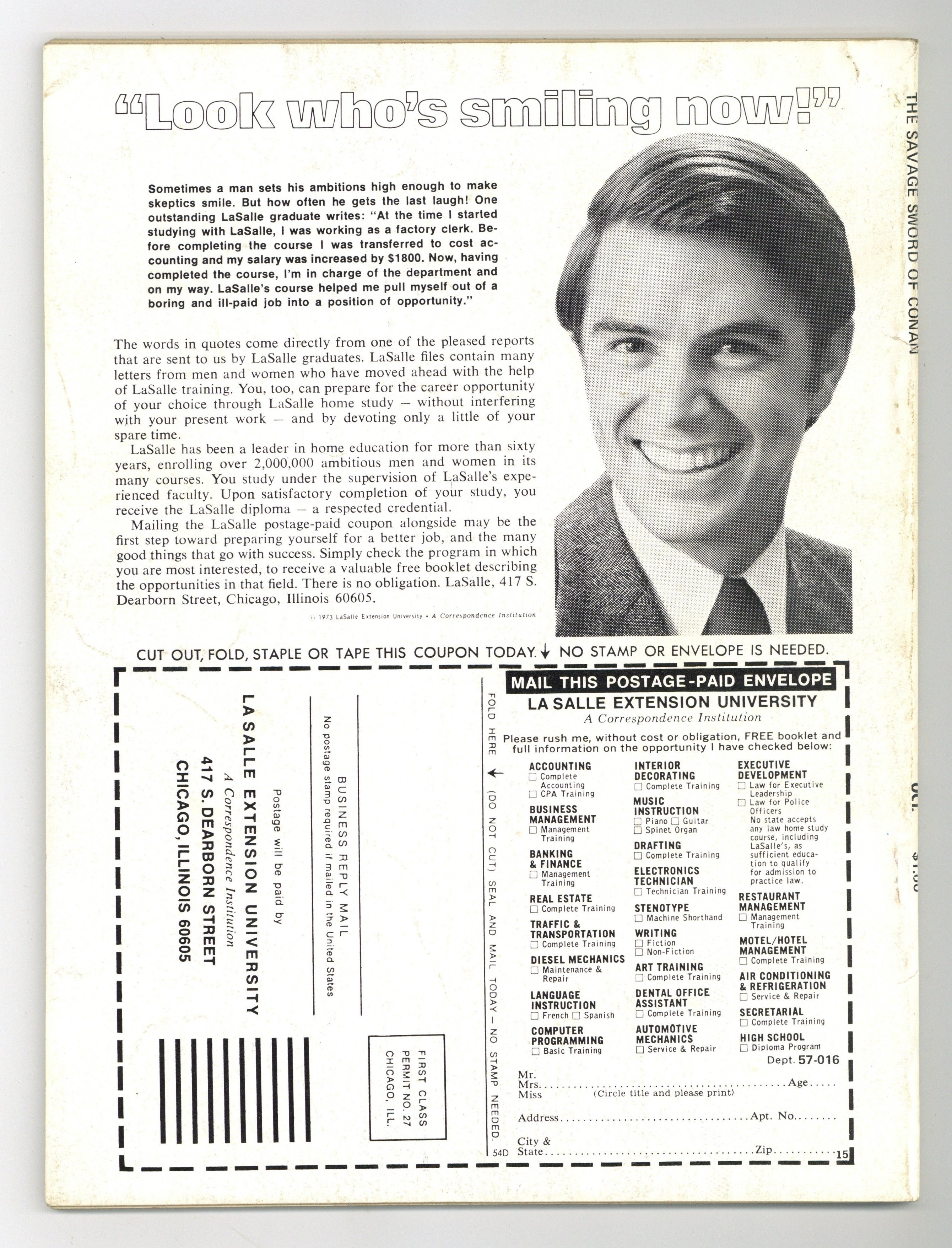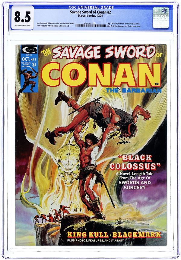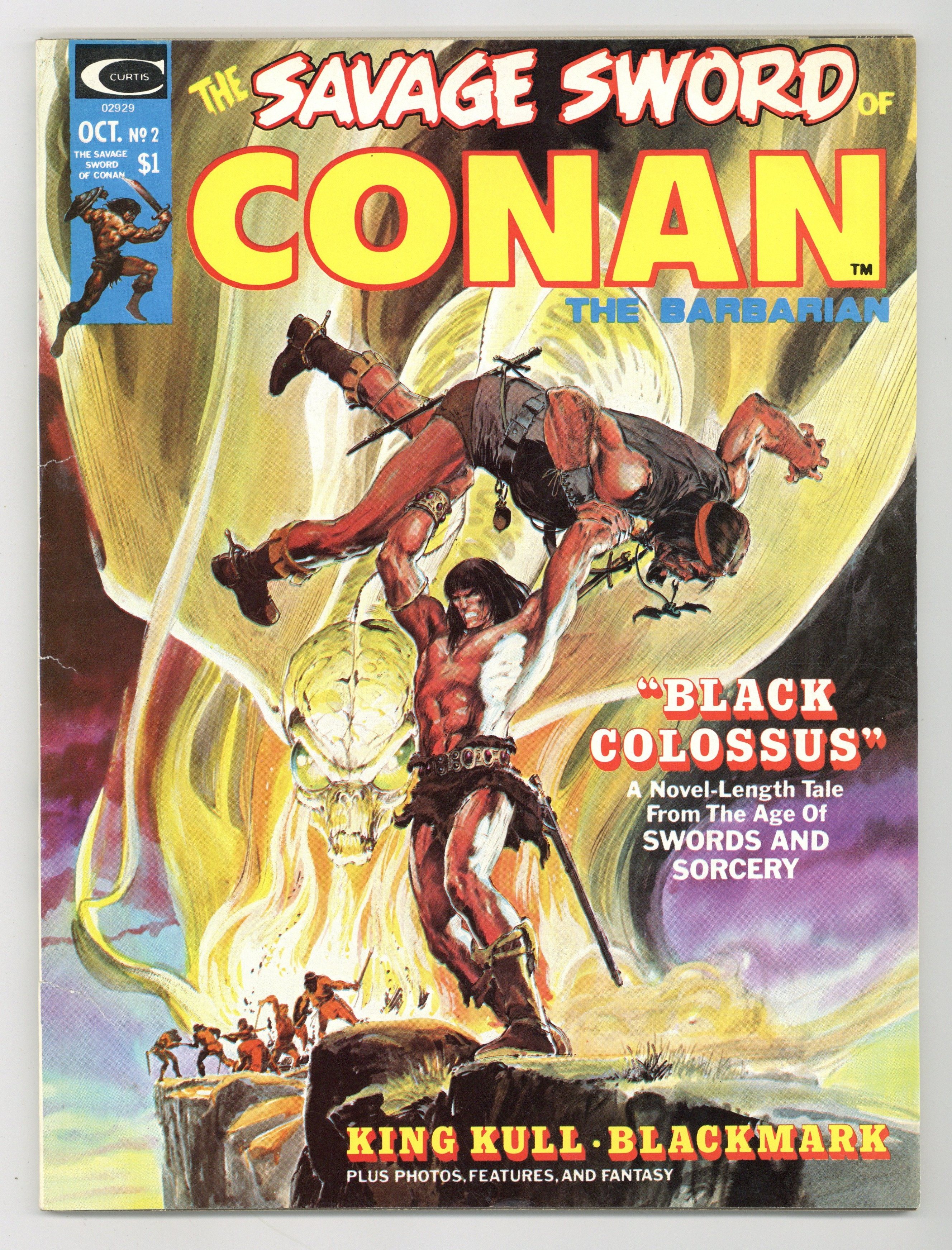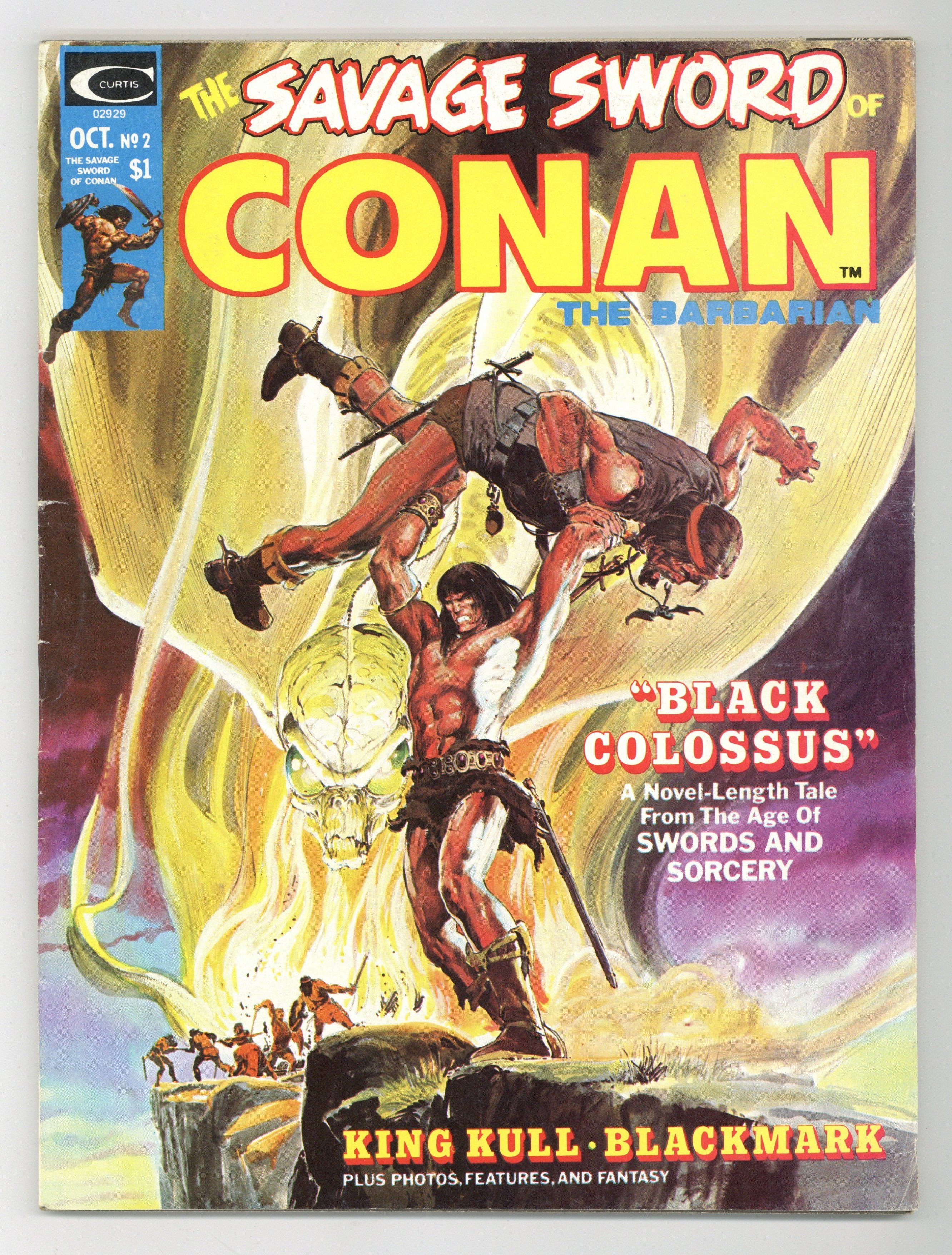 Conan stars in "Black Colossus." Script by Roy Thomas, pencils by John Buscema, inks by Alfredo Alcala. Adapted from the story by Robert E. Howard. Also in this issue: "Blackmark," script and art by Gil Kane (reprinting chapter 2 from the Bantam Books paperback); a King Kull/Brule story, "The Beast From the Abyss," script by Steve Englehart, pencils by Howard Chaykin, inks by the Crusty Bunkers (Neal Adams, Russ Heath, and others, probably including Dick Giordano, Ralph Reese, and Alan Weiss); and "Chronicles of the Sword," an article by Lin Carter with illustrations by Alan Weiss, Al Milgrom, and Joe Staton. Letter to the editor from comic writer Ralph Macchio. (Letters page illustrations include Gil Kane/Adams and Barry Windsor-Smith reprinted panels). Mike Zeck frontispiece. Neal Adams cover. Cover price $1.00.