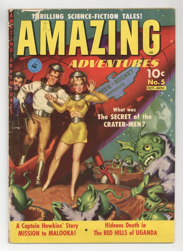 Painted cover by Allen Anderson. Stories and art by Murphy Anderson, Don Perlin, and Al Carreno. Sci-fi and fantasy from Ziff-Davis, edited by the legendary co-creator of Superman, Jerry Siegel. Marta and Frank venture into the African jungles to find her father, and unleash the residents of a gigantic anthill. Captain Martin Hawkins has Star Trek-like adventures and drama in space, in a story with art by comics legend Murphy Anderson. Plus a one-pager with early art by future Marvel legend Don Perlin. Fun painted cover by Allen Anderson has all the requisite elements of a Golden Age sci-fi cover. Martin Hawkins: Mission to Malooka; The Secret of the Crater-Men; Rockets Are Old Stuff!; Cosmic Creeps; What the Atom Can Do for Peace!; The Red Hills of Uganda; Yuff-Yuff. 32 pages, Full Color. Cover price $0.10.
