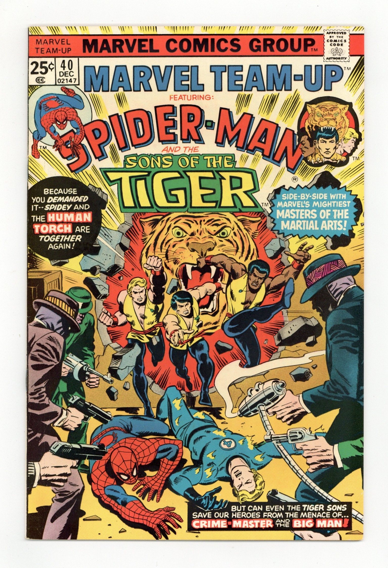Tags: Martial Arts, Spider-Man$9.10"Murder's Better The Second Time Around!" Part 2 of 2. Guest-starring Spider-Man, the Human Torch, and the Sons of the Tiger (1st full-color appearance). Script by Bill Mantlo. Pencils by Sal Buscema. Inks by Mike Esposito and Dave Hunt. Cover by Sal Buscema and Mike Esposito. It's a wild free-for-all in an abandoned warehouse as Spider-Man and the Human Torch duke it out with the Big Man, Crime Master, Sandman, and the Enforcers! However, the two heroes are badly outnumbered and go down to defeat! Fortunately though, a group of martial artists is training nearby and stumble across the captive torch and wall-crawler! Now the odds suddenly look better as the Sons of the Tiger join the fray! During the furious final battle, friendships will be formed, mysteries will be solved, and tragedy will strike! (Notes: The Sons of the Tiger appear next in Deadly Hands of Kung Fu 19. This issue contains a full-page ad for Hostess Fruit Pies featuring the Hulk vs. the Abomination and Wendigo.) 36 pages. Cover price $0.25.