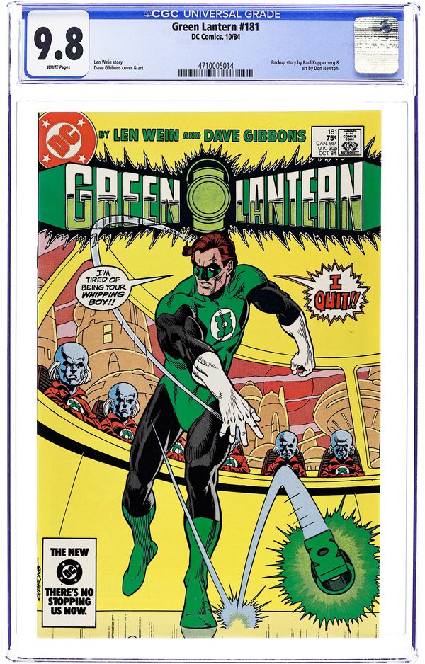 "Take This Job and Shove It." Hal "Green Lantern" Jordan turns in his ring. Meanwhile, the Predator kills Jason Bloch. Script by Len Wein, pencils by Dave Gibbons, inks by Mark Farmer. "One Night in a Bar on Lawrel-Hardee XI." Ch'p encounters space pirates in a bar on an alien world in this Tales of the Green Lantern Corps backup story. Script by Paul Kupperberg, art by Don Newton. Cover by Gibbons. Cover price $0.75.