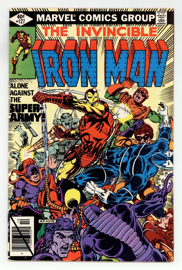 Direct Edition. "A Man's Home is His Battlefield!" Part 5 of 5. Plot by David Michelinie and Bob Layton. Script by David Michelinie. Art by John Romita Jr. (breakdowns) and Bob Layton (finishes). Cover by Bob Layton. The Invincible Iron Man goes for broke against Justin Hammer's super-army! No less than 12 super-villains challenge the might of the armored avenger in the middle of the Mediterranean Sea! Can Shell-Head fight his way through his deadliest foes and draw to a close the most explosive Iron Man tale ever? Appearances by Jim Rhodes, Bethany Cabe, Jarvis, Ed Koch, the Blizzard, Beetle, Constrictor, Discus, Leap-Frog, Man-Killer, Melter, Porcupine, Spymaster, Stiletto, Water Wizard, and Whiplash. (Note: Justin Hammer returns in Iron Man 141.) 32 pages. Cover price $0.40.