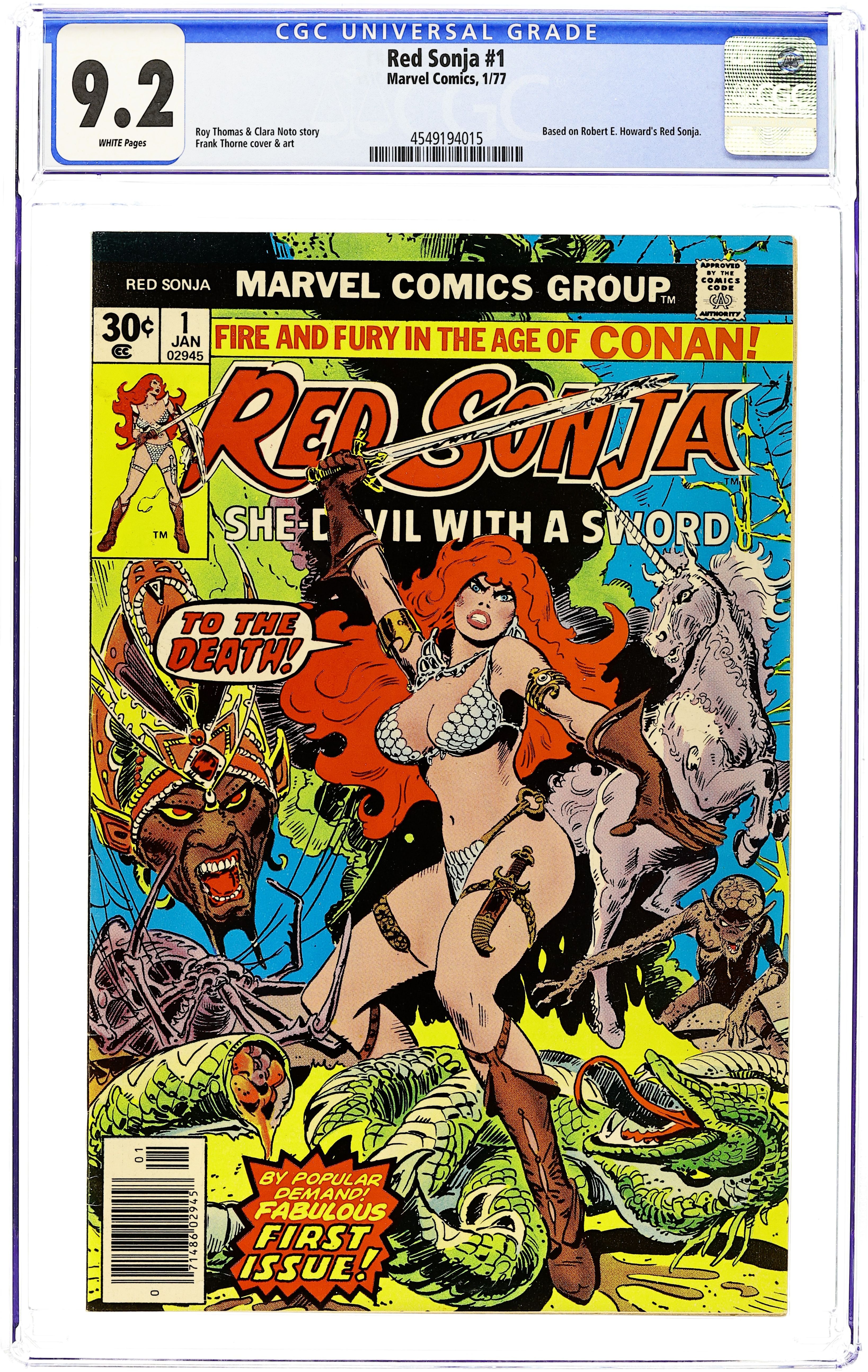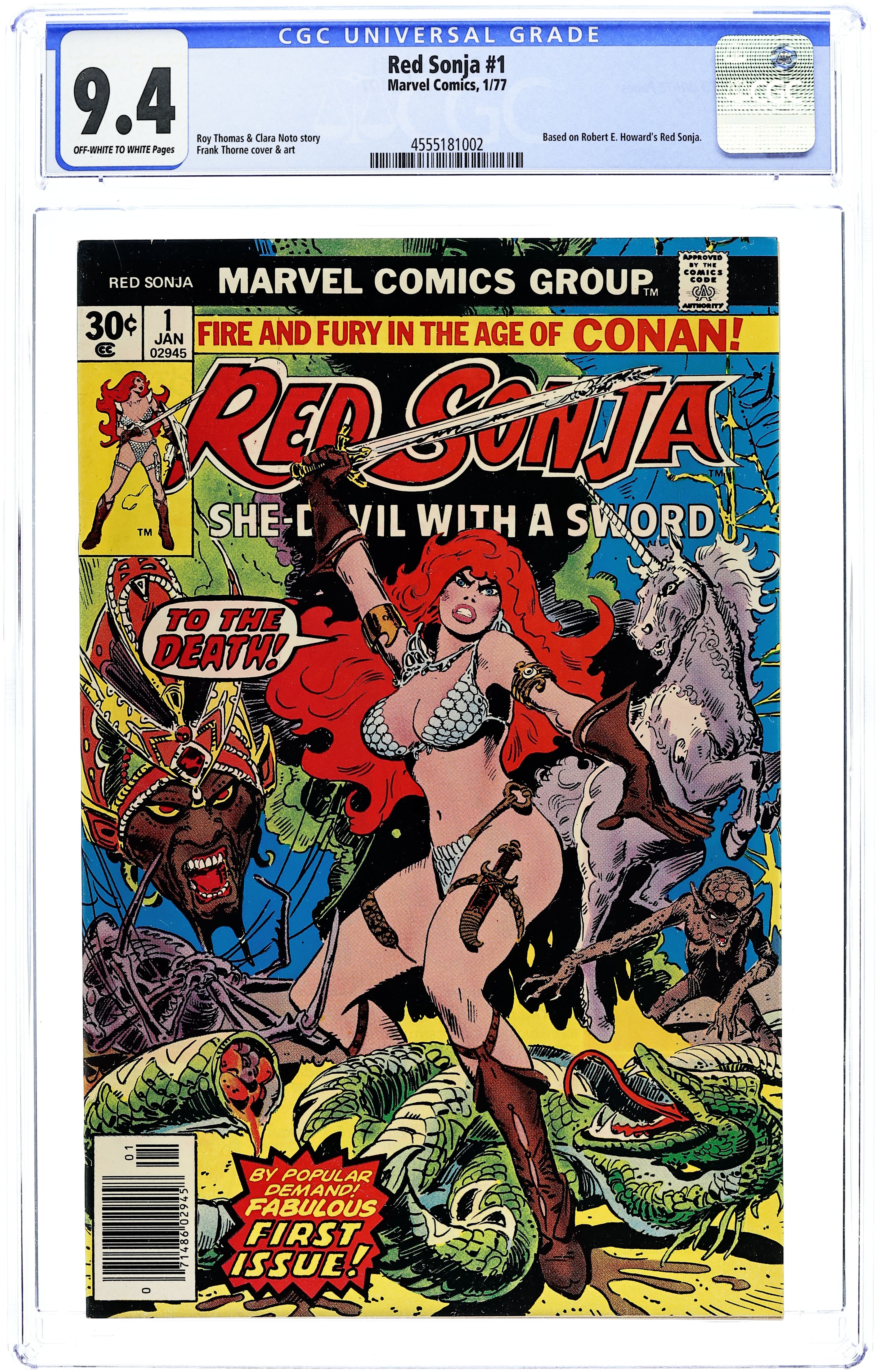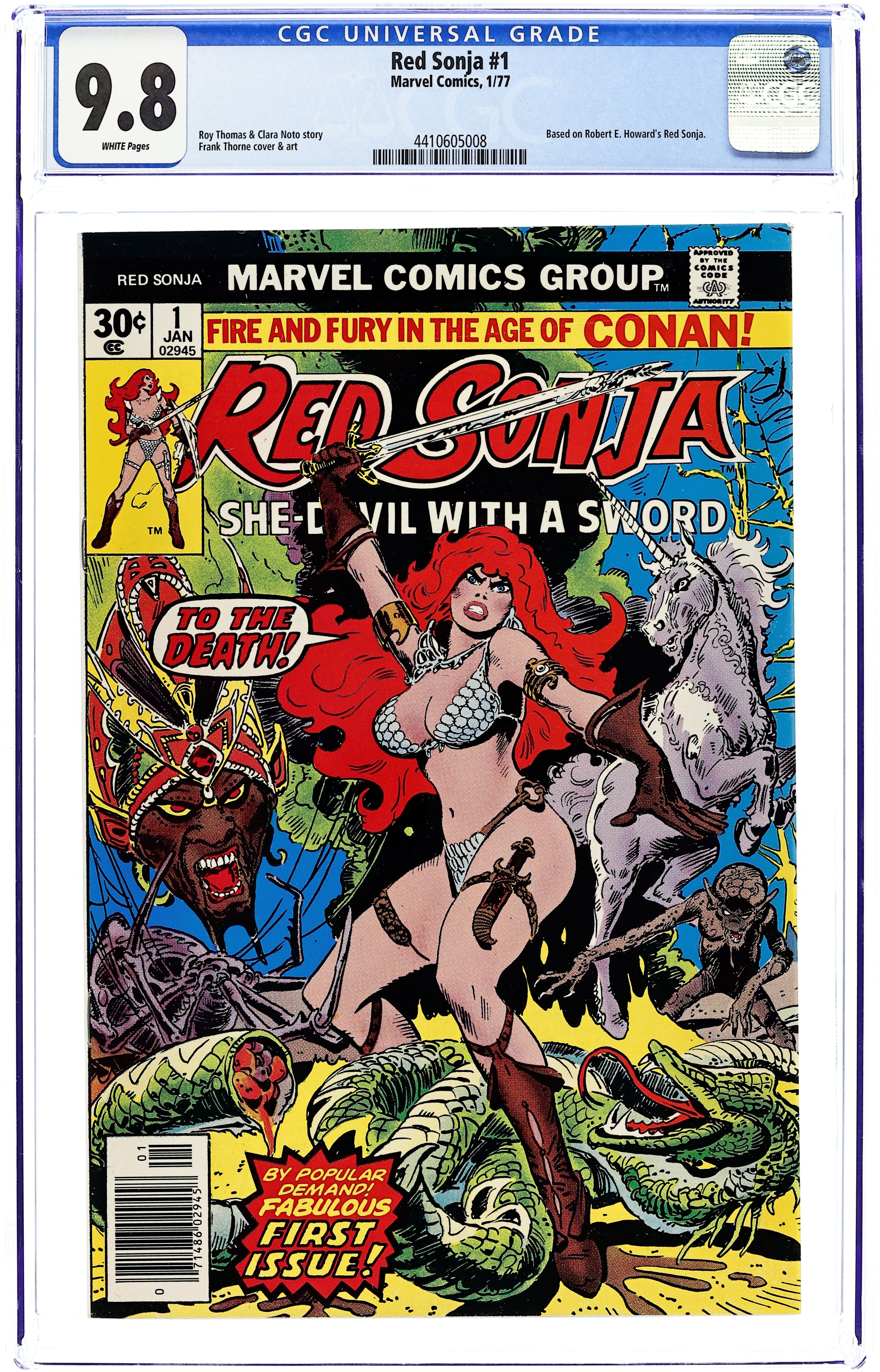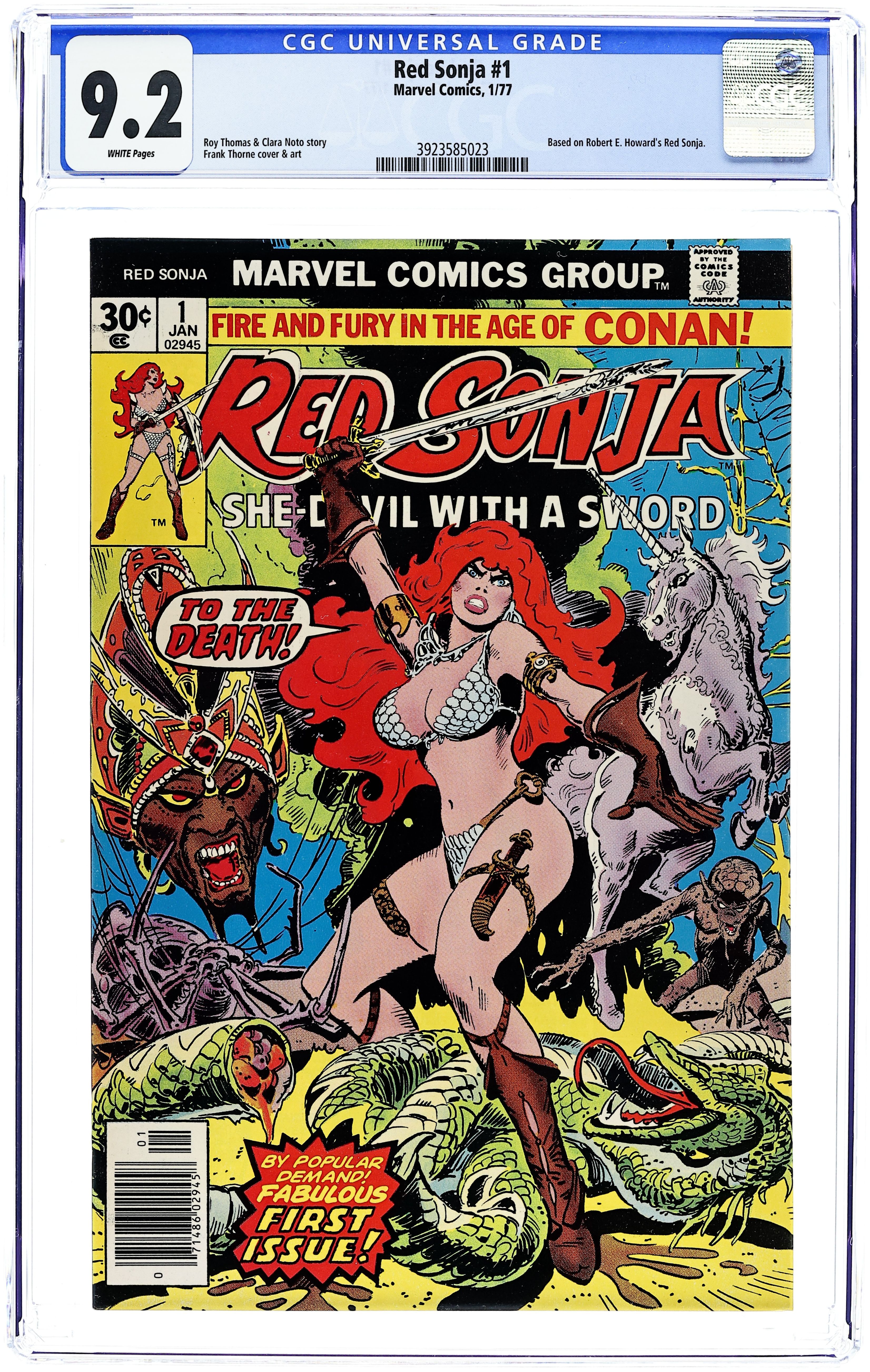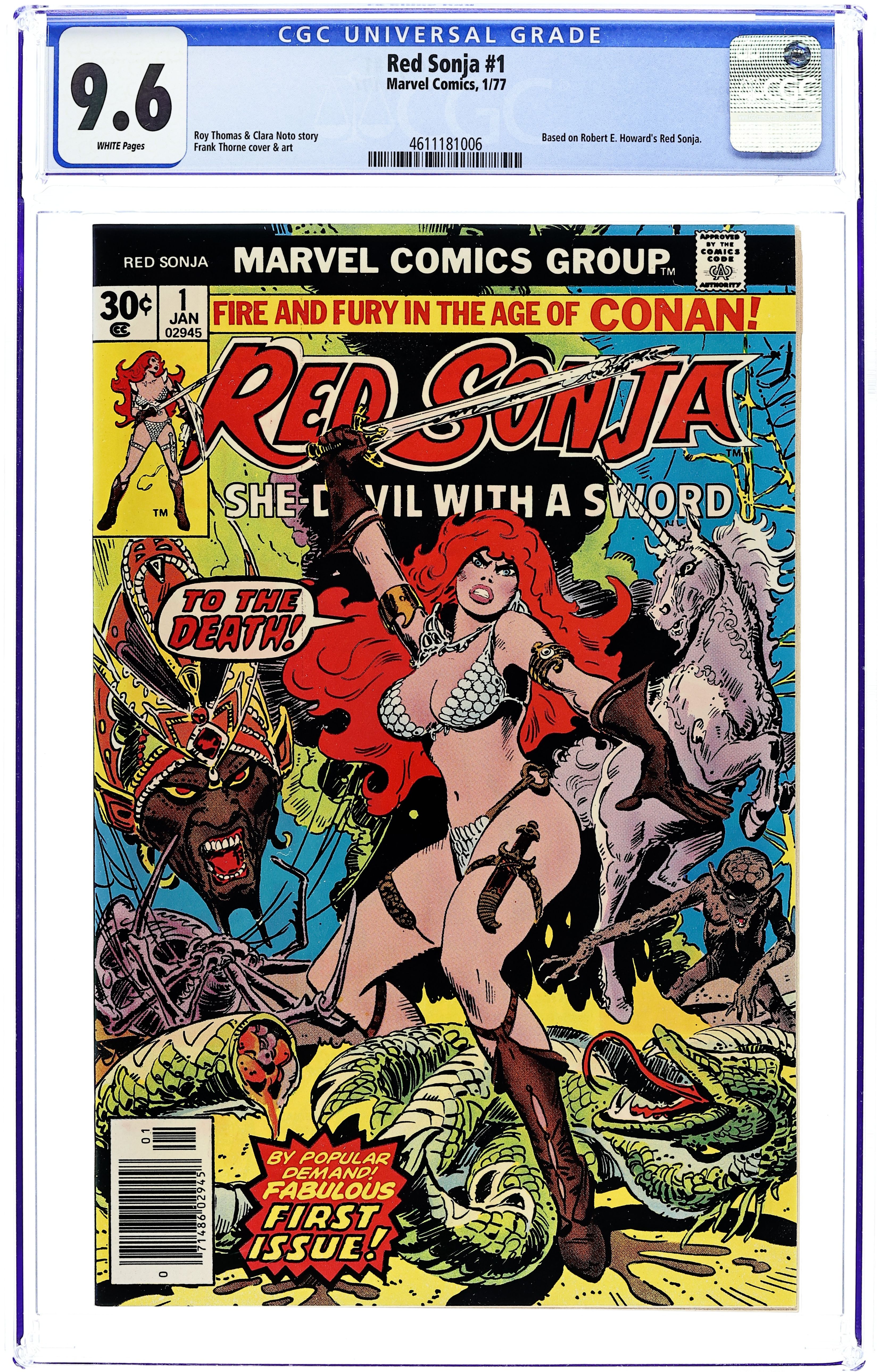 Ends Dec 8 9:15 PM CST Bid History 5 bids Current Bid $32 Your Secret Max Bid If you'd like to bid, please log in or register. Cover by Frank Thorne. The Blood of the Unicorn, script by Ed Summer, Roy Thomas, and Clara Noto, art by Frank Thorne; While wandering the forests of Argos, Red Sonja witnesses a warlord named Andar of Bezfarda attacking a unicorn; He cuts off the unicorn's horn in the hopes of obtaining its mystical properties; Red Sonja leaps down and liberates the unicorn from its attackers; She rides off with it, and both rider and mount develop a close bond. The Hulk stars in a one-page Hostess ad, "The Green Thumb." 36 pgs., full color. $0.30. Cover price $0.30.