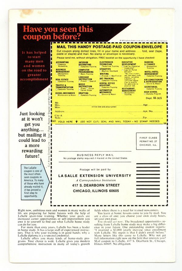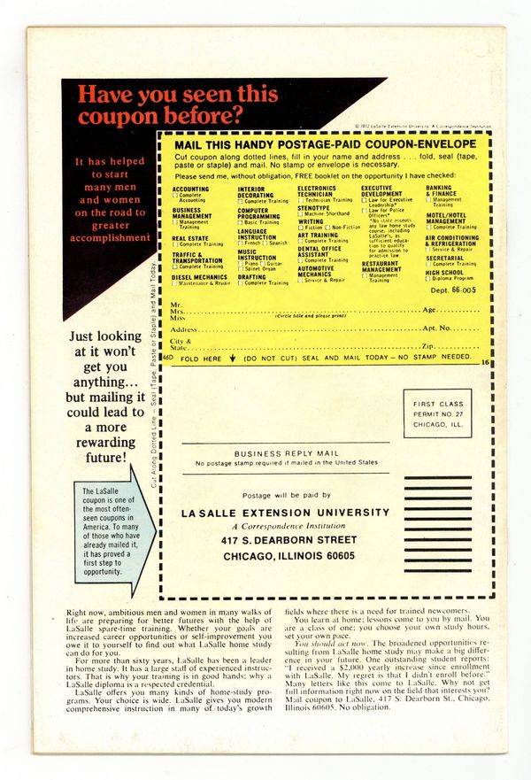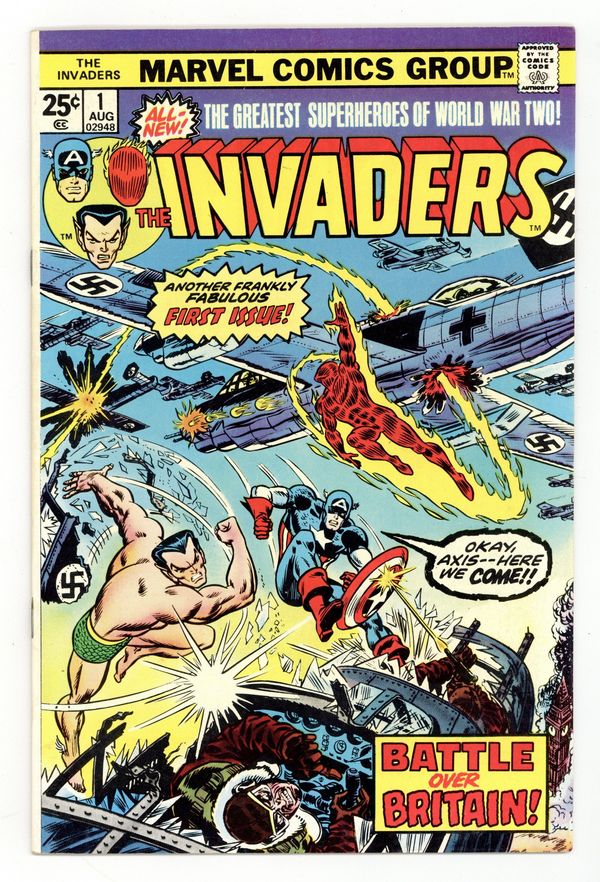 Part 1 of 2 - "The Ring of the Nebulas!" Written by Roy Thomas. Art by Frank Robbins and Vince Colletta. The greatest heroes of the Golden Age, Captain America, Human Torch, and Prince Namor alongside their sidekicks Bucky and Toro, unite to win World War II and take down the Axis Powers once and for all. But when Captain America rescues a mysterious woman of great beauty, the Invaders suddenly find themselves confronted with a threat greater than anything they've ever faced before. 32 pages FC. Marvel Value Stamp. Cover price $0.25.