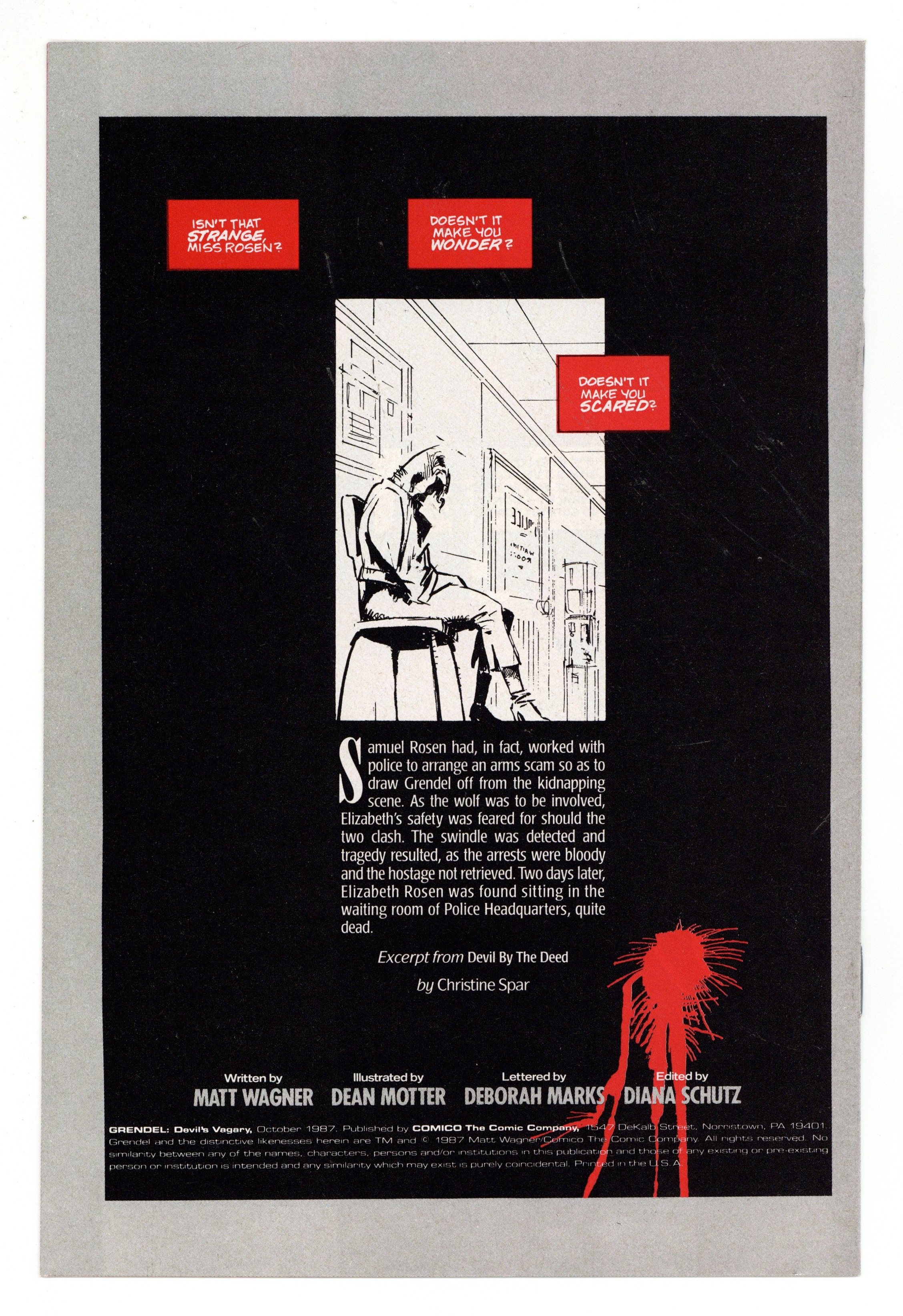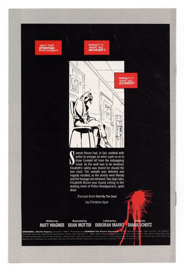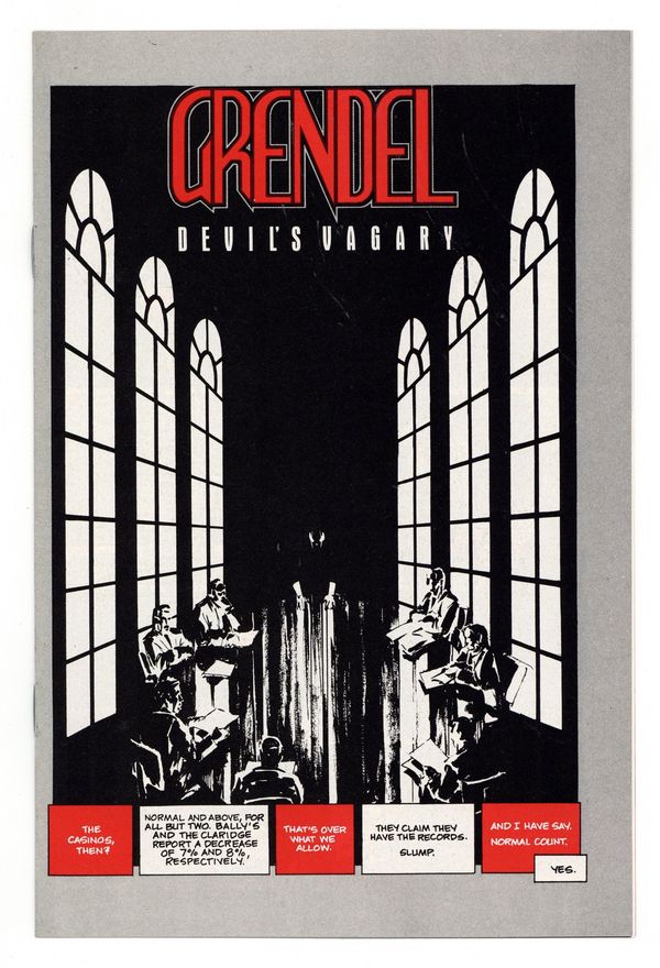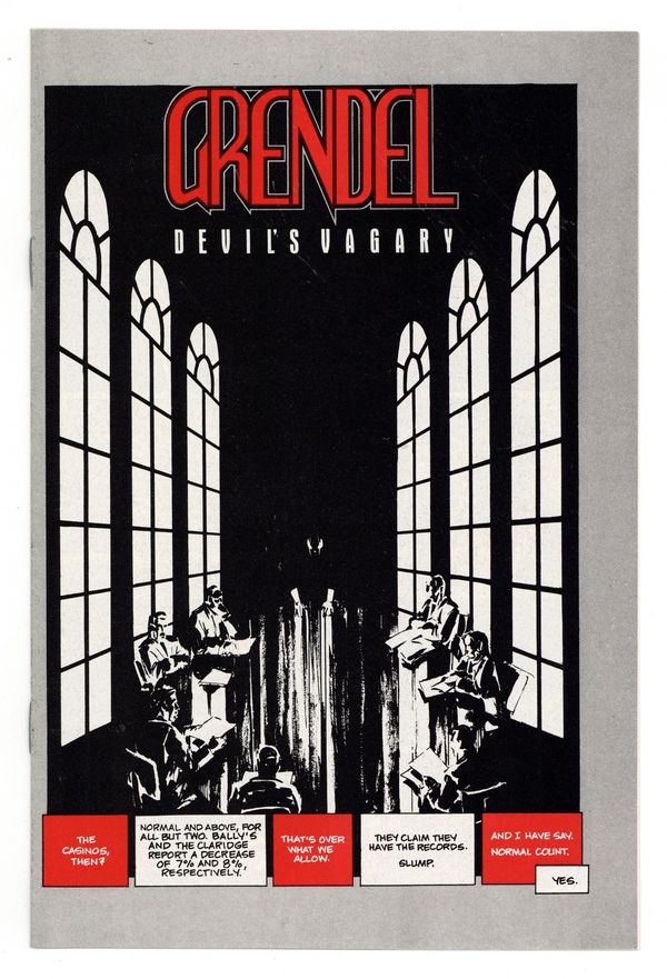 $30.00This rare 16-page premium comic has never been reprinted anywhere (see GRADING NOTE THAT FOLLOWS). Published in October 1987, Grendel: Devil's Vagary is a 16-page comic, printed in black, white and red. It was originally part of the Grendel Comico Collection which included a deluxe, silver embossed slipcase, ten Comico back issues (including a random copy of Grendel), a Comico wall poster, and a copy of the Comico Comming Attractions newsletter. GRADING NOTE: Due to the way this items was packaged with other items when originally released, NM-Mint copies are very rare. Most copies, even when well-cared for, are typically FN to VF at best.