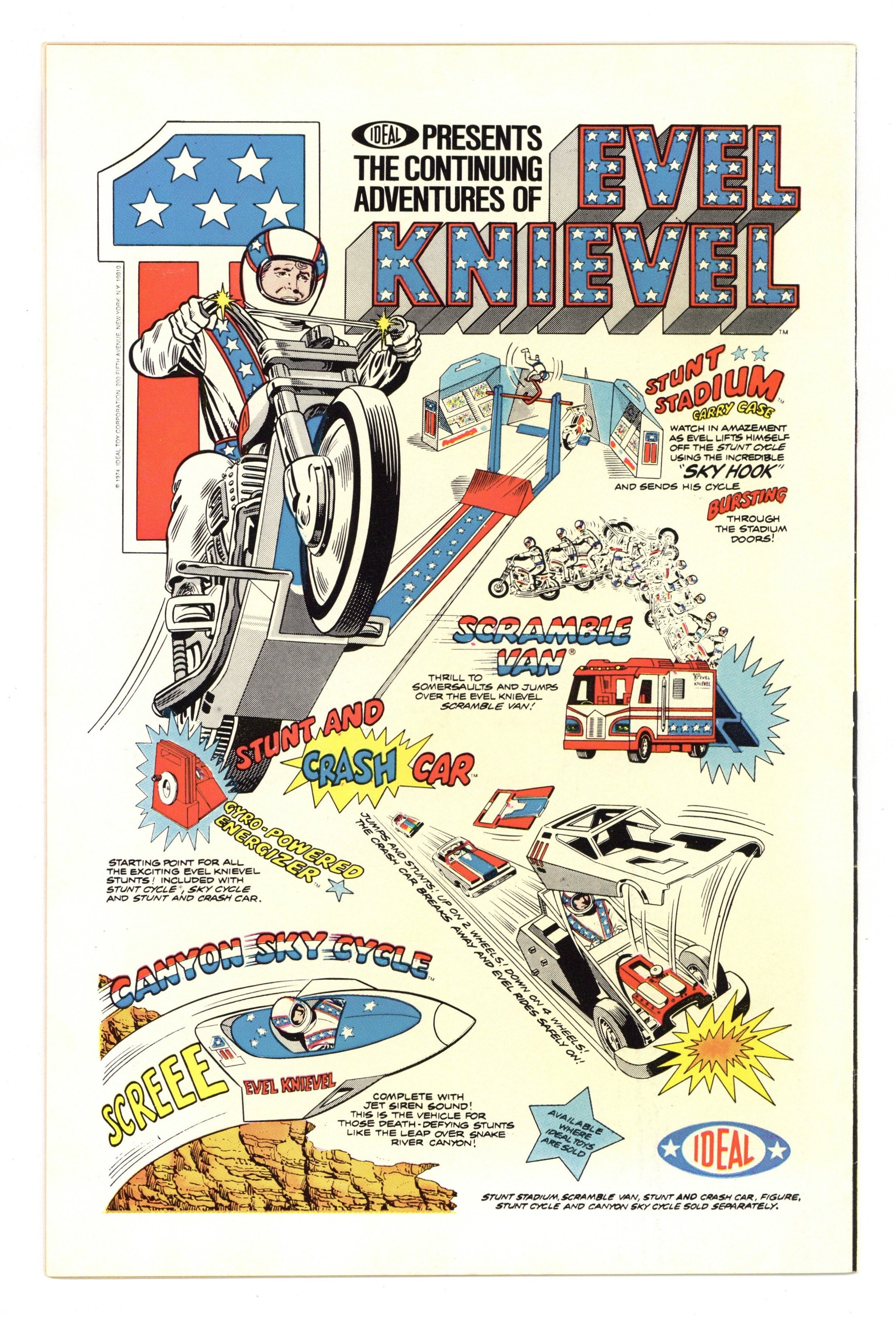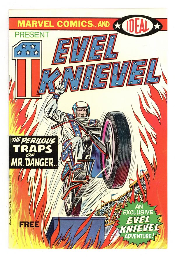 Cover by John Romita. Evel Knievel Bicycle Safety public service announcement. The Perilous Traps of Mr. Danger!; Evel Knievel prepares for a stunt in southern Florida, but someone stands in his way. Evel Knievel pinup photo. Ad for Ideal Evel Knievel toys. Comic-sized freebee. 20 pgs., full color.