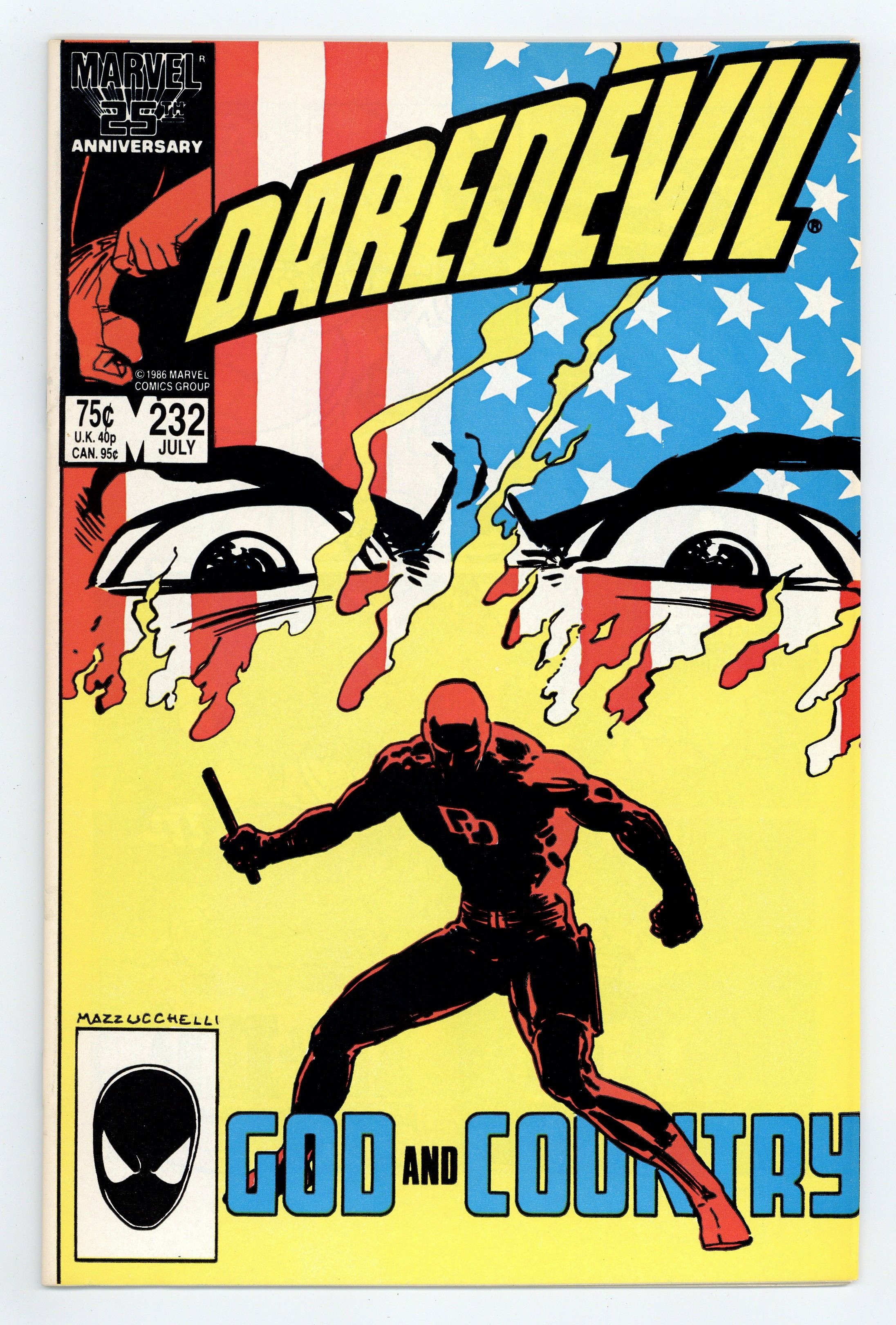 Direct Edition. Cover art by David Mazzucchelli. God and Country starring Daredevil, Karen Page, Foggy Nelson, Glorianna O'Breen, Ben Urich, Kingpin, and Nuke [Sgt. Simpson] (1st), script by Frank Miller, art by David Mazzucchelli; Matt helps Karen kick her drug habit; Kingpin hires a deranged Super Soldier to go after DD; part 6 of critically acclaimed Born Again storyline. 36 pgs. Cover price $0.75. Cover price $0.75.