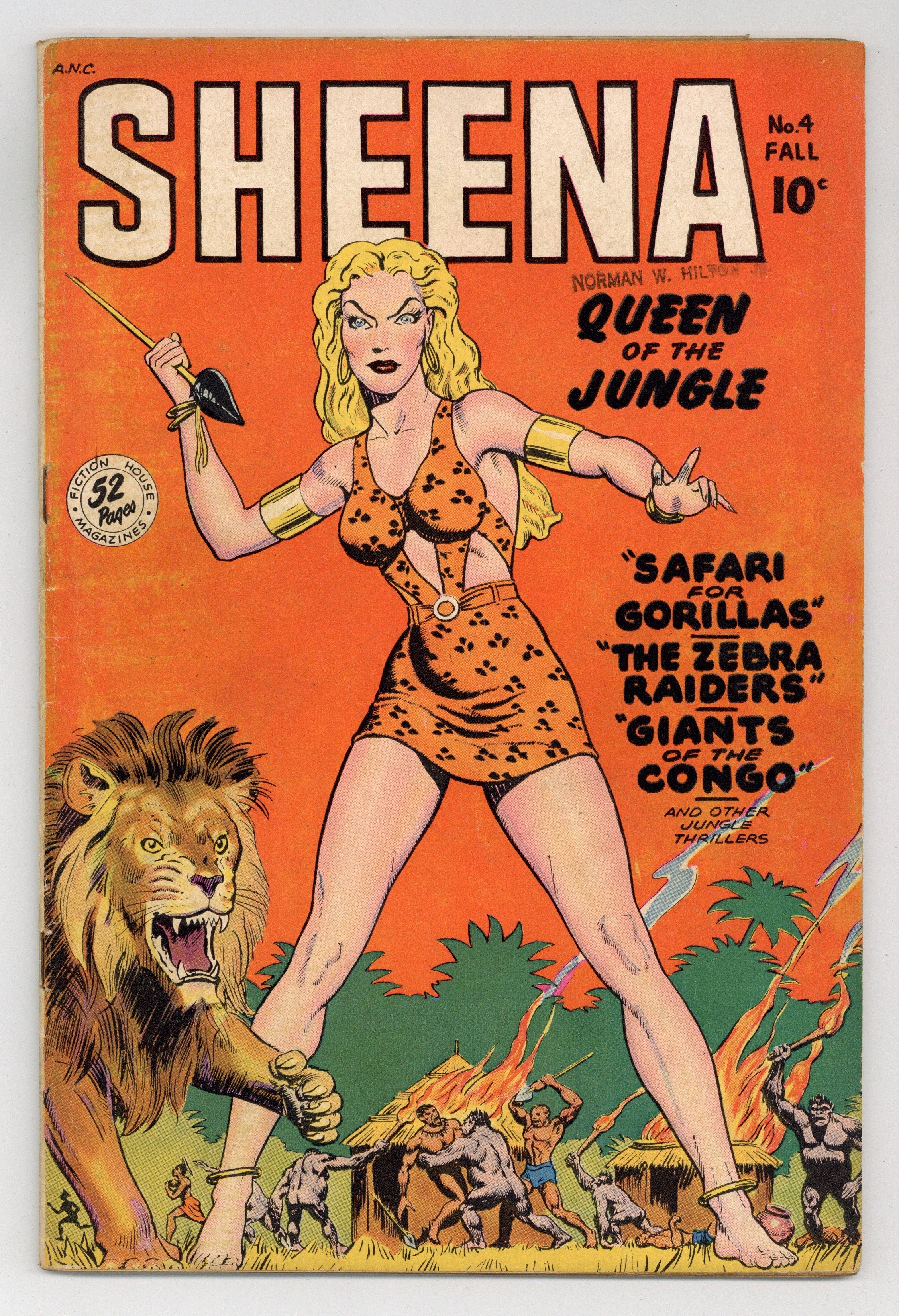 Art by Robert Webb. Cover by Joe Doolin. Adventures of the fearless jungle warrior Sheena, one of the earliest female heroes with her own title. Sheena battles a lion in an ancient arena for the pleasure of a long-lost decadent race; Sheena's origin is retold: she was raised by a witch doctor after her explorer father died in the jungle; Bob and Sheena rescue an archaeologist's son who is lost in the jungle after a plane crash. Safari for Gorillas; The Zebra Raiders; How Sheena and Bob Came to the Jungle; Giants of the Congo; Sheena. 52 pages, Full Color. Cover price $0.10.