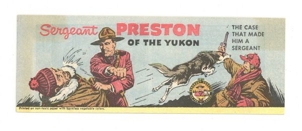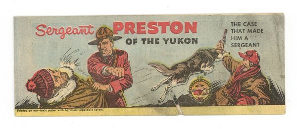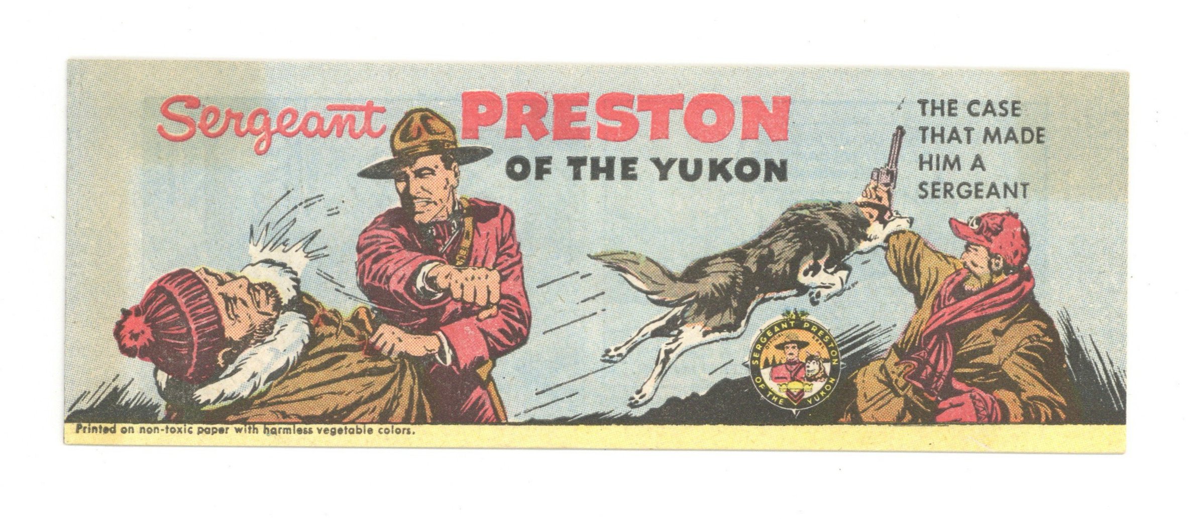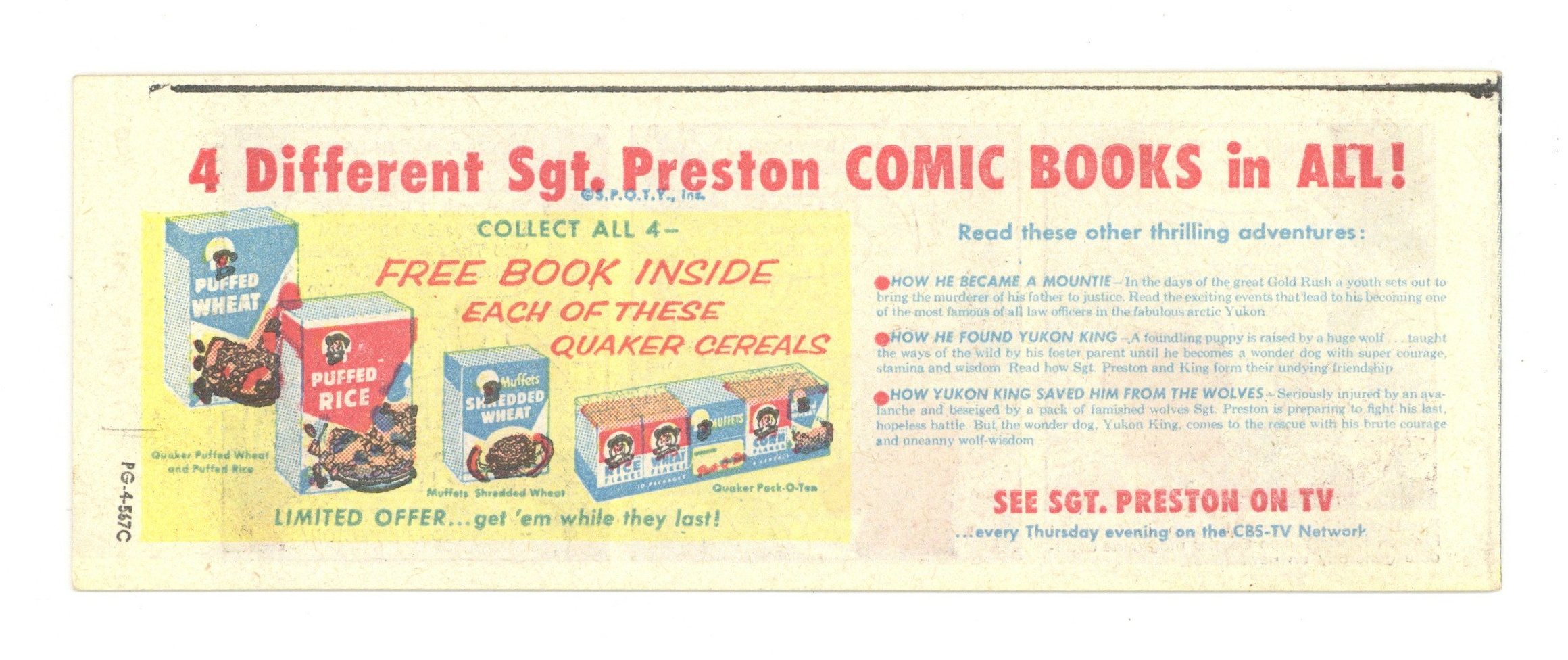 Sergeant Preston of the Yukon in "The Case that Made Him a Sergeant" (1956), is a promotional comic book that was distributed in boxes of Quaker Oats cereal. 16-page full color mini-comic 7-in. x 2.5-in., no cover price.
