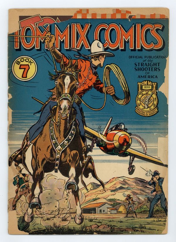Cover by Fred Meagher. Stories and art by Charles Biro, August Froehlich, Stan Schendel, and Fred Meagher. When movie cowboy Tom Mix's radio show hit it big, sponsor Ralston Purina offered Tom Mix Comics by mail for two boxtops of any Ralston cereal. The art, often uncredited, is exceptionally nice in this series. Tom must protect the experimental XP-80 plane from saboteur Doctor Goliath, in a story that contains an impressive splash page of a train explosion, and another scene of Tom lassoing a plane in flight (!). Miserly Uncle Amos decides the Fumble family's pet pig would be a cheap source of bacon, but luckily he's a lousy shot, in a story with art by comics legend Charles Biro. Outlaws trap Jane and Pop Johnson in a burning cabin, but luckily, she's got her Tom Mix Straight Shooter telegraph set. Plus activities pages and magic tricks. And a page praising "Clean, High-Grade" Tom Mix Comics, and emphasizing that they have no "blood-curdling horror, gangster heros, glorification of war " or "cheap, badly drawn illustrations, to debase young readers' conceptions of form and proportion." (!) An early salvo in the comics culture wars. Action-packed cover by Fred Meagher has a little bit of everything. The Train That Vanished from the Face of the Earth; The Fumble Family with Amos Q. Snood; My Favorite Magic Tricks; Sure as Shootin'; Great Straight Shooters: Teddy Roosevelt; Jane's Page; Jane of Dream Castle; Stubby and His Straight Shooter Pals; Teepee of the Plains Indians; Tom Mix and the Cry for Help! 32 pages, Full Color.