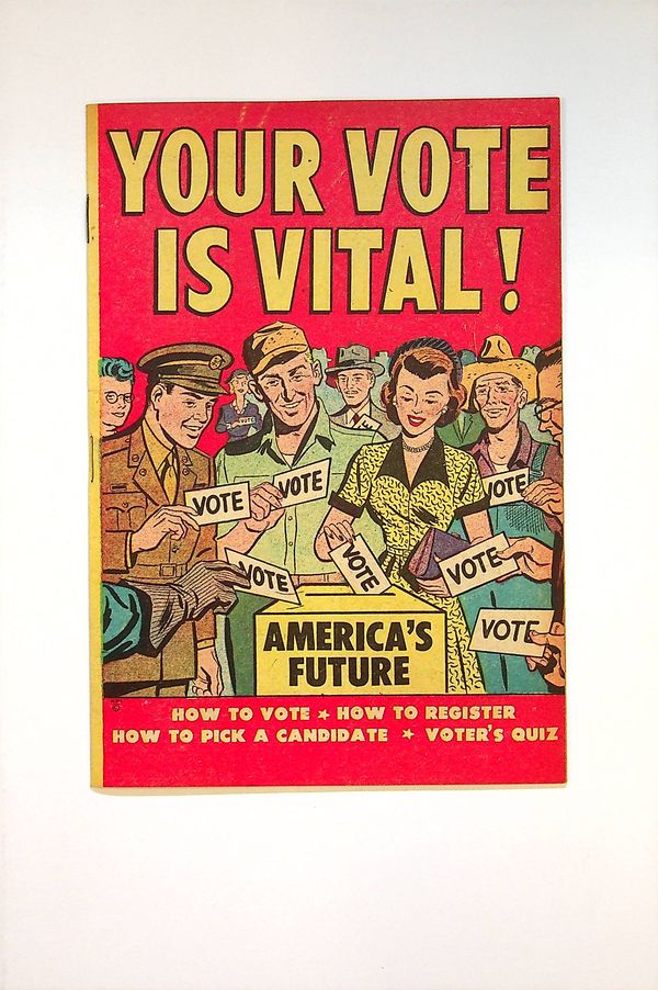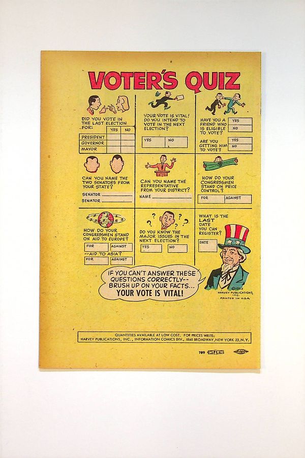 Tags: Harvey Votes Are Vital$16.00Importance of voting promotional comic starring Uncle Sam. 16 pages, full color, 5-in. x 7 1/8-in. NOTE: May have originally come in an Illustrated Envelope With the words "Here are the tools to help prove that votes are vital!" This Envelope is in our Database as Harvey Votes Are Vital Envelope (1952).
