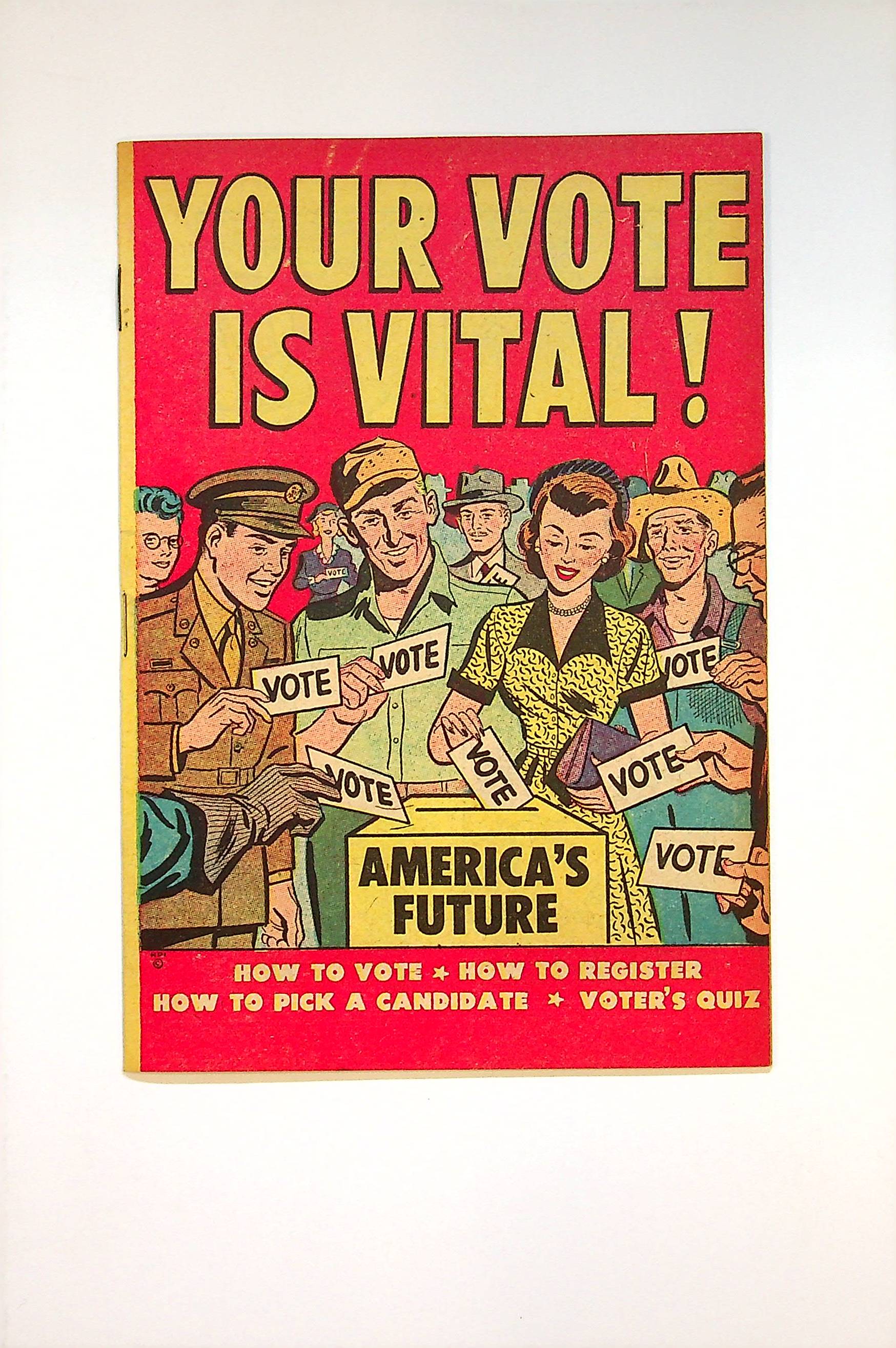 Importance of voting promotional comic starring Uncle Sam. 16 pages, full color, 5-in. x 7 1/8-in. NOTE: May have originally come in an Illustrated Envelope With the words "Here are the tools to help prove that votes are vital!" This Envelope is in our Database as Harvey Votes Are Vital Envelope (1952).
