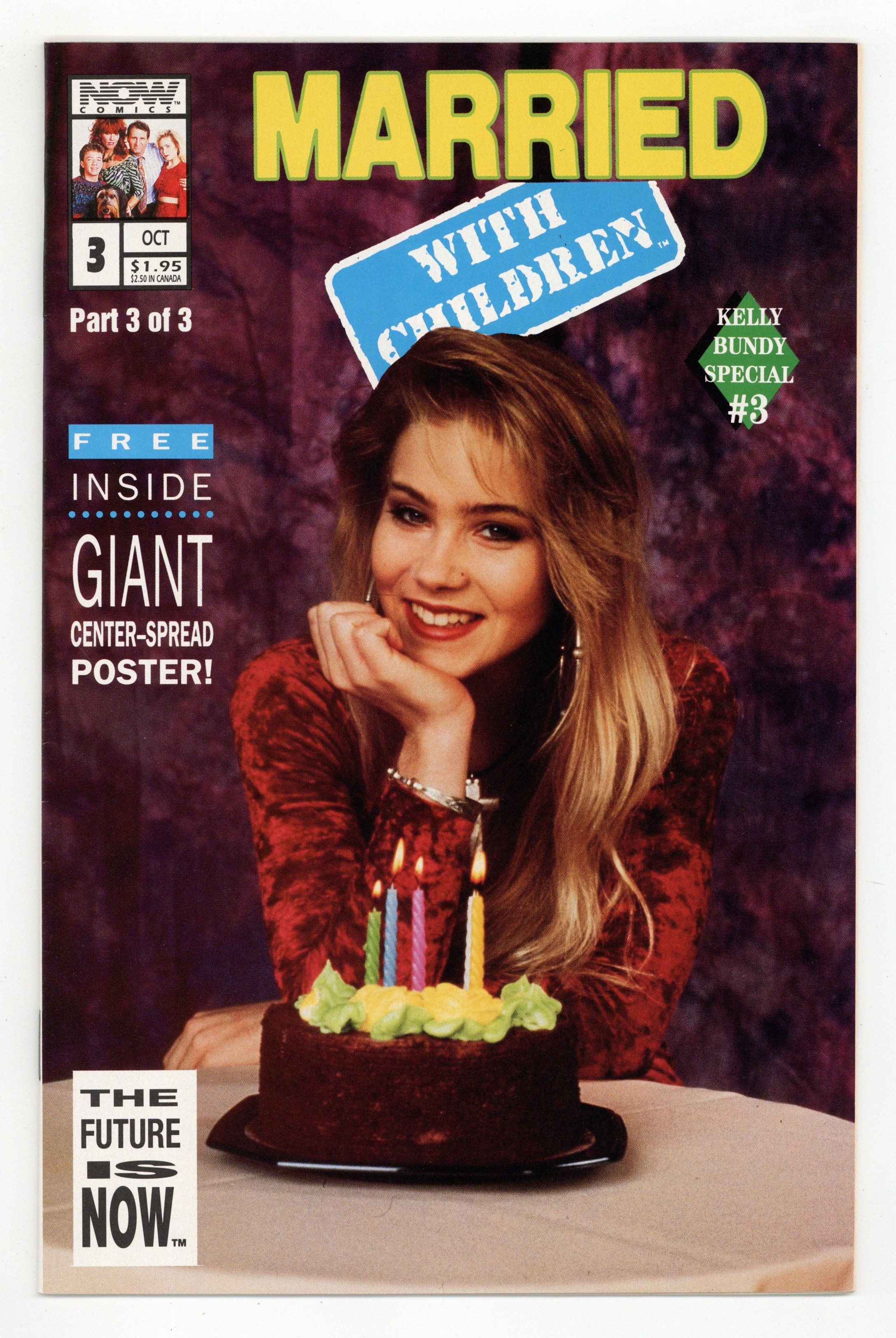 WITH "Free inside, Giant Center-Spread Poster" Happy Birthday and Get Out! Story by Barry Daniel Petersen. Art by Mark Braun. A miniseries focusing on Kelly Bundy, the sexy but stupid daughter from the hit sitcom. Al has the perfect birthday present for Kelly: independence, whether she wants it or not. Final issue of the series; followed by Married With Children Kelly Goes to Kollege. 32 pages, Full Color. NOTE: Originally came with a fold-out poster bound in centerfold and may or may not include poster when purchased. Cover price $1.95.