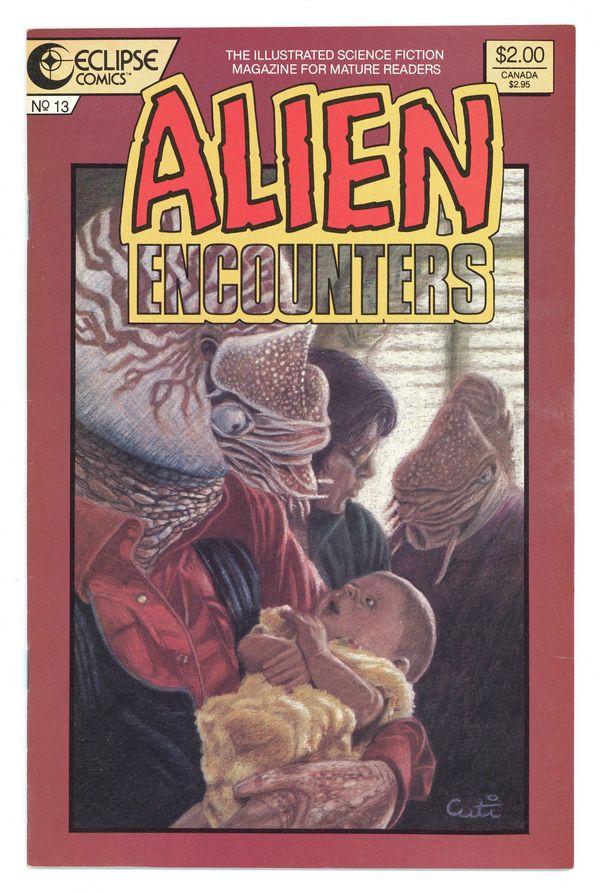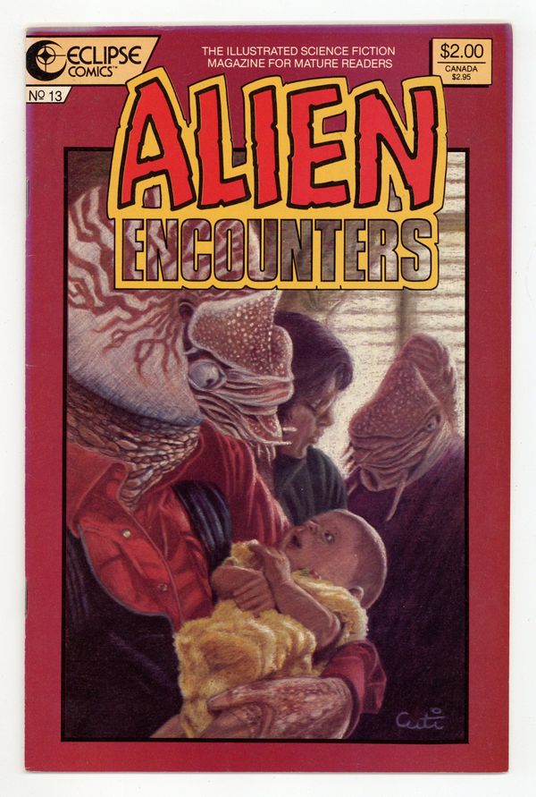 $9.00Cover by Nicola Cuti. Written by Chuck Dixon, Ruby and Douglas Wheeler. Art by Peter Ledger, Graham Nolan, Hilary Barta and Doug Medved. The illustrated science fiction magazine for mature readers. In this issue: "The Light at the End" by Chuck Dixon and Peter Ledger; "Page One" by Ruby and Graham Nolan; "The Midget and the Eyeball" by Douglas Wheeler and Hilary Barta; and "The Ideal Solution!" by Ruby and Doug Medved. 32 pages, full color. Mature Readers. Cover price $2.00.