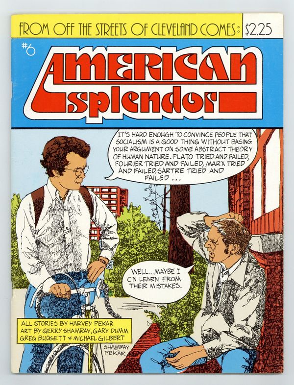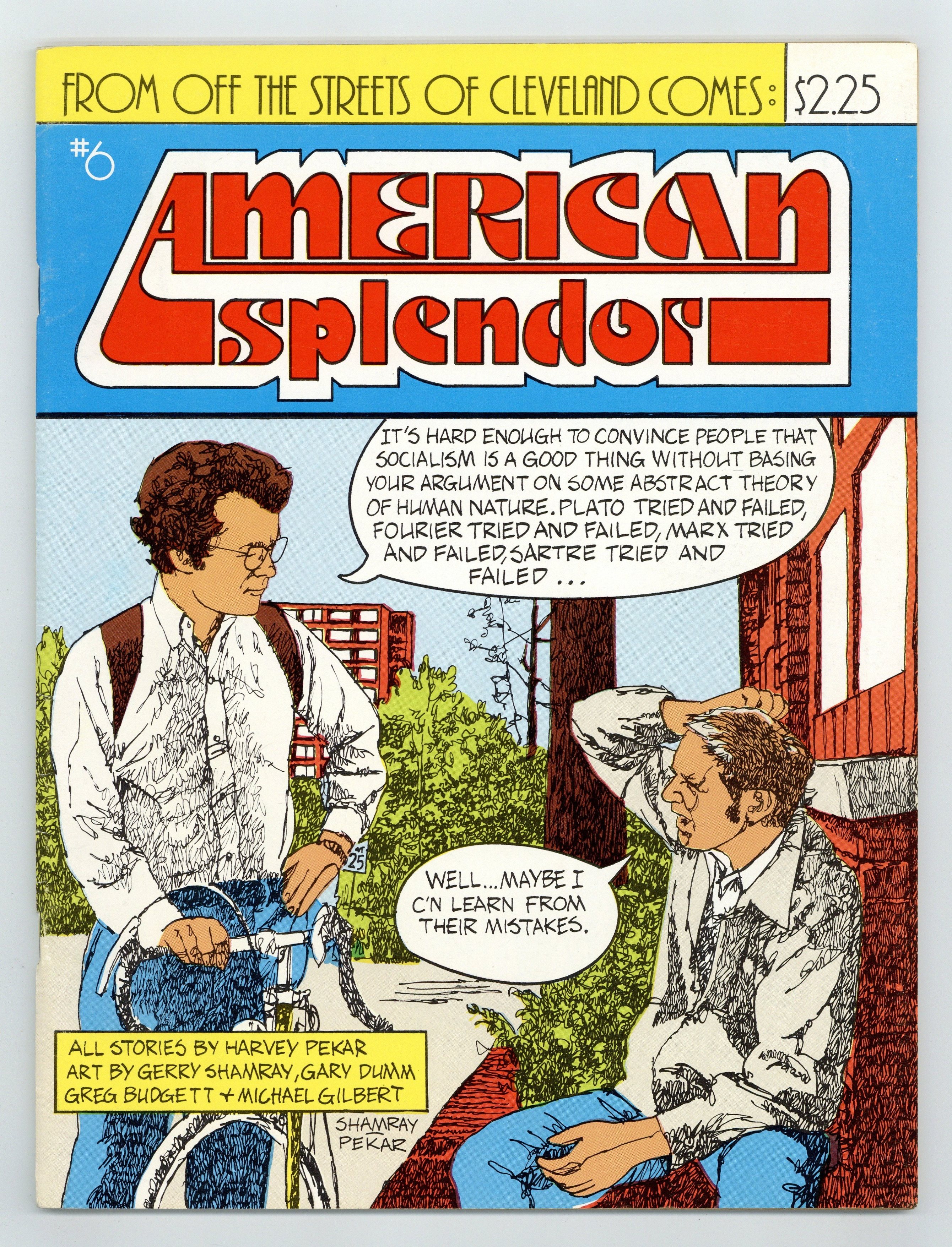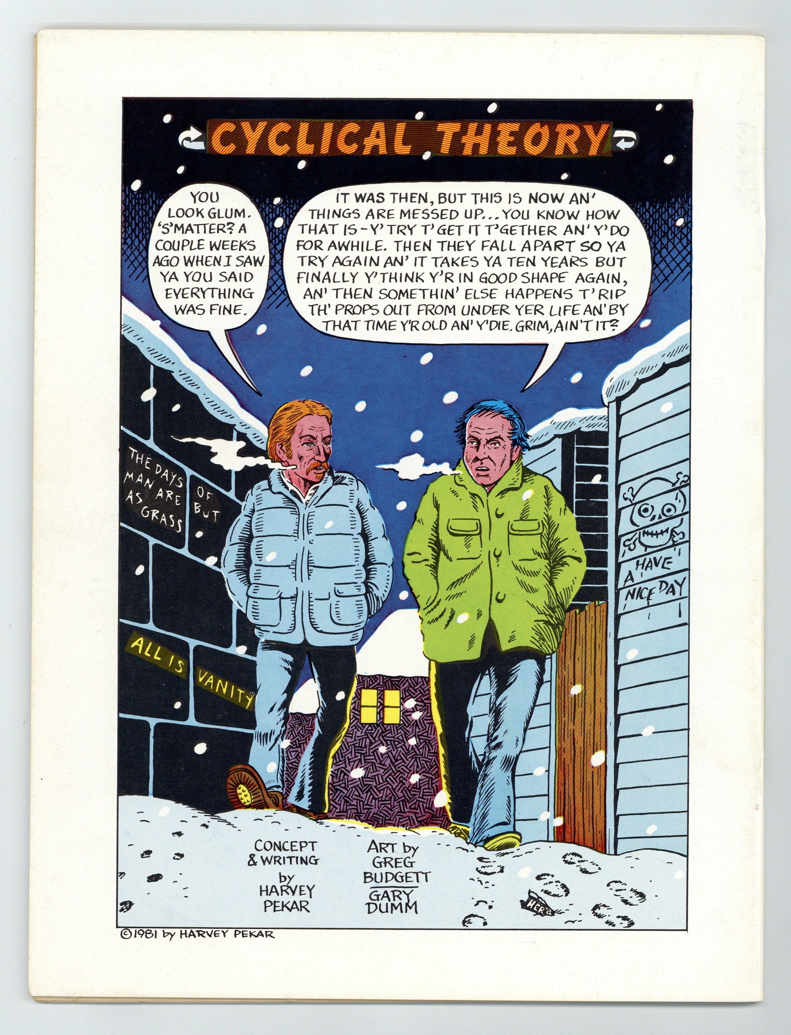 Cover art by Gerry Shamray. Ripoff Chick, script by Harvey Pekar, pencils by Greg Budgett, inks by Gary Dumm; Harvey sees a woman and sparks a memory of how they were ten years previously, and the relationship starts again. Young Ideas, script by Harvey Pekar, art by Michael T. Gilbert; Joe wants to know how Harvey makes out with women at work. Cold World, script by Harvey Pekar, art by Gerry Shamray; A 61 year old guy asks Harvey about the chances of a job, and tells his story. Read This, script by Harvey Pekar, pencils by Greg Budgett, inks by Gary Dumm; Harvey remembers a guy he used to trade records with and helps him move his collection. Once Again to Oregon, script by Harvey Pekar, art by Gary Dumm; Harvey's flight companion to Oregon is far more interesting than he anticpated. Prelude, Party & Post-Party, script by Harvey Pekar, art by Gary Dumm; Harvey puzzles on and off for years about a girl he liked in high school. 60 pages, B&W. Cover price $2.25.