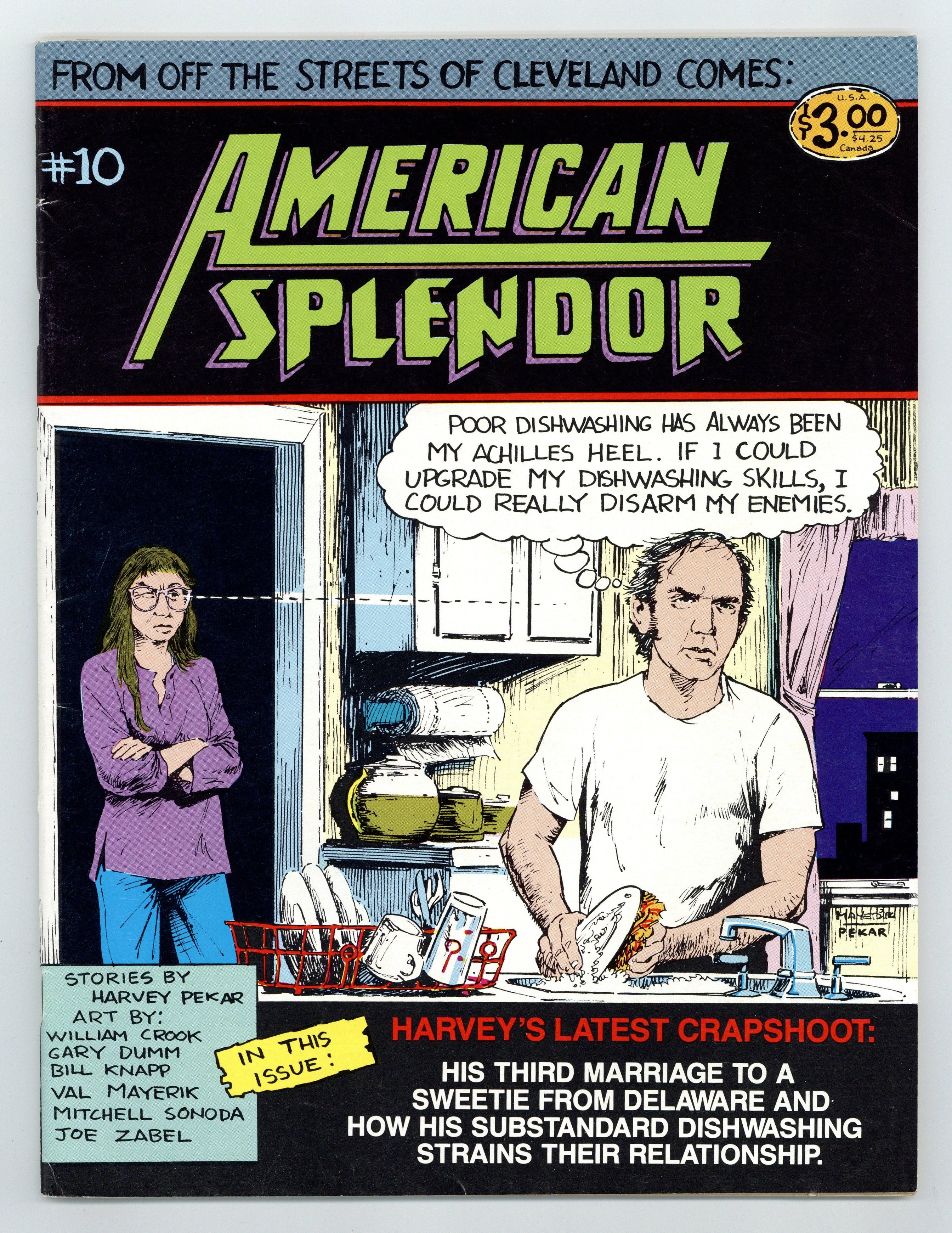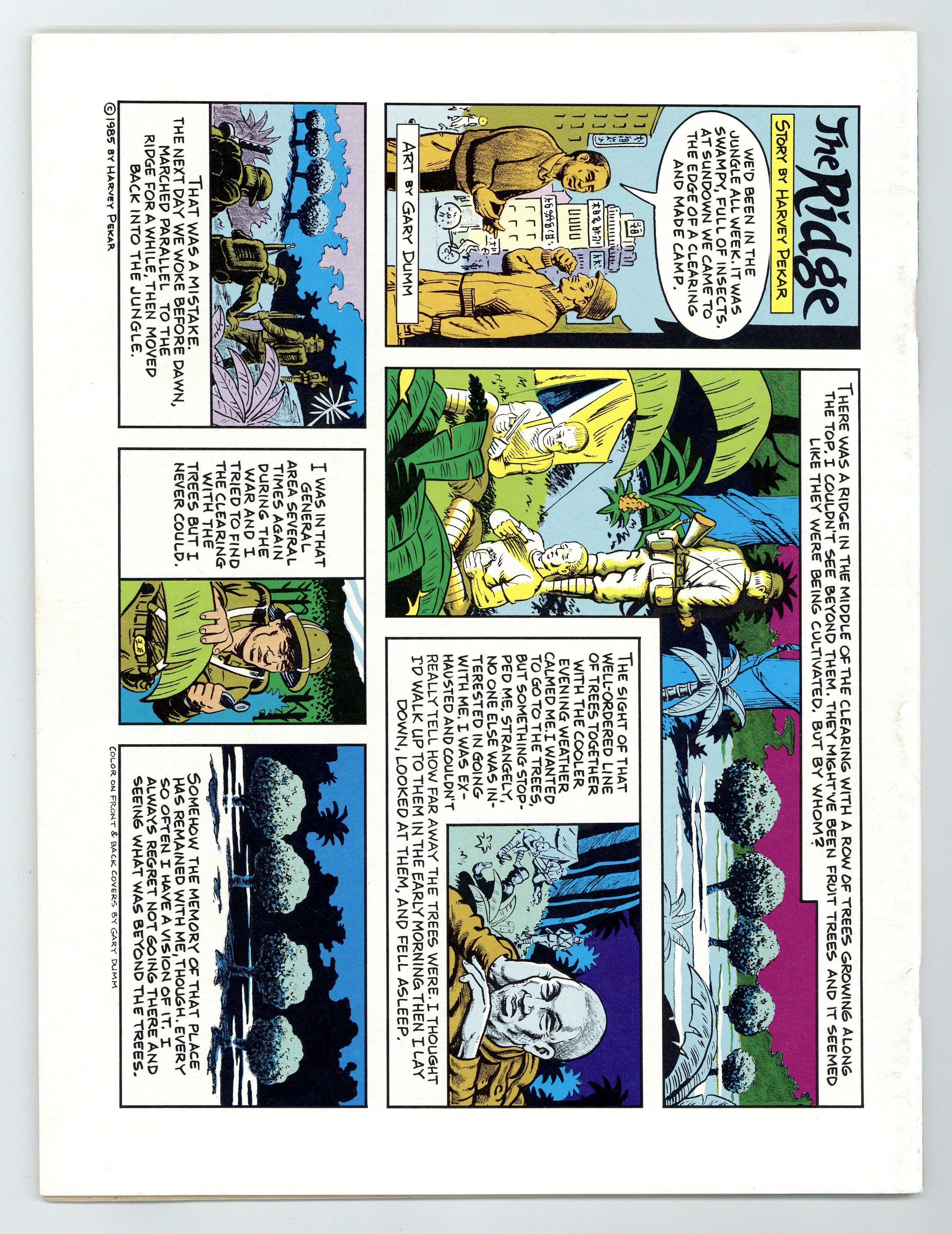 Cover art by Val Mayerik. The Bird Man, script by Harvey Pekar, art by Bill Knapp; A guy is selling wind-up birds at the Coventry Street fair. Double Feature part 1: Footloose, script by Harvey Pekar, art by Bill Knapp; Harvey and Toby get into work early and discuss the movie Footloose. Double Feature part 2: Revenge Of The Nerds, script by Harvey Pekar, art by Bill Knapp; Harvey witnesses an altercation at the flea market. A Marriage Album, script by Harvey Pekar and Joyce Brabner, art by Val Mayerik; Harvey and Joyce relate how a correspondence blossomed into a relationship. Obsessive-Compulsive (Lost Glasses), script by Harvey Pekar, art by Bill Knapp; Harvey was wearing his glasses when he came in, but can't find them now. Violence, script by Harvey Pekar, art by Val Mayerik; Harvey's experiences with violence from teenage days to present, and a recent mugging. 60 pages, B&W. Cover price $3.00.
