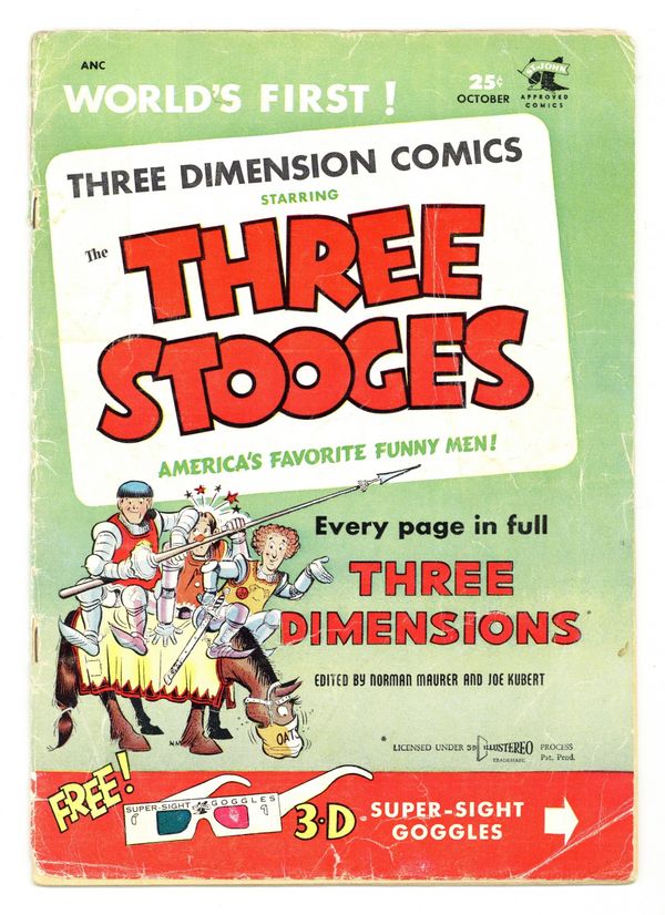 Does not include original 3-D glasses. Cover by Norman Maurer. Stories and art by Joe Kubert and Norman Maurer. St. John, pioneer of celebrity comics and 3-D comics, combines the two as Moe, Larry and Shemp leap off the page. A mad scientist tricks the Stooges into test-piloting his rocketship to the moon. The Stooges are hired as store detectives to catch the thief known as The Chimp. Stunt performer Jeanie Steele goes on a location shoot in the jungle and danger follows, in a story with early art by comics legend Joe Kubert. Men in the Moon; Two Drips and a Droop!; The Nightmares of Benedict Bogus; Stunt Girl; Pie-Rates Reward. 32 pages, B/W with 3-D effects. Cover price $0.25.