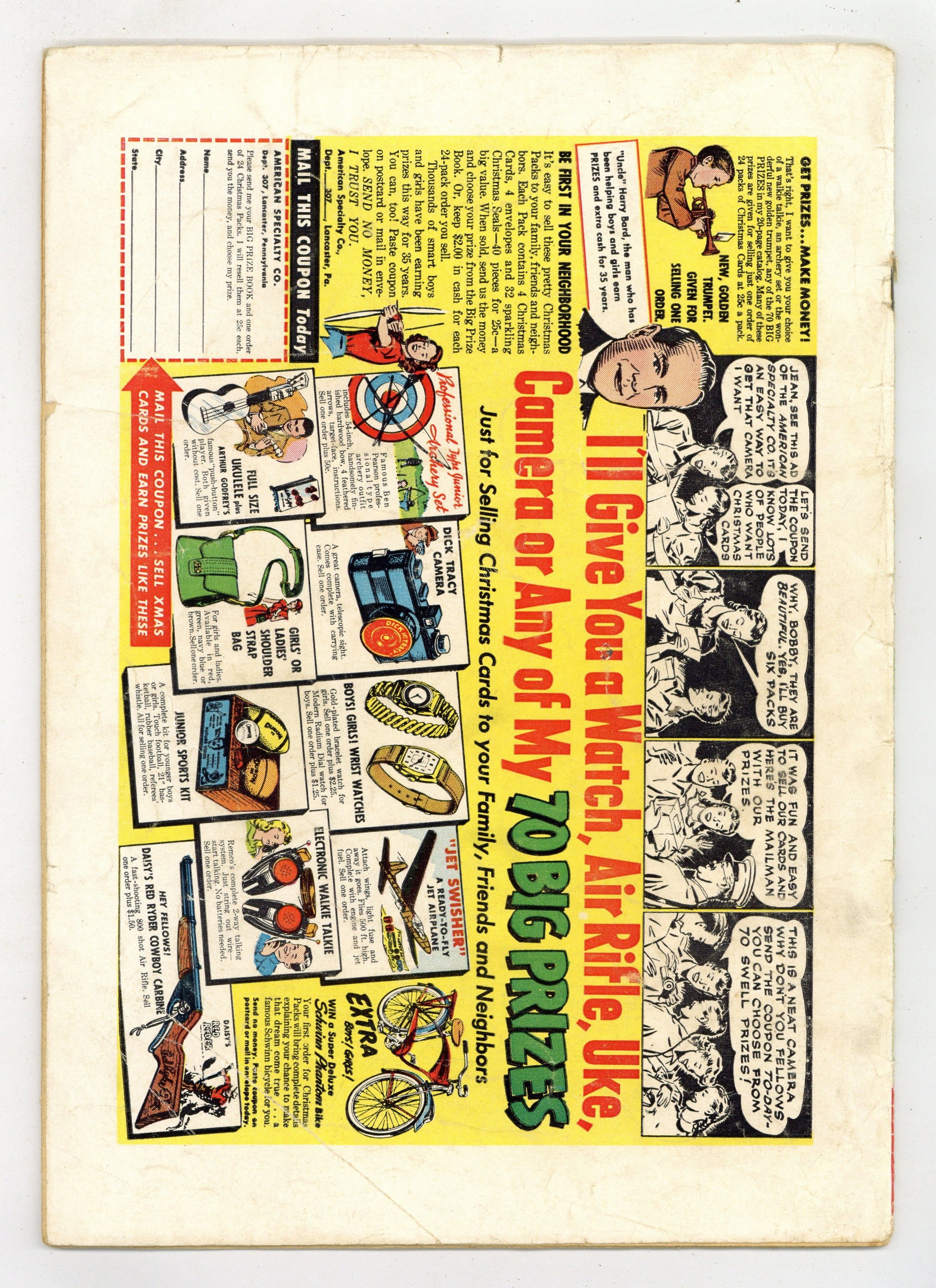 Tags: 3D$10.00Does not include original 3-D glasses. Cover by Norman Maurer. Stories and art by Joe Kubert and Norman Maurer. St. John, pioneer of celebrity comics and 3-D comics, combines the two as Moe, Larry and Shemp leap off the page. A mad scientist tricks the Stooges into test-piloting his rocketship to the moon. The Stooges are hired as store detectives to catch the thief known as The Chimp. Stunt performer Jeanie Steele goes on a location shoot in the jungle and danger follows, in a story with early art by comics legend Joe Kubert. Men in the Moon; Two Drips and a Droop!; The Nightmares of Benedict Bogus; Stunt Girl; Pie-Rates Reward. 32 pages, B/W with 3-D effects. Cover price $0.25.