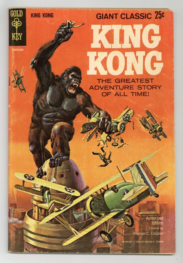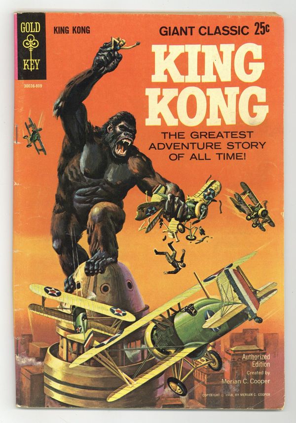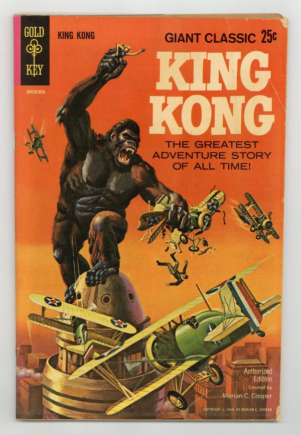 Comic book-sized giant edition. Painted cover by George Wilson. #30036-809 on cover. Adaptation of the classic 1930s movie "King Kong." Back cover features a pinup of front cover illustration. Story and picture summaries on inside covers. "King Kong," script by Gary Poole, pencils by Giovanni Ticci, inks by Alberto Giolitti; A film crew voyages to a tropical island for an exotic location shoot and discovers a gigantic gorilla who falls for their female blonde star. 68 pgs., full color. $0.25. Cover price $0.25.
