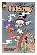 Whitman edition. All new stories with Uncle Scrooge. In "The Mini-Bin Vacation" Scrooge is followed by the Beagle Boys when he goes on vacation with a trailer full of money, in "The Wreck of the Merry Lark" Scrooge and Moby Duck try to locate a sunken treasure, in "The Collectibles" Scrooge goes on a collectible hunt, and in "The Educated Cane" Scrooge gets a walking cane from Gyro Gearloose. No story/art credits given. Cover price $0.60.
