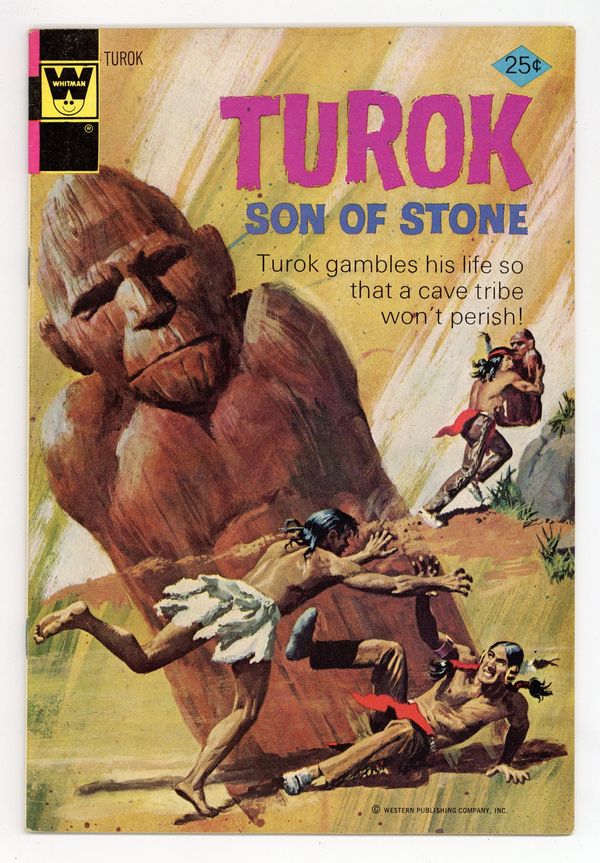 Whitman edition. Painted cover. Turok in "Honker Drums" in which Turok and Andar battle a tribe who can control the dinosaurs with drums and "The Stolen Idol" in which Turok and Andar try to retrieve an idol that a tribe worships. No art/story credits given. 36 pages, full color. Cover price $0.25.