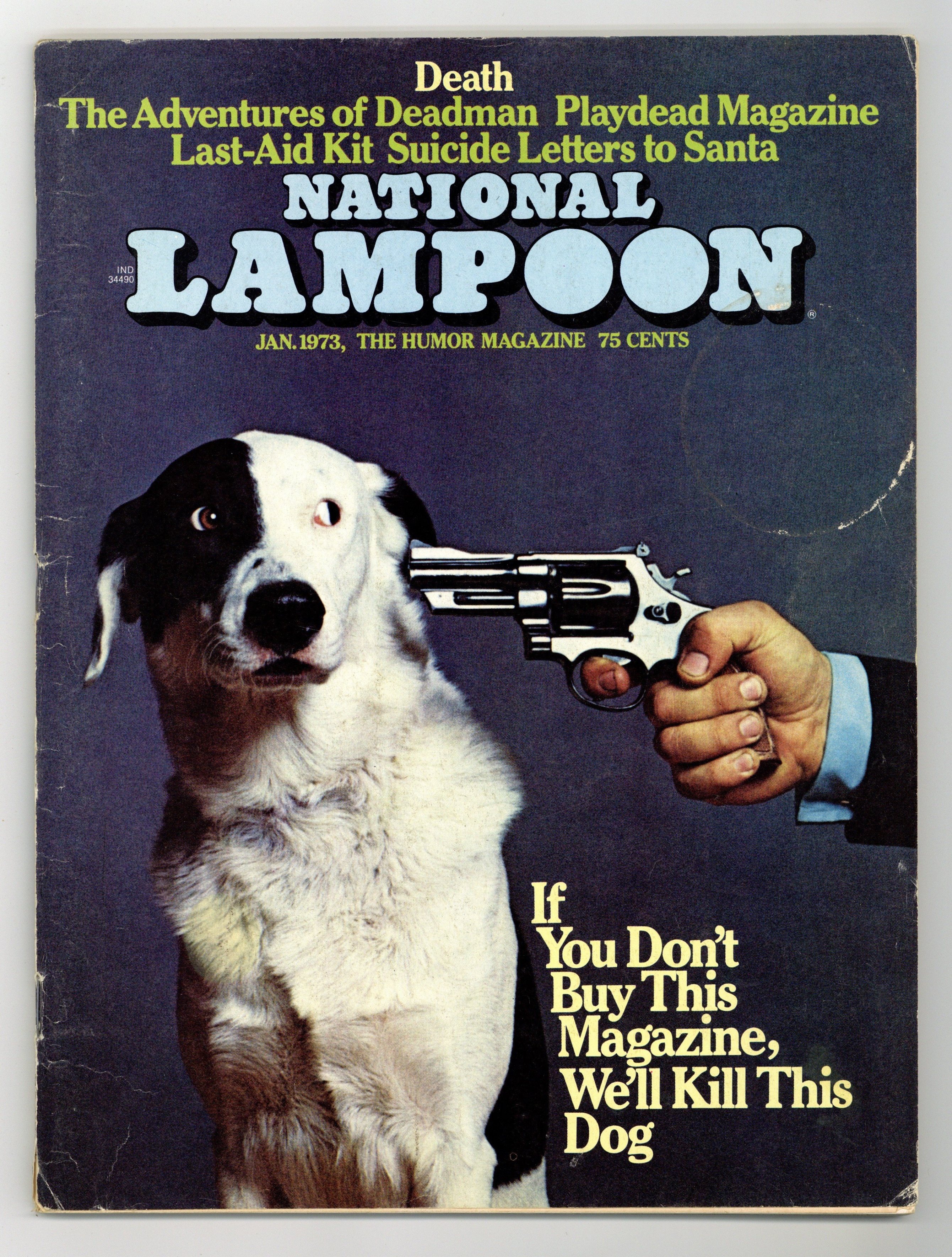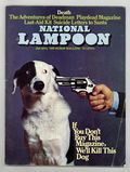 January 1973. Death. Deadman Comics, featuring art by Dick Giordano and Neal Adams (but not the DC character); kids suicide notes to Santa; a spoof of Playboy for dead people. Stories and art by Michael O'Donoghue, P. J. O'Rourke, Frank Springer, Brad Holland, Sean Kelly, Gahan Wilson, Jeff Jones, Shary Flenniken, M.K. Brown, Bobby London, Michael Gross, Henry Beard and Doug Kenney. Plus letters from the editors, cartoons, and Foto Funnies. Mature readers. Famous, often-imitated cover by Gross and photographer Ronald G. Harris. (The dog survived.) Cover price $0.75.