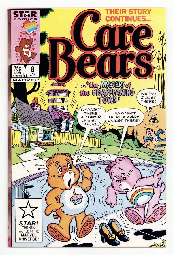 Published Jan 1987 by Marvel/Star Comics.$16.00Join the Care Bears in their magical home, the incredible land of Care-A-Lot. In this issue, the Care Bears run into a family that needs cheering up. But it's hard to be cheerful when your town is disappearing. So the Care Bears go to the town to find out what is going on in "The Disappearing Town" and "Who's Funny Now?" Script by Stan Kay and art by Howard Post & Roberta Edelman. Cover price $0.75.