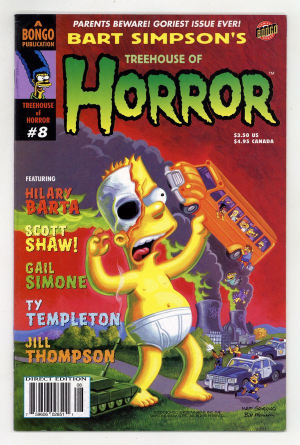 $15.00by Templeton, Shaw, Barta, Simone, & Morrison Bart Simpson's annual tour de force of tricks and treats turns up a pleasingly putrid and asphxiatingly amusing anthology of Halloween humor. Ty Templeton (Stig's Inferno, Batman: Gotham Adventures, and Justice League Adventures) tells a tale of the Simpsons from beyond the grave, as Grampa accidentally causes the death of his loved ones, and a surprising number of grieving and greedy heirs come to claim the Simpson home. In tip of the hat to Stephen King and Big Daddy Roth, Scott Shaw (Oddball Comics!) takes you behind the wheel of a clown car gone mad in "Krustine." Hilary Barta (Splash Brannigan, Plastic Man) teaches you the ABCs of Halloween, and Gail Simone (Deadpool, Killer Princesses) delivers a ghastly goody that will leave you deliciously delirious. FC, 48pg $3.50 Cover price $3.50.