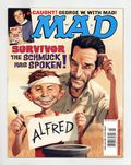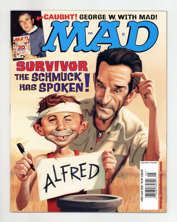 Cover by James Bennett. Stories and art by Al Jaffee, Dick DeBartolo, Anthony Barbieri and Bill Wray, Mike Snider, Desmond Devlin, Arnie Kogen, John Caldwell, Tom Cheney, Amy Gillett, Russ Cooper, Don (Duck) Edwing, Tom Richmond, Hermann Mejia, Amanda Conner, Kevin Pope, Tom Bunk, Angelo Torres, Rick Tulka, Peter Kuper, Dave Berg, and Sergio Aragones. A parody of the movie Traffic and the first CSI TV series, featuring art by Mort Drucker and Angelo Torres. A spoof of media-criticism magazine Brill's Content. Sergio Aragones' version of Survivor. Mad's takes on movie credits, "made" men, and college admissions. Melvin & Jenkins, Monroe, Lighter Side strips by Dave Berg, Marginals by Sergio Aragones, and Spy vs. Spy. Plus the President of the United States reads Mad, as seen on the cover. Traff-eccch!; A Mad Look at Survivor II; Has Your Food Been Genetically Altered?; A Mad Peek Behind the Scenes at a College Admissions; Office; Instant Music Reviews; The Legend of Beggar Vance; Spy vs. Spy; Oh Rubber, Where Art Thou?; The Lighter Side of...; Subscribe to Shrill's Content; Melvin & Jenkins' Guide to School Spirit; Monroe &... The Tree House; You Can Fuhgeddabout Becoming a Made Man in the Soprano Mob If...; Mad Closing Credits for a Typical Movie Theatre Audience; C.S.OY; Mad's Celebrity Cause-Of-Death Betting Odds; Fold-In. 8.5-in. x 11-in., 48 pages, PC/PB&W. Cover price $2.99.