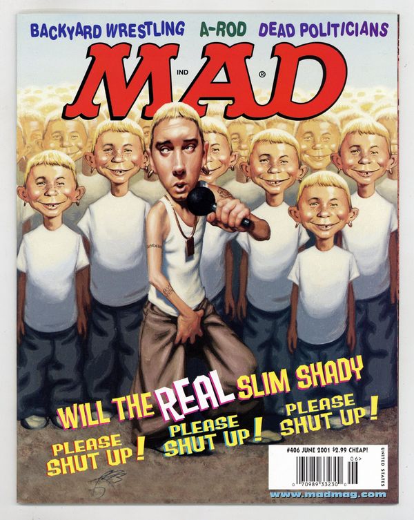 Cover by James Bennett. Stories and art by Al Jaffee, Dick DeBartolo, Anthony Barbieri and Bill Wray, Mike Snider, Desmond Devlin, John Biederman, John Caldwell, Tom Cheney, Michael Gallagher, Andrew J. Schwartzberg, Greg Leitman, Don (Duck) Edwing, Tom Richmond, Hermann Mejia, Patrick Merrell, Mort Drucker, Scott Bricher, Paul Coker, Jr., Ray Alma, Angelo Torres, Rick Tulka, Peter Kuper, Dave Berg, and Sergio Aragones. A parody of the movie Hannibal, featuring art by Angelo Torres. A look at millionaire ball player A-Rod, featuring art by Mort Drucker. Mad has no quarrel with Hollywood liberals - just kidding, it mocks them savagely. Mad's "interview" with rapper Eminem. Mad's takes on backyard wrestling, teachers, and Dick Cheney. Monroe, Lighter Side strips by Dave Berg, Marginals by Sergio Aragones, and Spy vs. Spy. Cannibal; A Mad Look at Teachers; What Is a Hollywood Liberal?; Monroe &... The Art Teacher; Mad's Cable TV Viewing Odds; A Day in the Life of the Little AOL Man!; Mad Tips For Better Backyard Wrestling; Spy vs. Spy; How Alex Rodriguez Will Spend His $252 Million; What Else Is Physically Wrong With Vice-President Dick Cheney?; The Lighter Side of...; Mad's Celebrity Cause-Of-Death Betting Odds: Britney Spears; Gulp Fiction; The Age...; The Do's and Don'ts of Running Dead People For Elective Office; A Special Mad Interview With Eminem; Mad's Celebrity Cause-Of-Death Betting Odds; Fold-In. 8.5-in. x 11-in., 48 pages, PC/PB&W. Cover price $2.99.