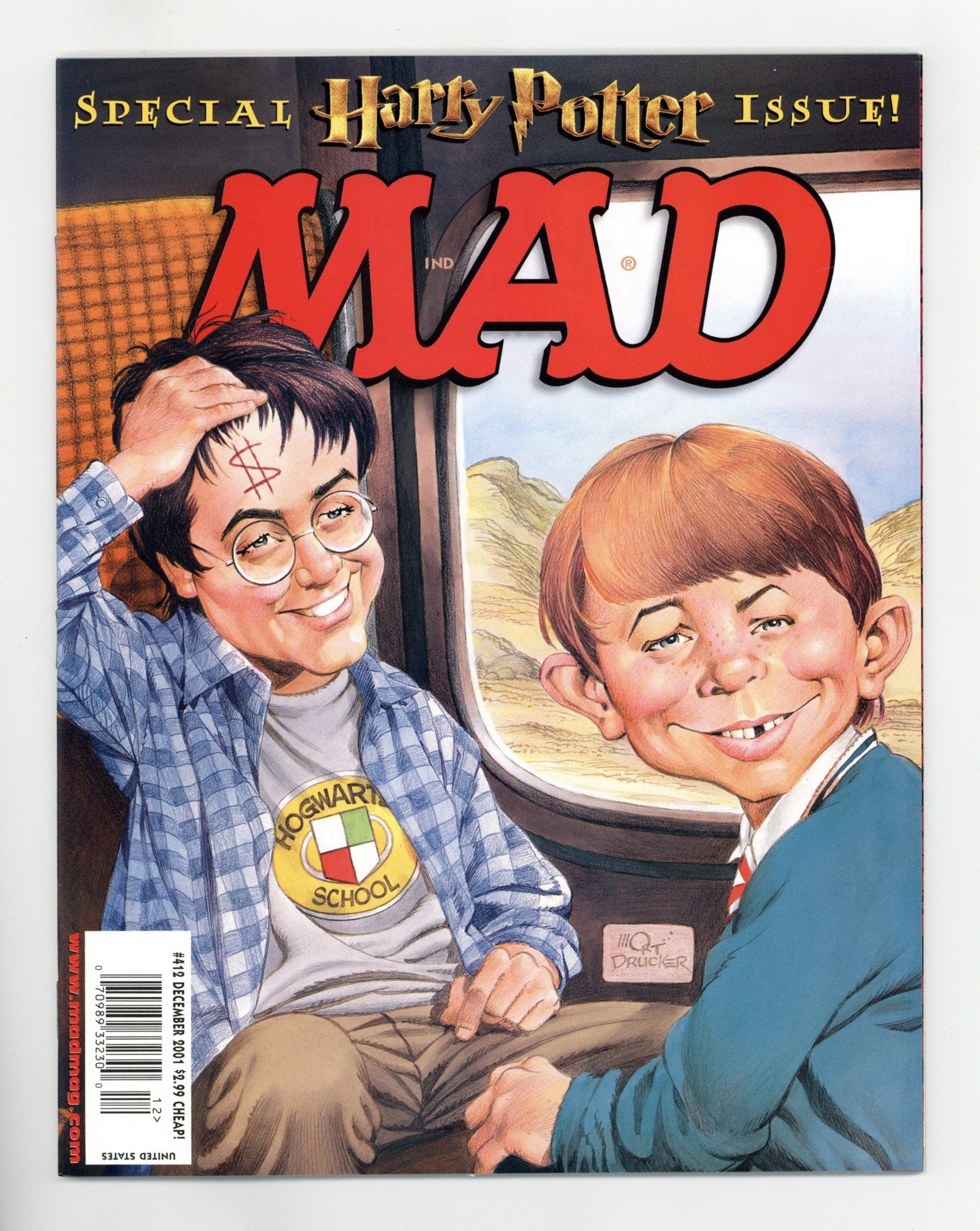 $11.50Cover by Mort Drucker. Stories and art by Al Jaffee, Dick DeBartolo, Anthony Barbieri and Bill Wray, Mike Snider, Desmond Devlin, Dave Croatto, John Caldwell, Arnie Kogen, Noah Feuer, Kevin Pope, Hermann Mejia, Rick Tulka, Angelo Torres, Tom Bunk, Peter Kuper, Dave Berg and Sergio Aragones. Mad's Harry Potter special includes a spoof of the first movie featuring art by Mort Drucker, Sergio Aragones' version of Hogwarts, and JK Rowling featured in Celebrity Cause-Of-Death Betting Odds. A parody of the horror film The Others, featuring art by Angelo Torres. Mad's takes on George W. Bush, TV sports, and workplace romances. Monroe, Lighter Side strips by Dave Berg, Marginals by Sergio Aragones, and Spy vs. Spy. Letters page includes a photo of Johnny Knoxville with Mad's "Jackass" issue, and Mad's response to the 9/11 attacks. Harry Plodder and the Sorry-Ass Story; The Mad Etiquette Guide for Modern Workplace Romances; Spy vs. Spy; President George W. Bush - The First Six Months - Official Presidential Diary; ATM Safety Rules That Banks Should Post; You May Want to Re-Think Your Gym Choice If...; The Ugghers; Snappy Answers to Stupid Questions - Special Law Enforcement Edition; The Jay Leno Class Action Lawsuit; The Lighter Side of...; Monroe &... Thanksgiving; The Mysterious Mysteries of Televised Sports; A Mad Look at Harry Potter; Mad's Celebrity Cause-Of-Death Betting Odds; Fold-In. 8.5-in. x 11-in., 48 pages, PC/PB&W. Cover price $2.99.