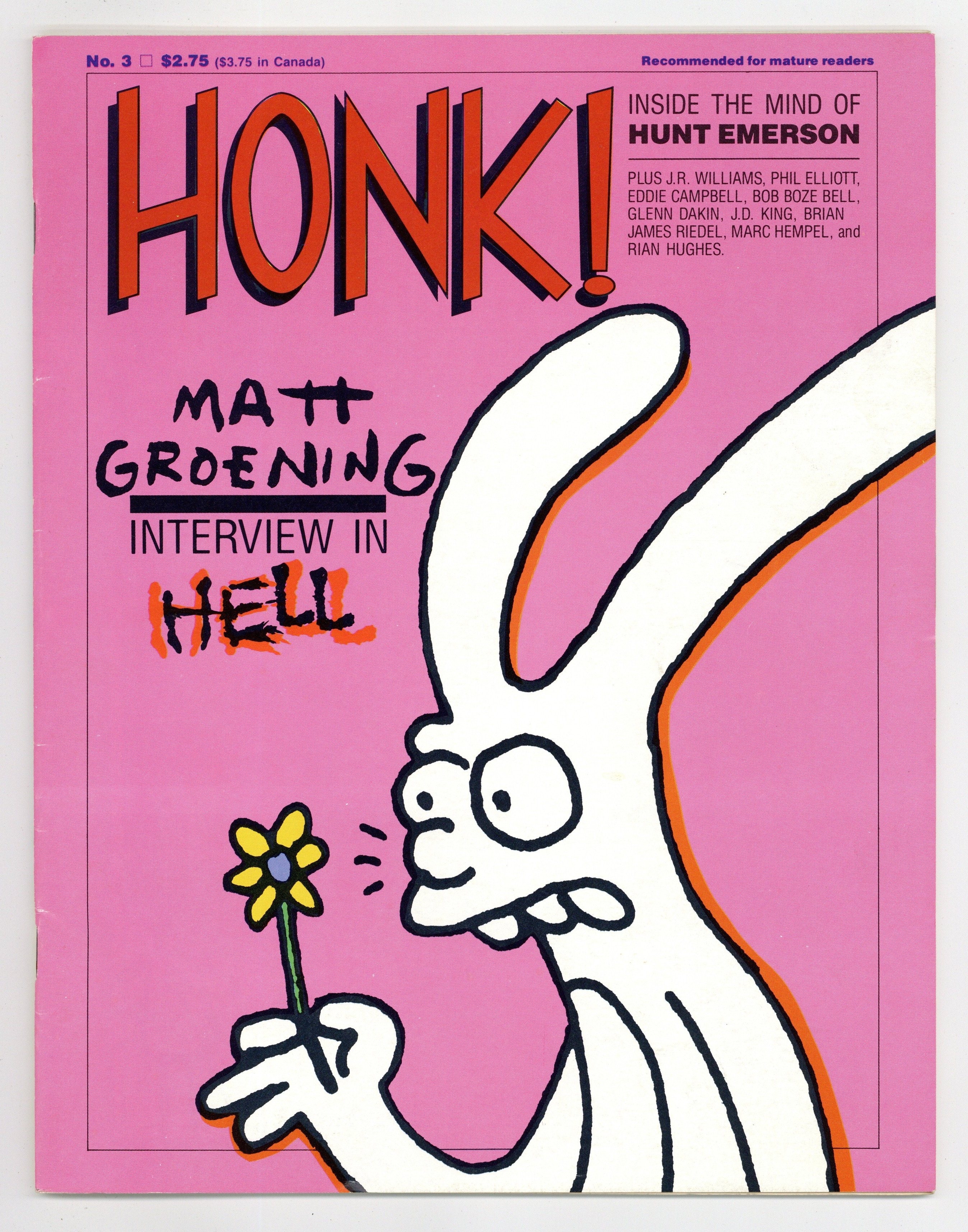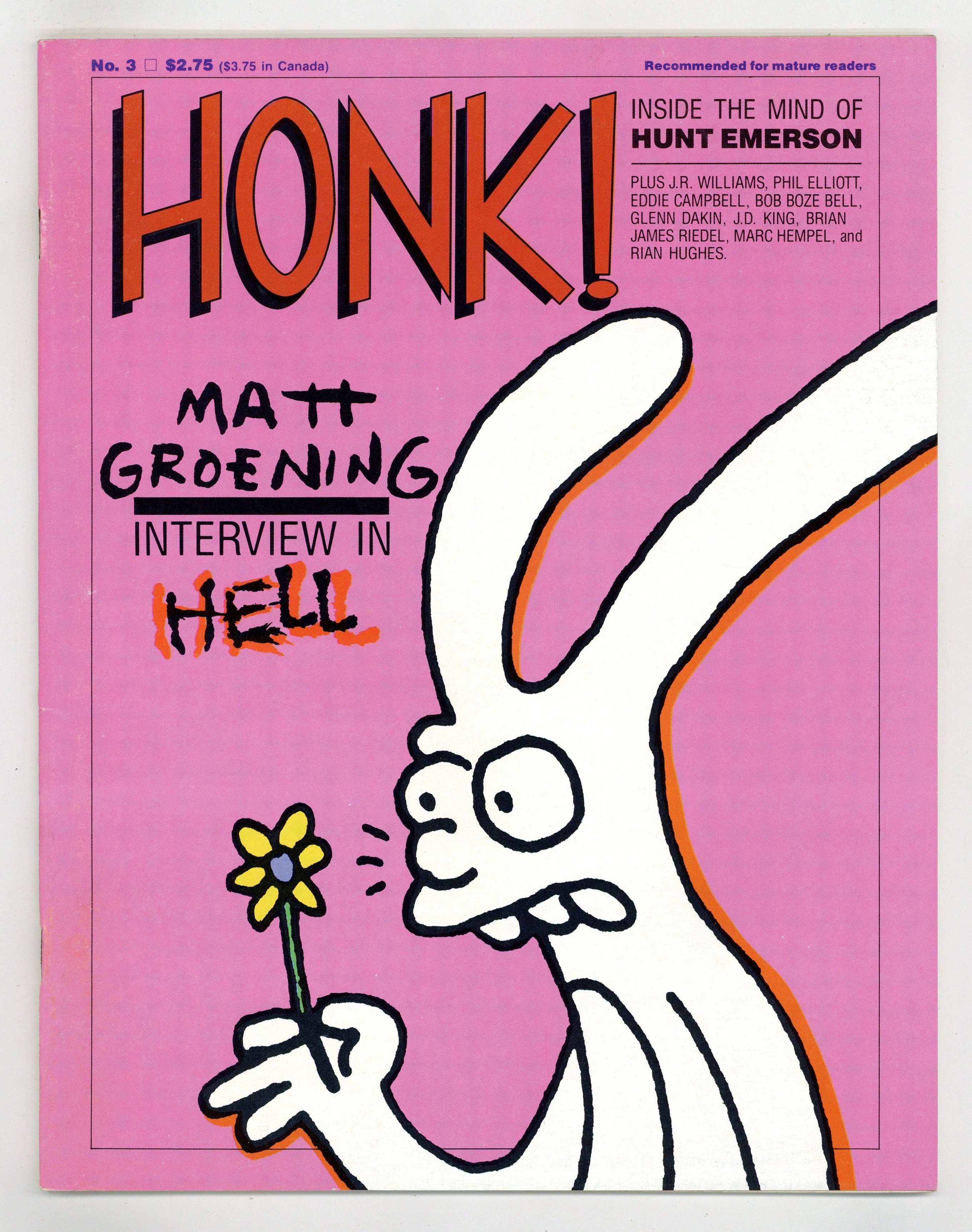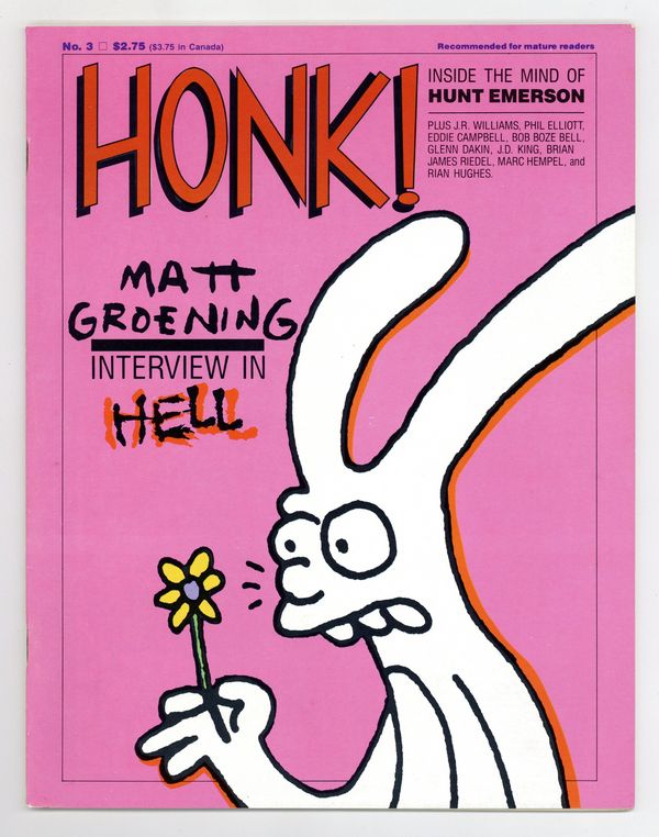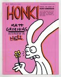 Cover art by Matt Groening. "Dark Design," script and art by Rian Hughes; The value of art. "Distraction," script and art by Marc Hempel; Is he listening? "Blinkers" starring Captain Oblivion, script and art by Glenn Dakin; A plot to blinker humanity. Untitled story, script and art by J. R. Williams; The Bad Boys become reporters. "What I Bombed On My Summer Vacation," script by Will Jacobs, Gerard Jones and Jim Zook, art by Chas Gillen; What Arab terrorist schoolchildren did on their summer holidays. "The Ballad Of Mr Ossowary," script and art by Ed Pinsent; The animals take their revenge on Mr. Ossowary. "The Wonders of Science," script and art by Phil Elliott and Eddie Campbell. "Hey! Didja Hear?!", script by Peter Bagge, art by J. D. King. "Cartoon Man Has A Science-Fiction Adventure," script and art by Marc Hempel. 52 pgs., B&W. Cover price $2.75.