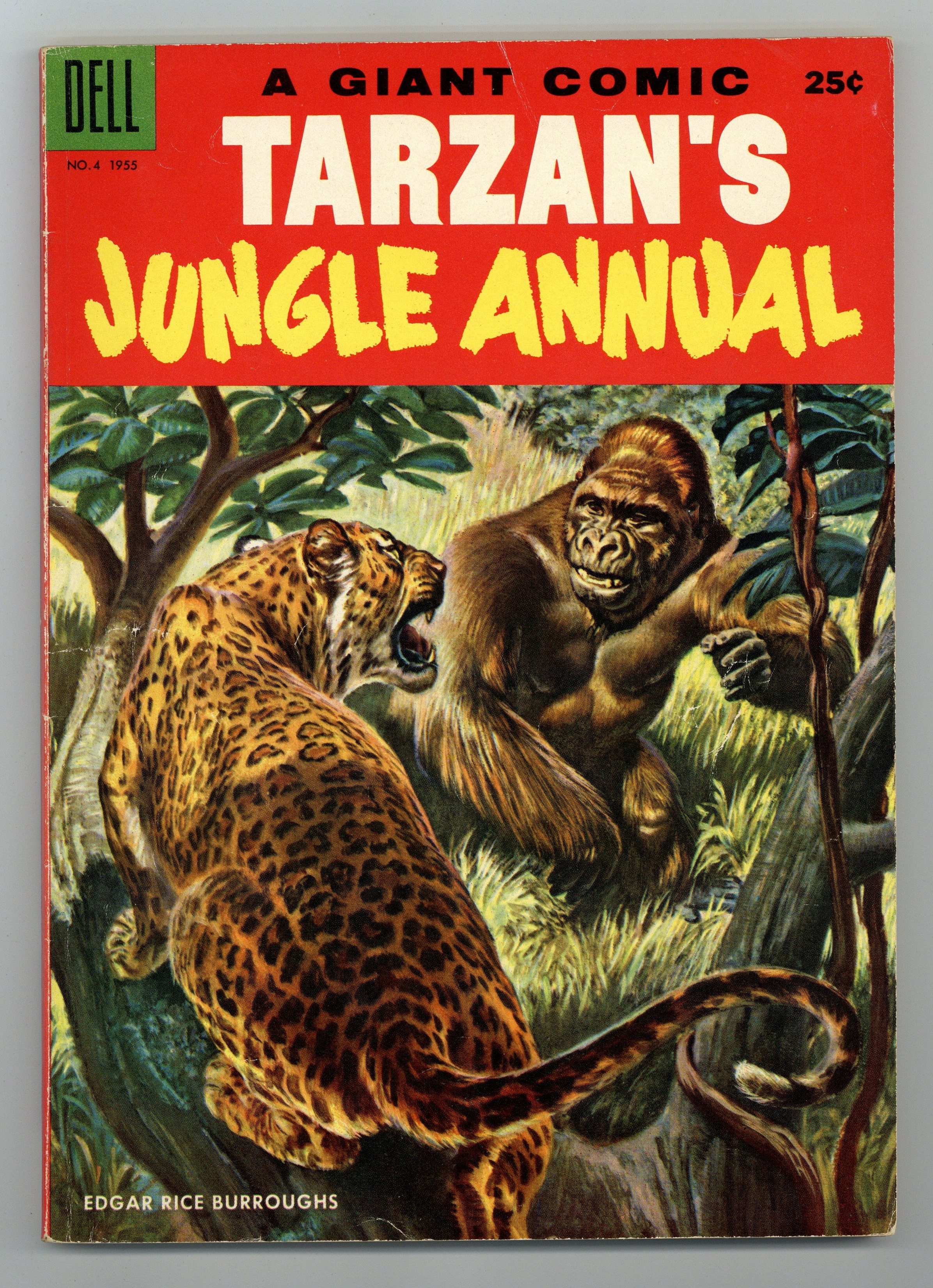 Painted cover art by Moe Gollub. The Harpy Eagle illustration by Jesse Marsh. "Tarzan Defends the Walls of Cathne," script by Gaylord Du Bois, art by Jesse Marsh; Tarzan and the white pygmies of Opar help the golden city of Cathane stop an attack by Gundak and the other apes. Tarzan Action Cut-Out activity page, art by Russ Manning. Apes and Monkeys of Tarzan's Jungle article, art by Jesse Marsh. "Boy Meets the Wild West," script by Russ Manning, pencils by Jesse Marsh, inks by Tony Sgroi; Boy and Dombie track down an explorer's two children who have gotten lost. Untitled Boy text story, art by Tony DiPaola. Hunter's Test activity page starring Boy. "Tarzan and the Reptile with a Heart," script by Gaylord Du Bois, art by Russ Manning; After crashing at an oasis, Dr. Mac tells Boy of the time Tarzan saved a baby Tyrannosaurus Rex in a lost valley and named him Wheeck. Table-Top Jungle Village activity, art by Russ Manning. "Boy and the Bark Canoe," script by Gaylord Du Bois, art by Tony Sgroi; Boy and Dombie adventure upstream into an area that has never been explored before and find a tribe of pygmies. Danger Trail activity page, art by Russ Manning. "Numa and the Man Cub," script by Gaylord Du Bois, art by Jesse Marsh; After her cubs are killed by hyenas a mother lion takes care of a small child who has wandered into the forest. The Watusi Race of Giants; The Masai Lion Killers article, art by Tony Di Paolo. "The Great Yam Feast" text story, art by Russ Manning. "Tarzan and the Guardians of the Caves," script by Gaylord Du Bois, art by Russ Manning; Tarzan helps his friend Om-At rescue his wife and son who have been taken captive by Guru. "Witch Doctor" text story. "Tarzan's Ape-English" text story, art by Tony Sgroi. Boy illustration by Jesse Marsh on inside back cover. African antelope photo by the American Museum of Natural History. 100 Pages, Full Color. Cover price $0.25.