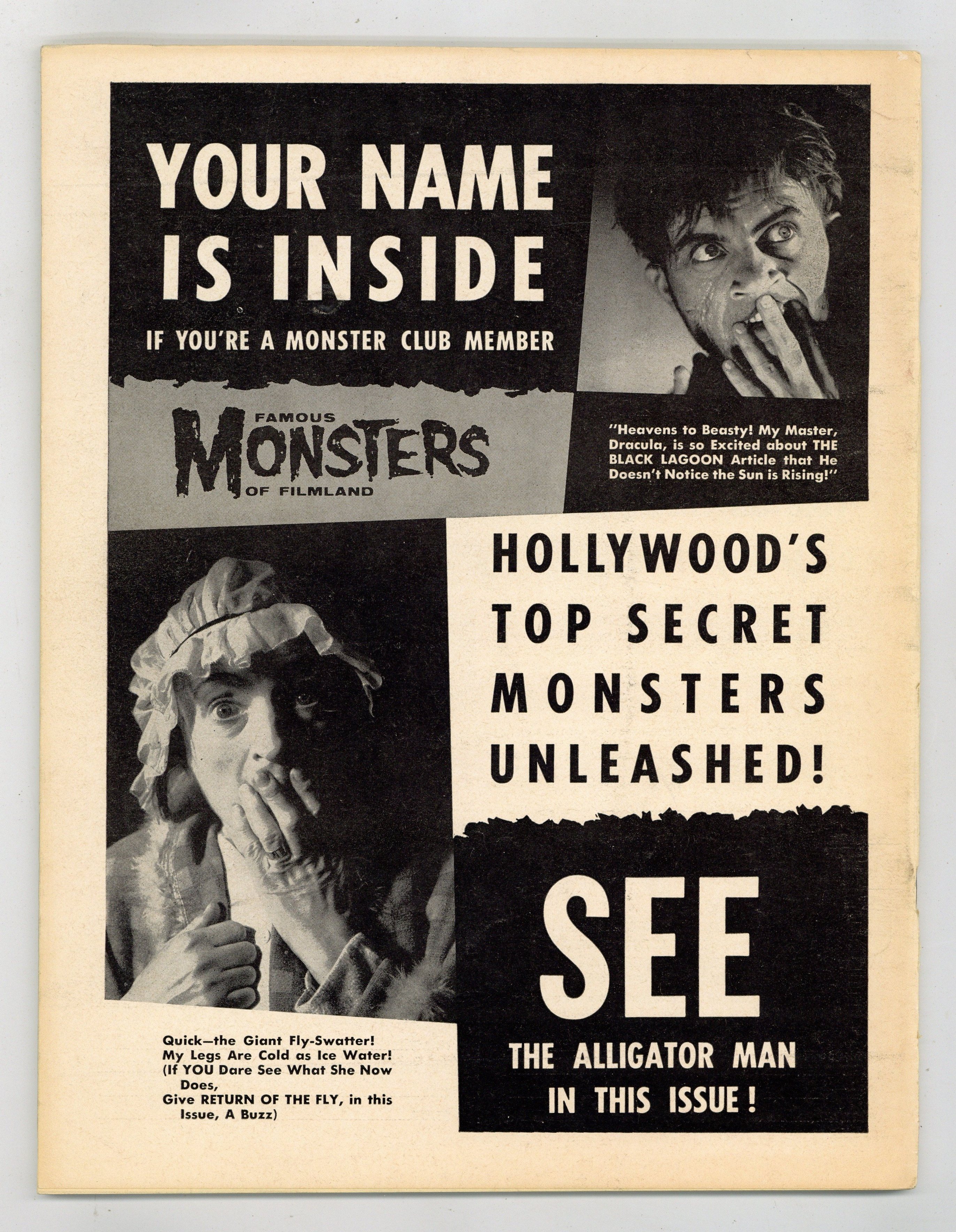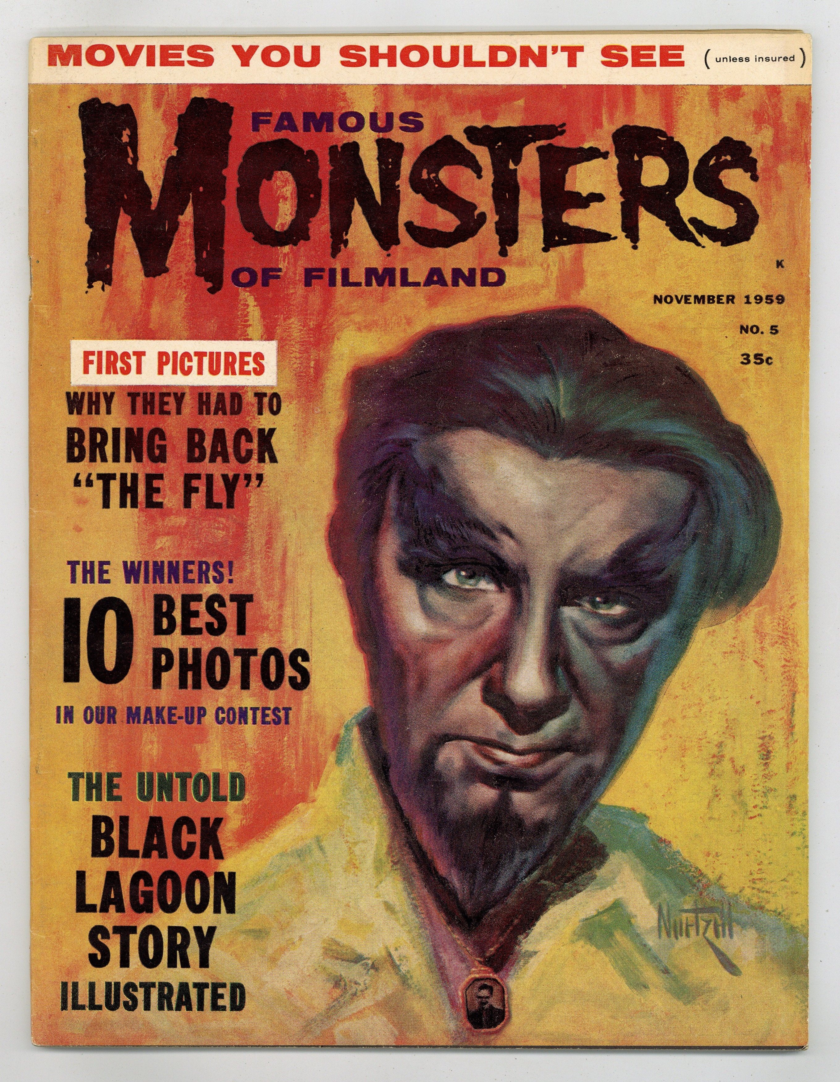 Features in this issue include: plot synopses of all three Creature films; a preview of The Alligator People; a feature on Monster greeting card artist Oz; a list of makeup contest winners; and more. Painted cover by Albert Nuetzell is of Bela Lugosi donning test makeup for his role as "Sayer of the Law" in Island of Lost Souls. Cover price $0.35.