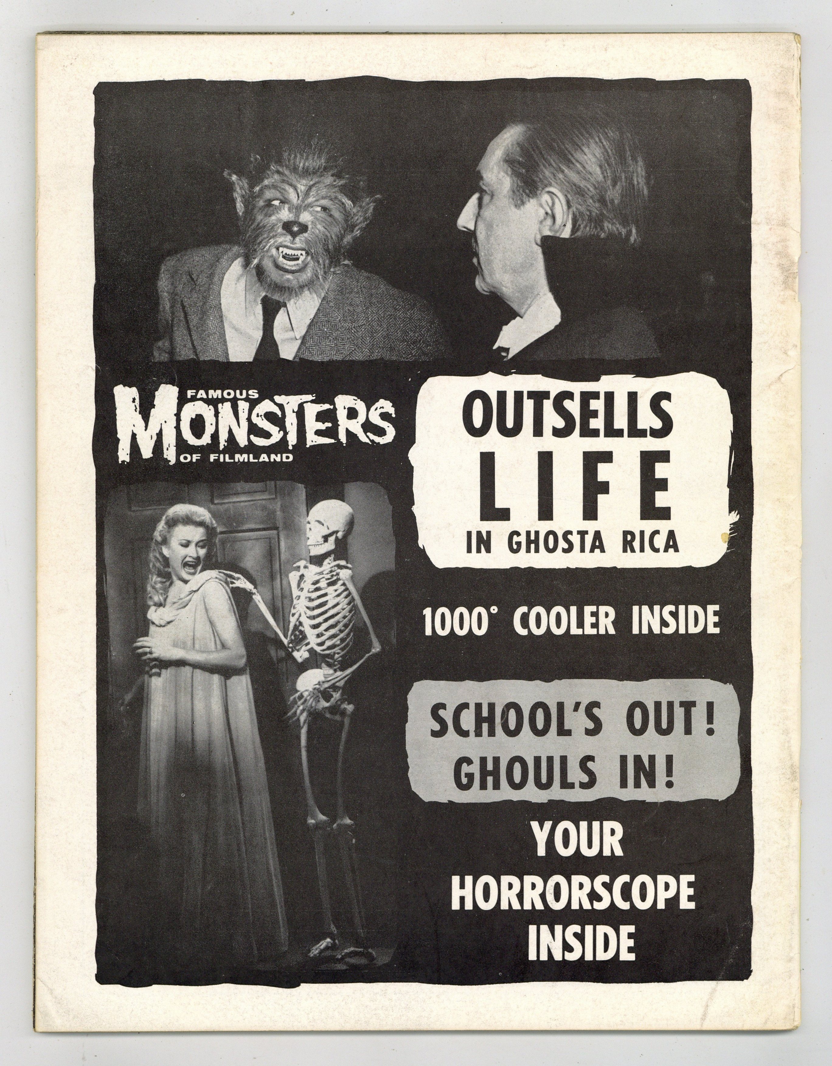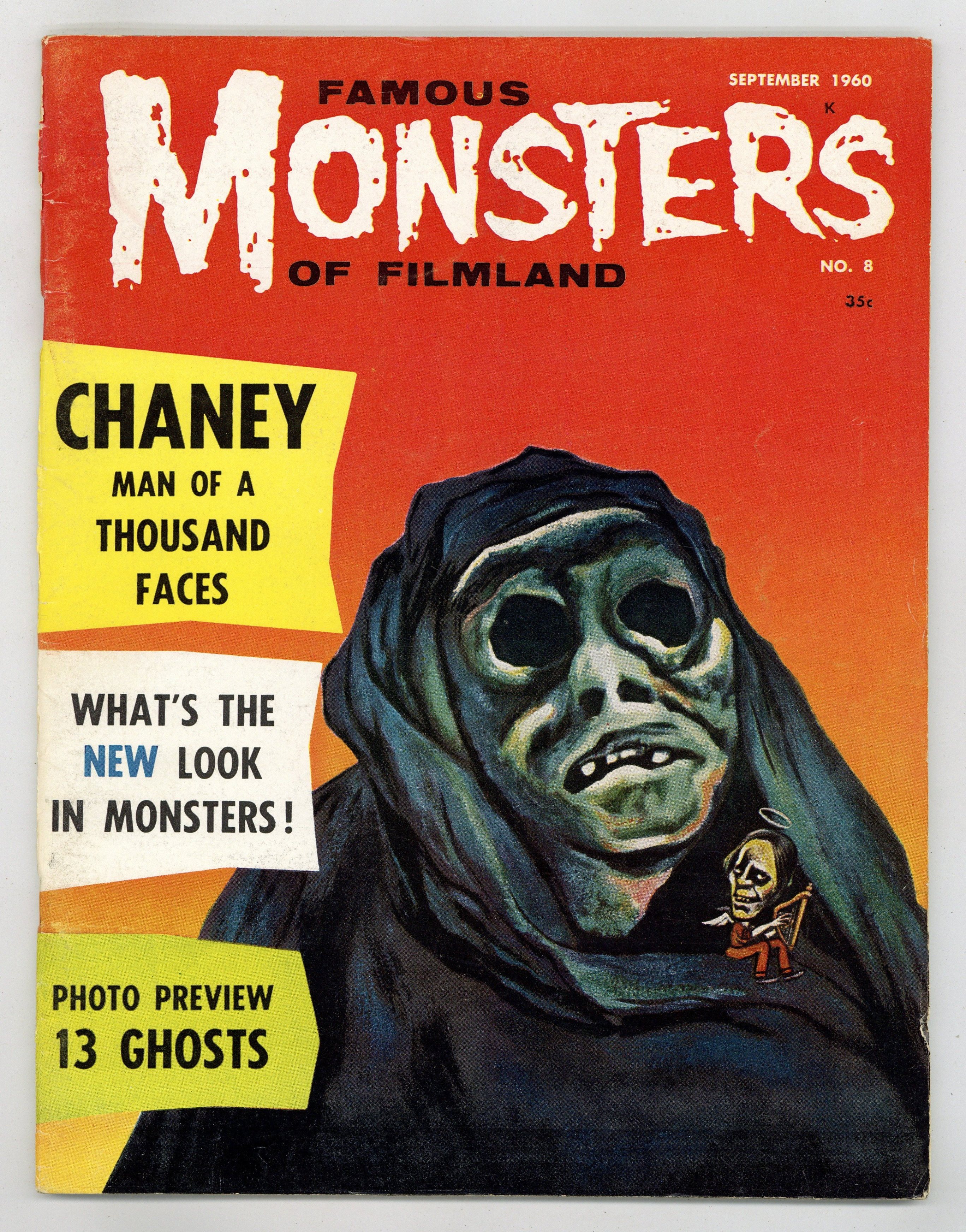 Features in this issue include: a complete Lon Chaney filmography; a profile of makeup artist Chris Robinson (entitled "The Robinson Gru-so Story"); an editorial called "The Fourth of Ghoul Eye"; and more. Painted cover by Albert Nuetzell is of a creature from William Castle's 13 Ghosts. Cover price $0.35.