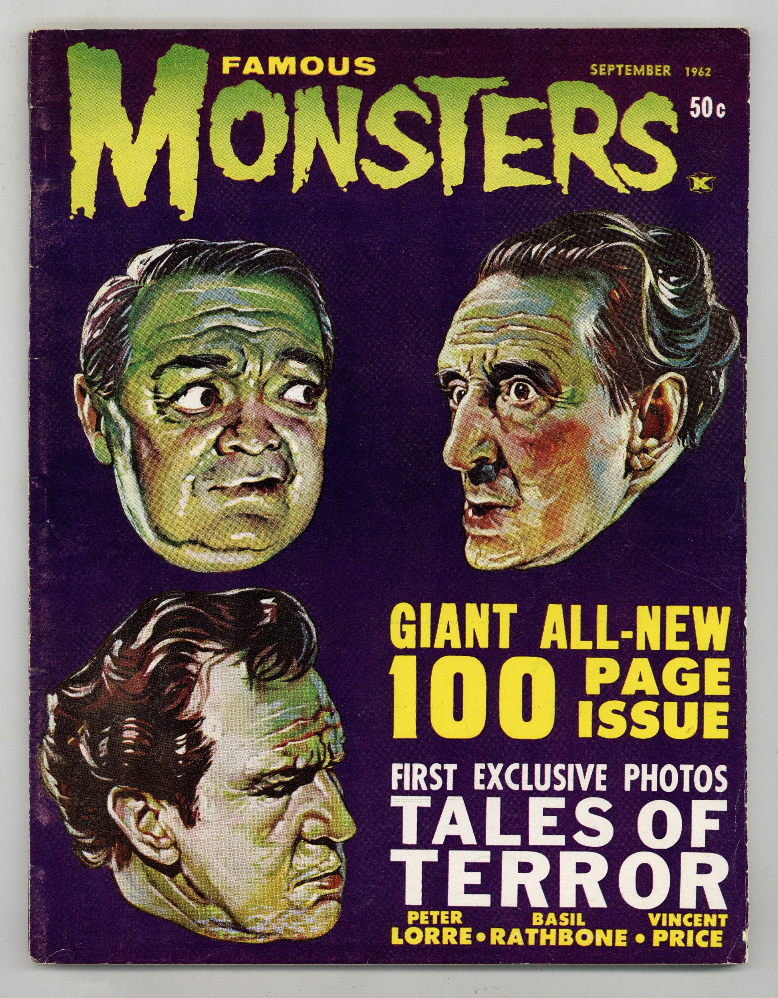 Features in this issue include: a preview and synopsis of Tales of Terror; a Dracula short story called "These Were Their Lives"; a bio of Peter Lorre; and more. Painted Basil Gogos cover depicts Peter Lorre, Basil Rathbone, and Vincent Price from Roger Corman's Tales of Terror. Cover price $0.50.