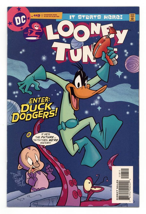 Cover by David Alvarez & Mike DeCarlo. Stories by Earl Kress. Art by Neal Sternecky & Scott McRae, David Alvarez & Mike DeCarlo and Walter Carzon & Ruben Torreiro. Will Duck Dodgers destroy the Earth? Find out in "Duck, Dodgers"! Plus, Duck Dodgers and Cadet capture two escaped evil birthday clowns in "Birthday Blowup"! And Duck Dodgers and Cadet travel to Mars to try to protect the Martian leader from Neptunian peanuts in "Mars Needs Ducks"! 40 pages, full color. Cover price $2.25.