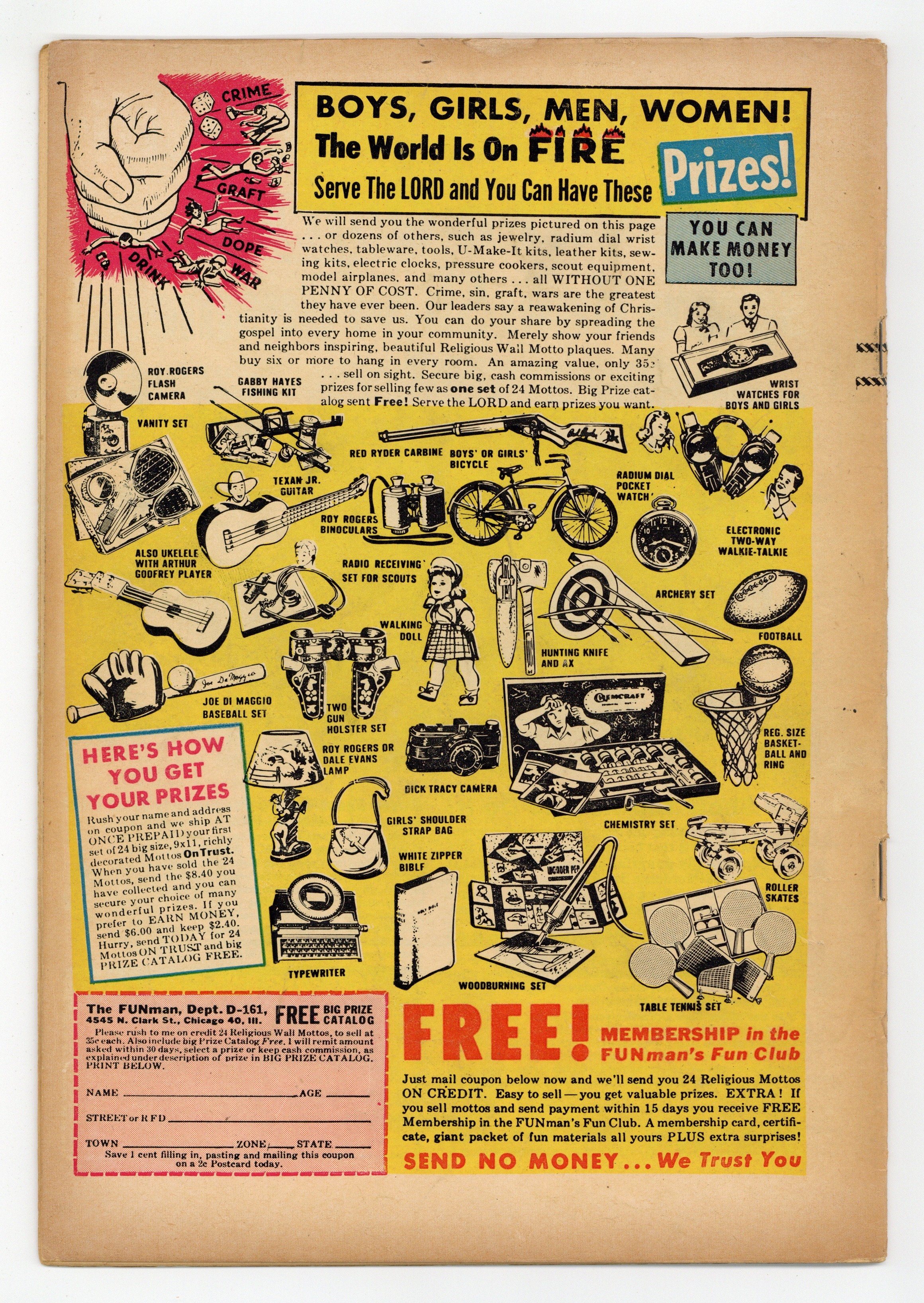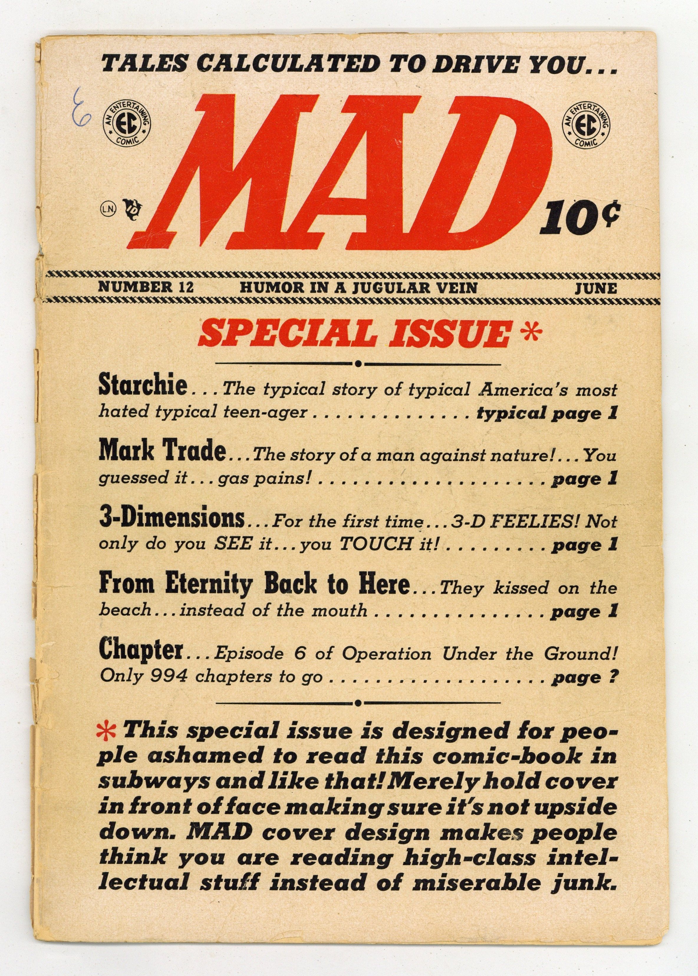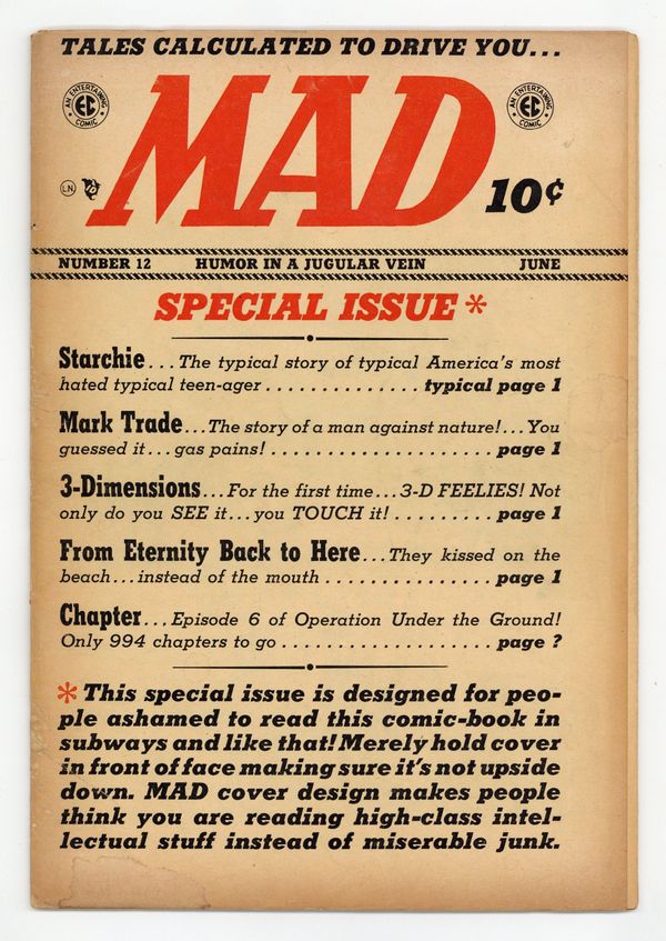 Ad for Panic magazine. "Starchie," script by Harvey Kurtzman, art by Will Elder; Bottleneck frames Starchie so that Starchie goes to prison and Bottleneck can take over the girls and rackets at the high school; Parody of Archie comic books. "From Eternity Back to Here!", script by Harvey Kurtzman, art by Bernie Krigstein; Prewitt will not fight, no matter what, and Sgt. Warden and Mrs. Homes drown on the beach; Parody of the movie "From Here to Eternity." "Operation Under-the-Ground" (Chapter 6) text story. "3-Dimensions!", script by Harvey Kurtzman, art by Wally Wood; A phony description of how 3-D comics are made and a look at what can go wrong. "Mark Trade!", script by Harvey Kurtzman, art by Jack Davis; Parody of the comic strip Mark Trail, finding Mark sick and tired of nature. 36 pgs., full color. $0.10. Cover price $0.10.