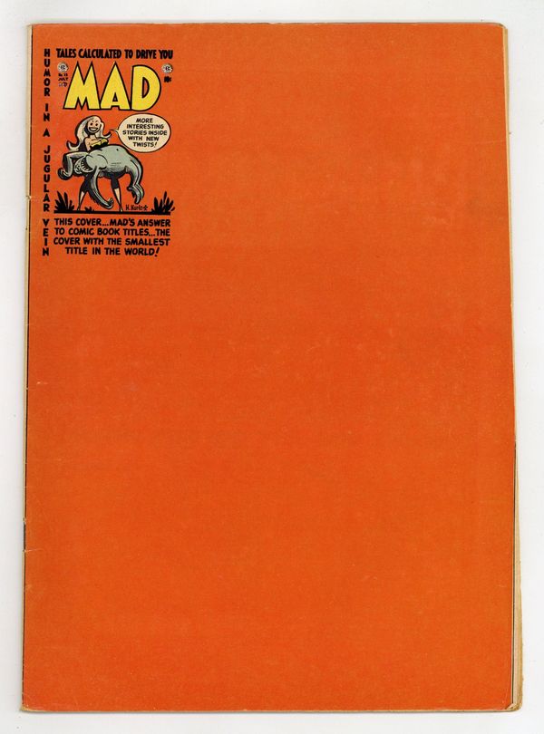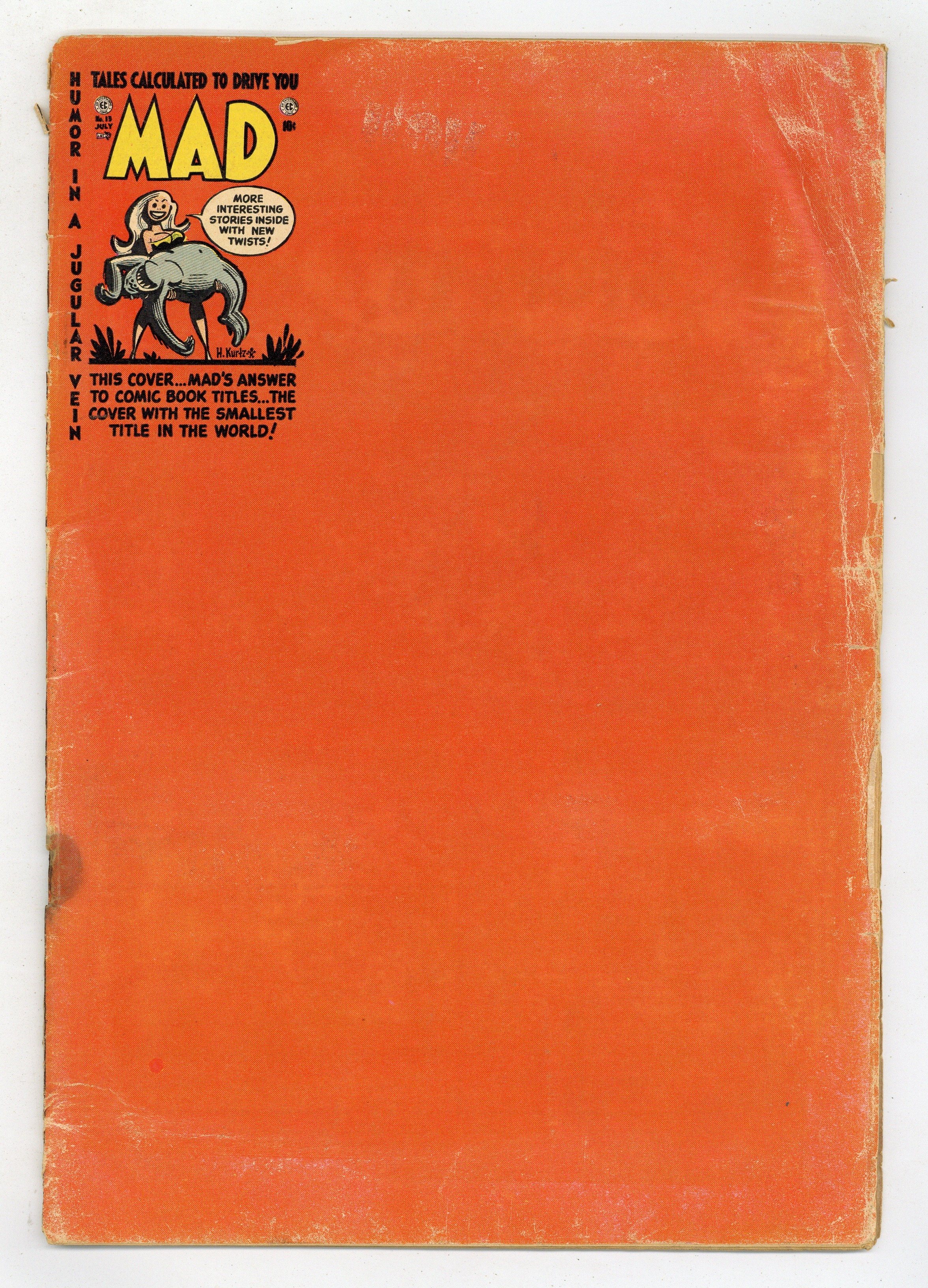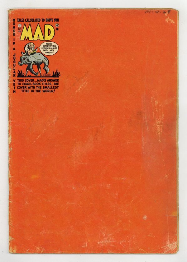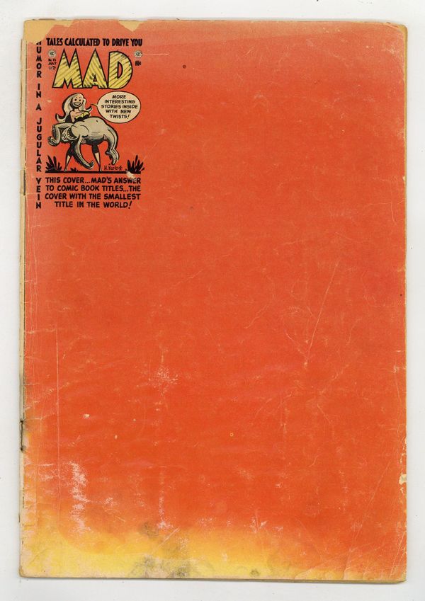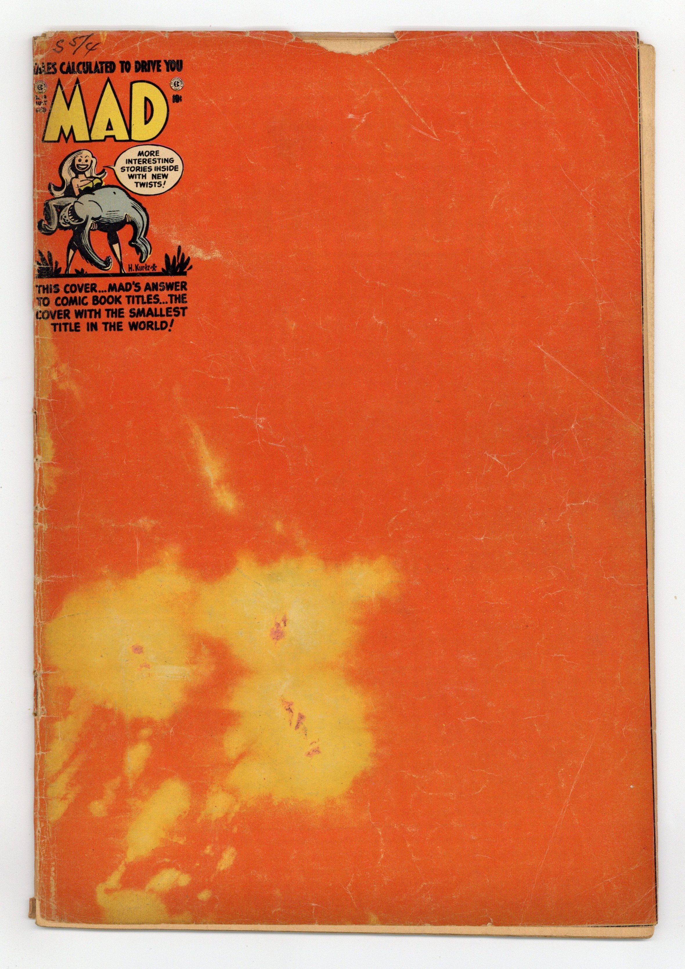 Cover by Harvey Kurtzman. Ad for Panic magazine. "Prince Violent!", script by Harvey Kurtzman, art by Wally Wood; Prince Violent pursues Maid Alota, hacking many a foe before meeting her; Parody of the Prince Valiant comic strip. "Book! Movie!", script by Harvey Kurtzman, art by Jack Davis; Parallel stories point out the differences between modern novels and modern movies. E. C. Fan-Addict Club! ad. "Baby Quips!", script by Harvey Kurtzman; Photographic portraits with humorous captions. "Robinson Crusoe!", script by Harvey Kurtzman, art by Will Elder; A parody of the novel Robinson Crusoe. 36 pgs., full color. $0.10. Cover price $0.10.