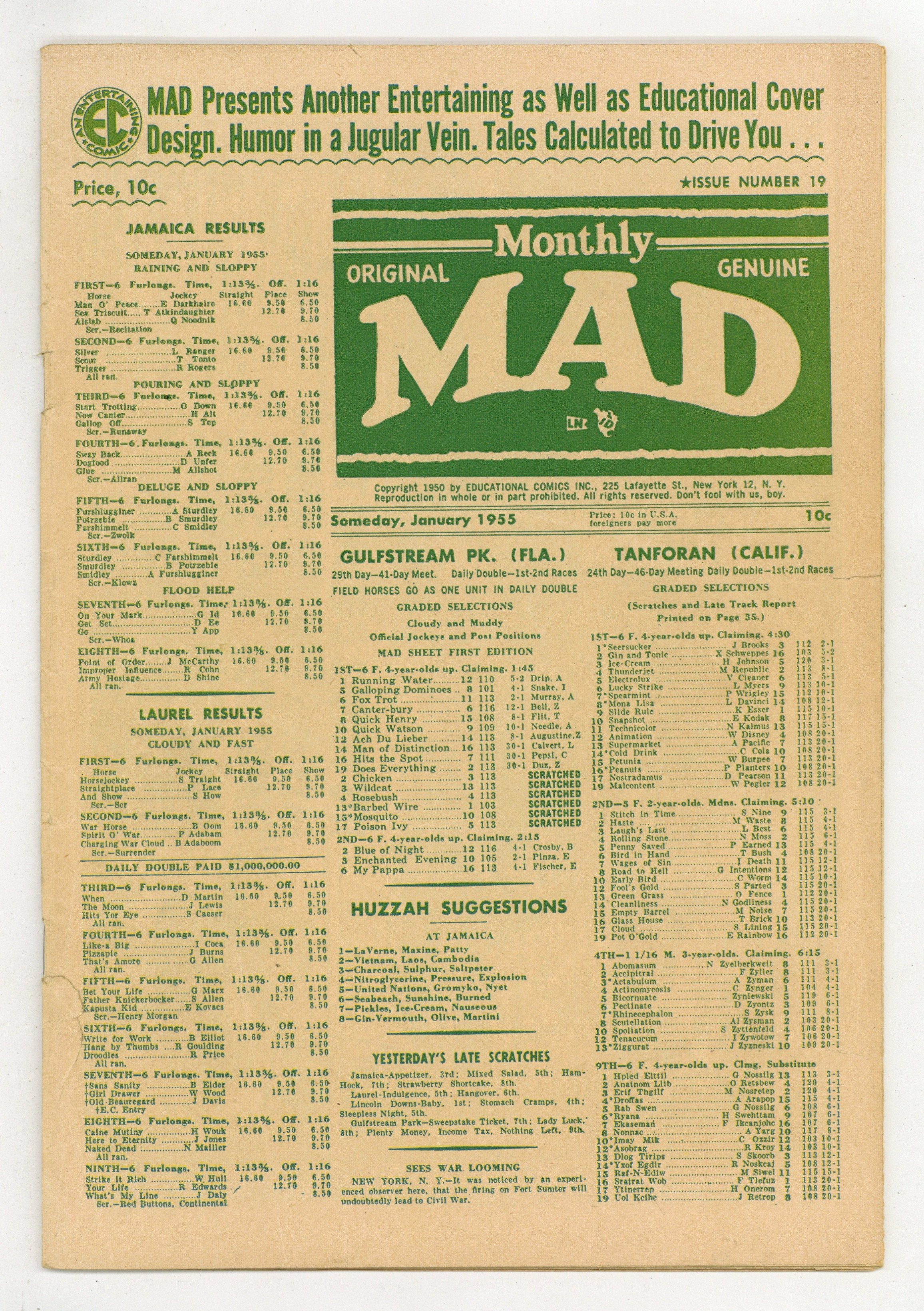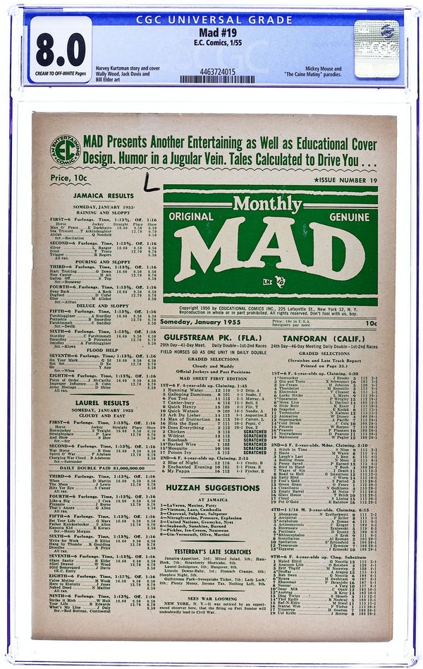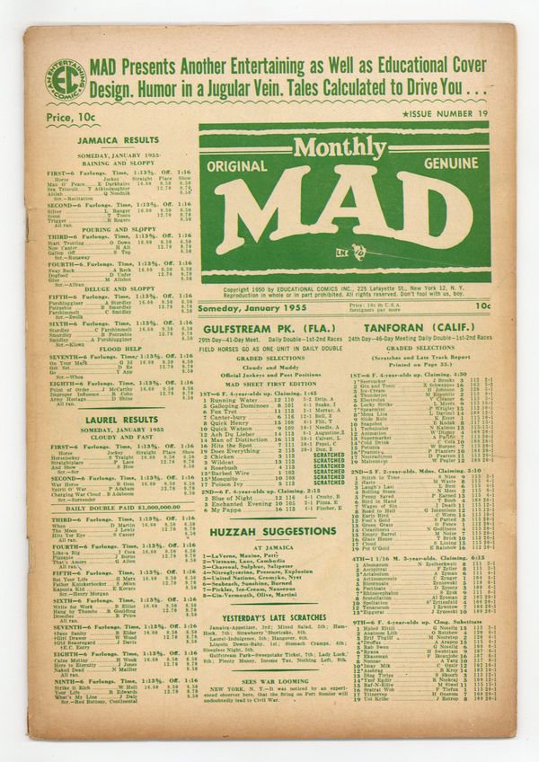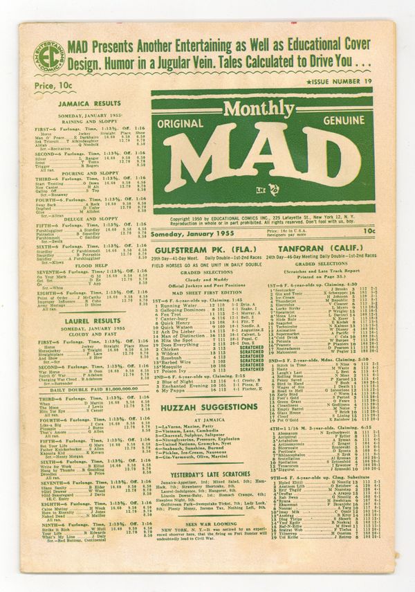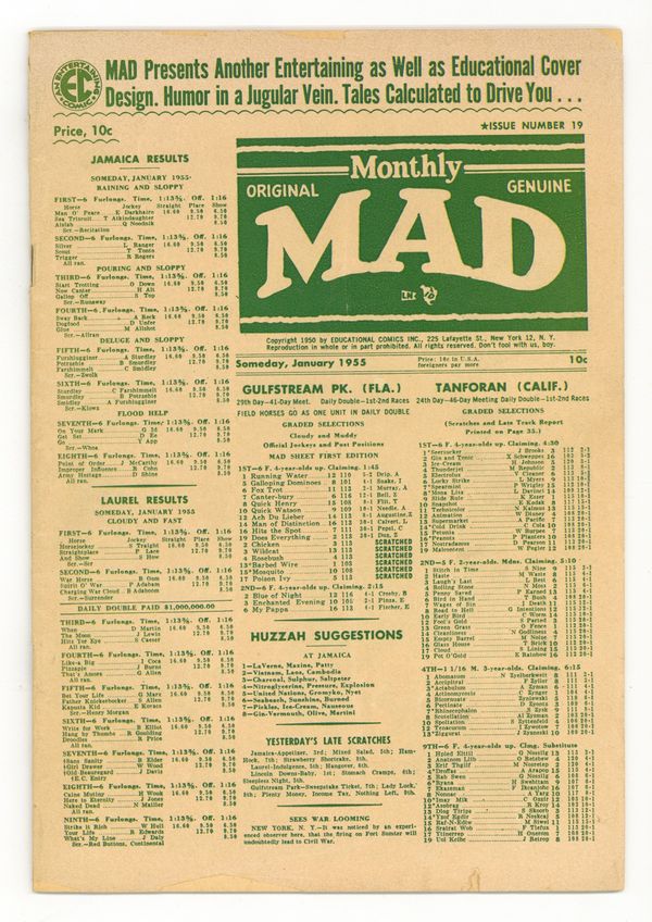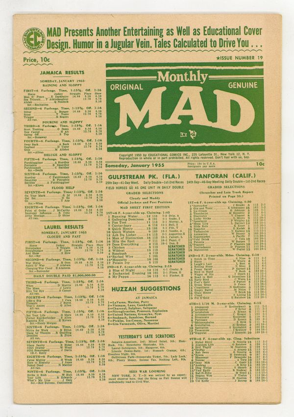 Ad for Panic comic book. "Mickey Rodent!", script by Harvey Kurtzman, art by Will Elder; Mickey tricks Darnold into a zoo to get rid of him; Parody of Walt Disney animated cartoons. "Supermarkets!", script by Harvey Kurtzman, art by Jack Davis; A look at America's obsession with supermarkets, as the Sturdley's survive the rigors of shopping. "Puzzle Pages!", script by Harvey Kurtzman, art by Will Elder; Parody of comic book activity pages. Ad for Piracy comic book. "The Cane Mutiny!", script by Harvey Kurtzman, art by Wally Wood; Parody of the movie "The Caine Mutiny." 36 pgs., full color. $0.10. Cover price $0.10.